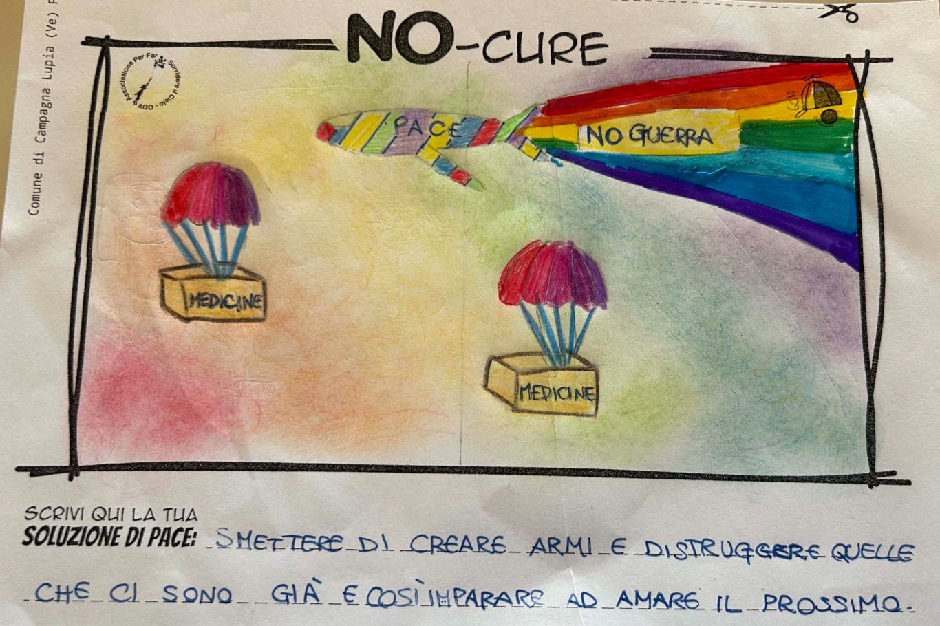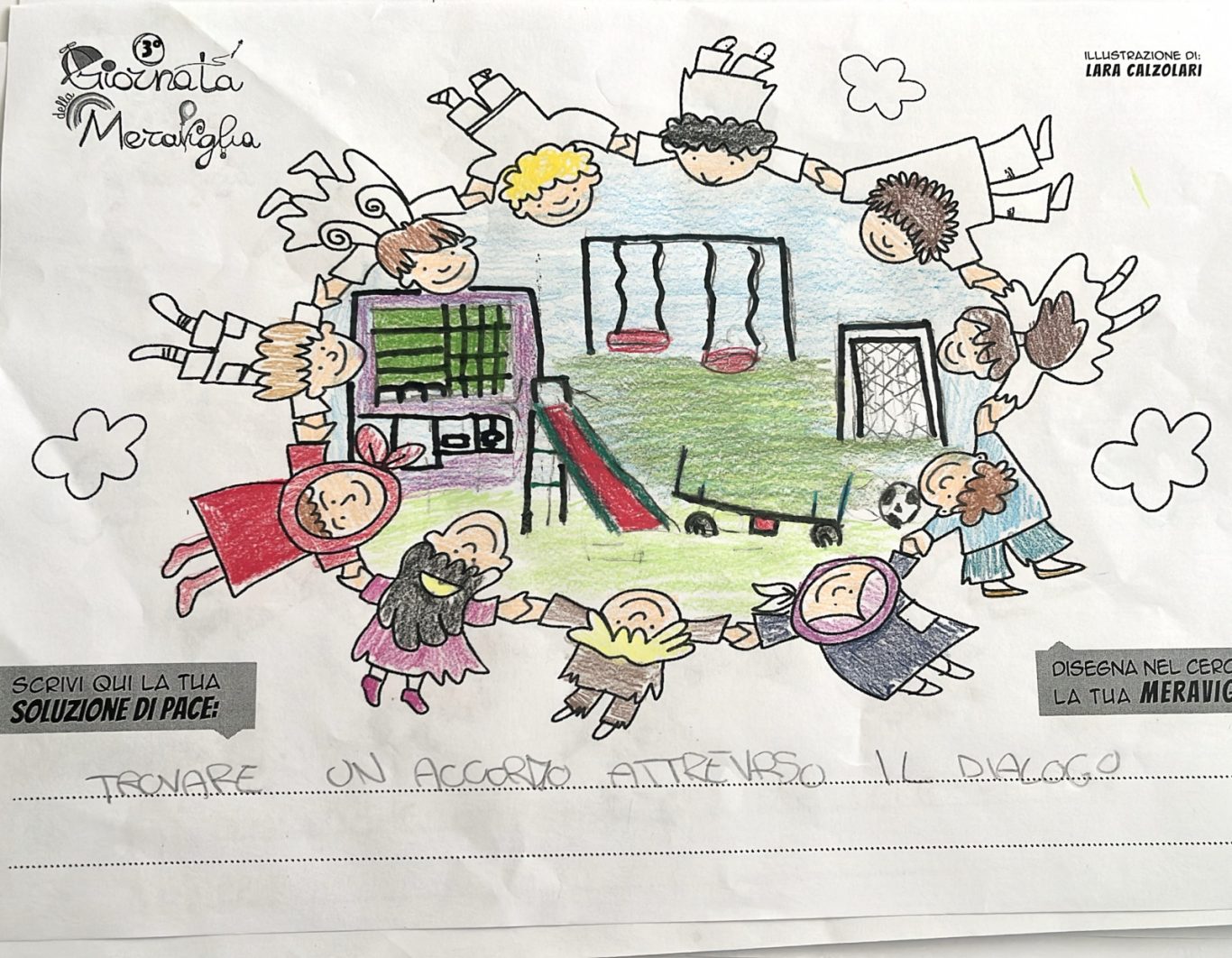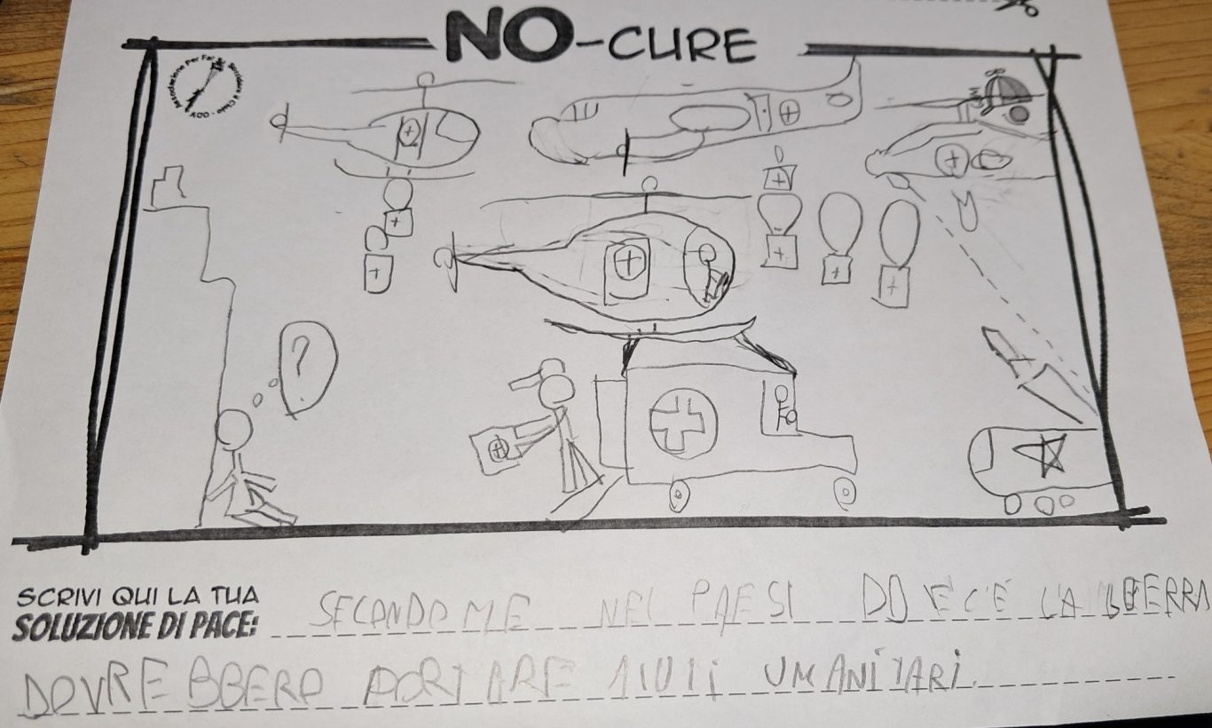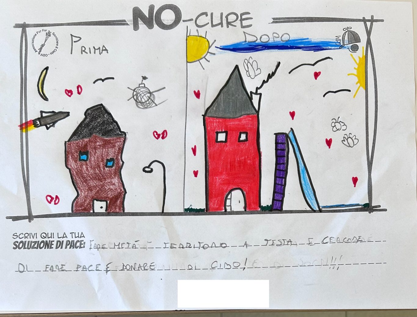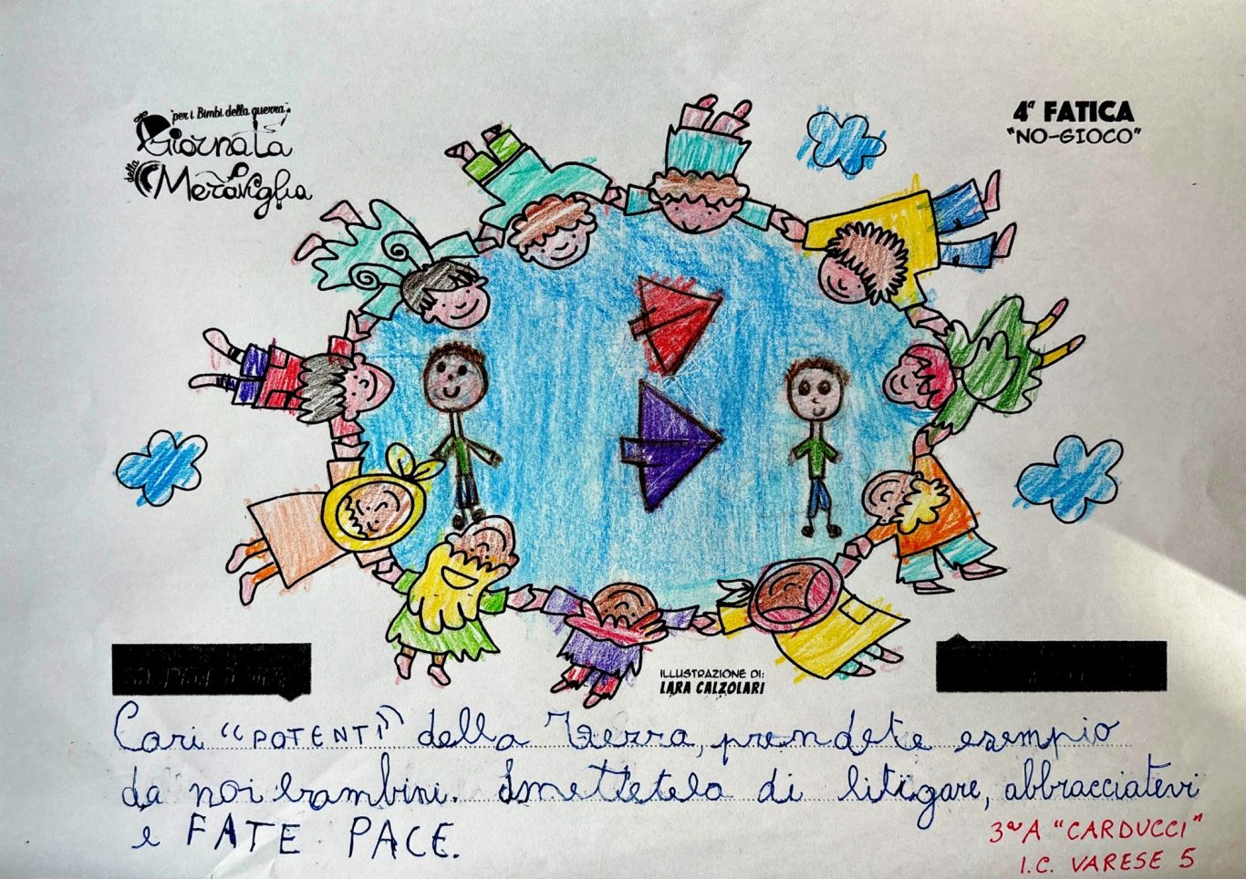 L’opera di sensibilizzazione si si esprime concretamente con la creazione di un DISEGNO DELLA MERAVIGLIA che andrà ad aiutare una delle 12 fatiche. Allo stesso modo chiederemo a tutti i partecipanti di andare a scrivere una “Soluzione di Pace” che possa aiutare anch’essa una delle 12 fatiche dei Bambini della guerra.