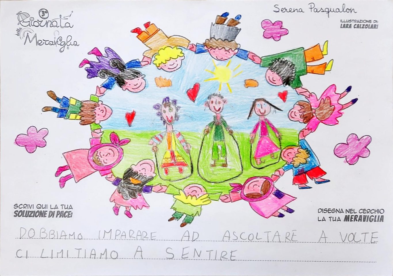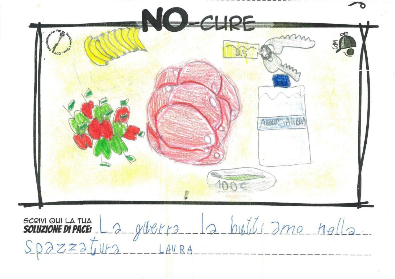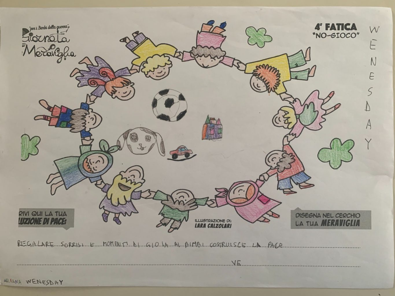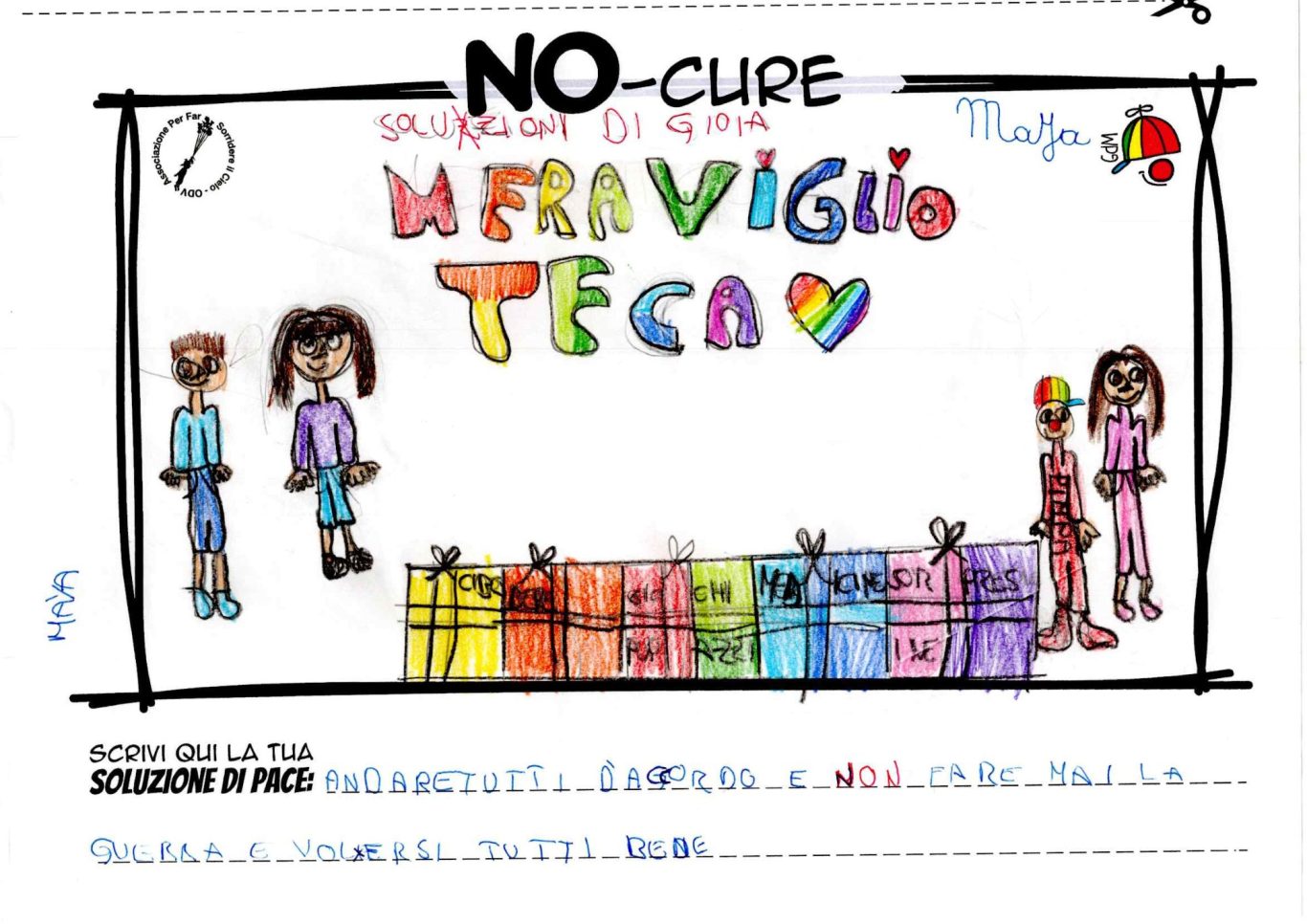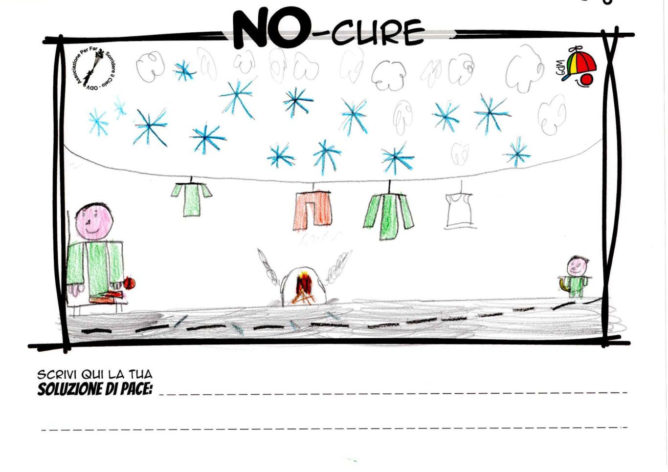 L’opera di sensibilizzazione si si esprime concretamente con la creazione di un DISEGNO DELLA MERAVIGLIA che andrà ad aiutare una delle 12 fatiche. Allo stesso modo chiederemo a tutti i partecipanti di andare a scrivere una “Soluzione di Pace” che possa aiutare anch’essa una delle 12 fatiche dei Bambini della guerra.
