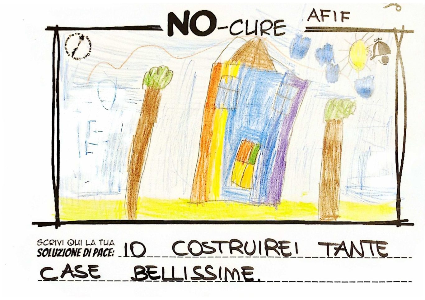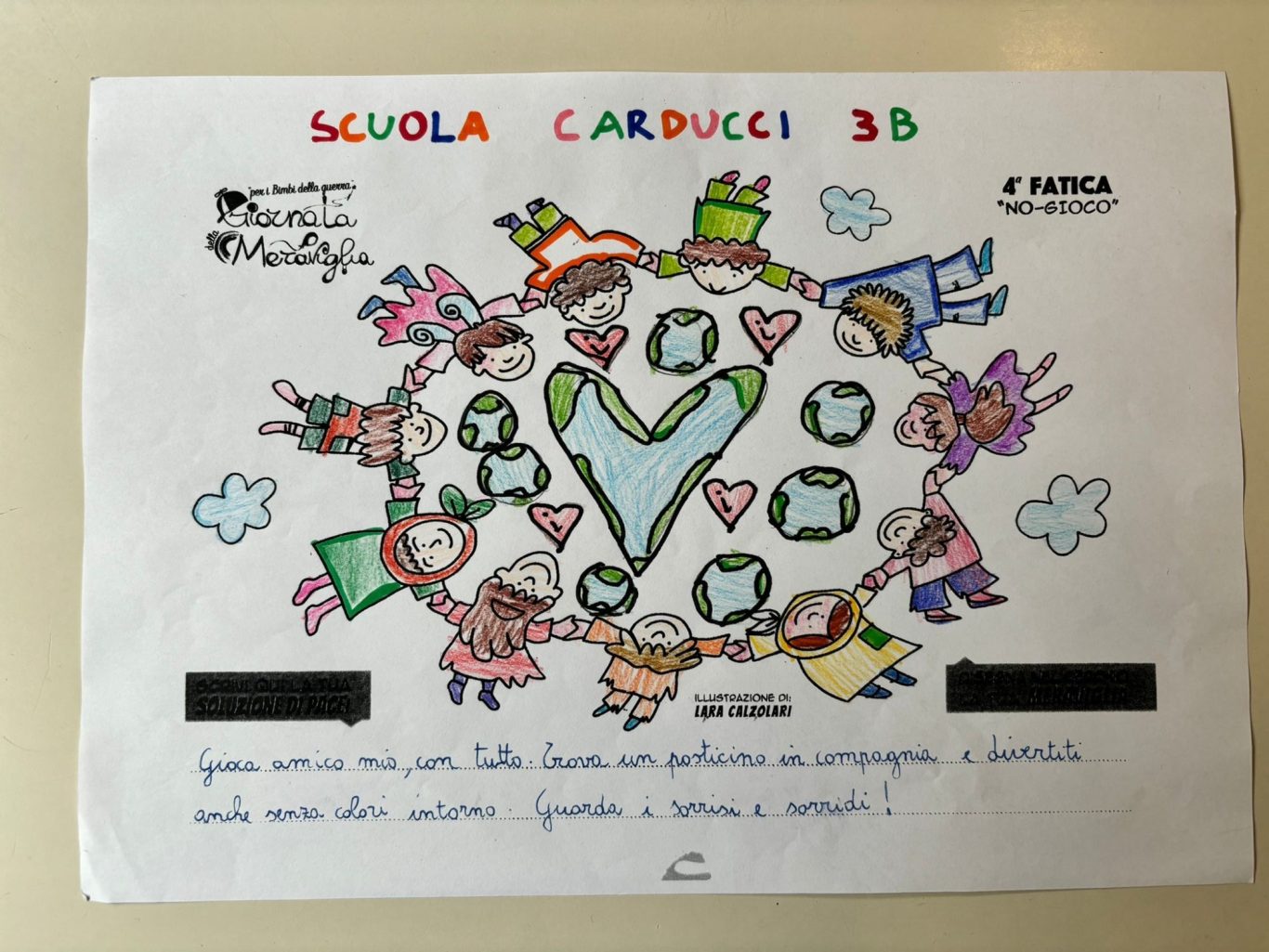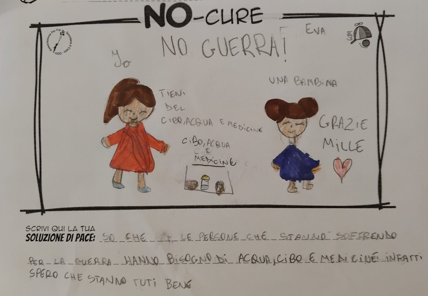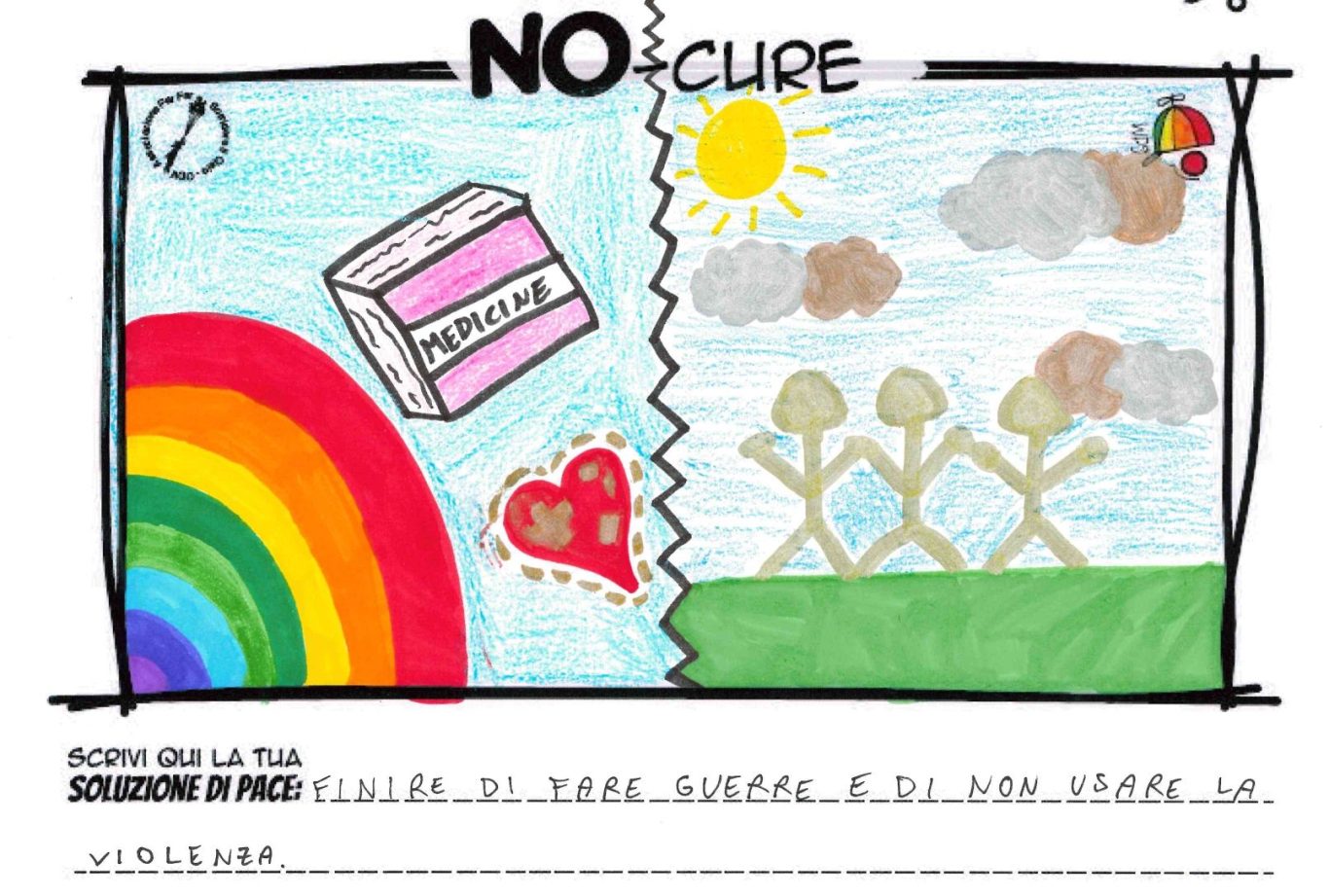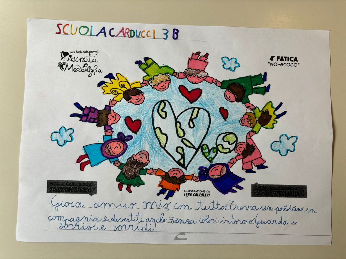L’opera di sensibilizzazione si si esprime concretamente con la creazione di un DISEGNO DELLA MERAVIGLIA che andrà ad aiutare una delle 12 fatiche. Allo stesso modo chiederemo a tutti i partecipanti di andare a scrivere una “Soluzione di Pace” che possa aiutare anch’essa una delle 12 fatiche dei Bambini della guerra.