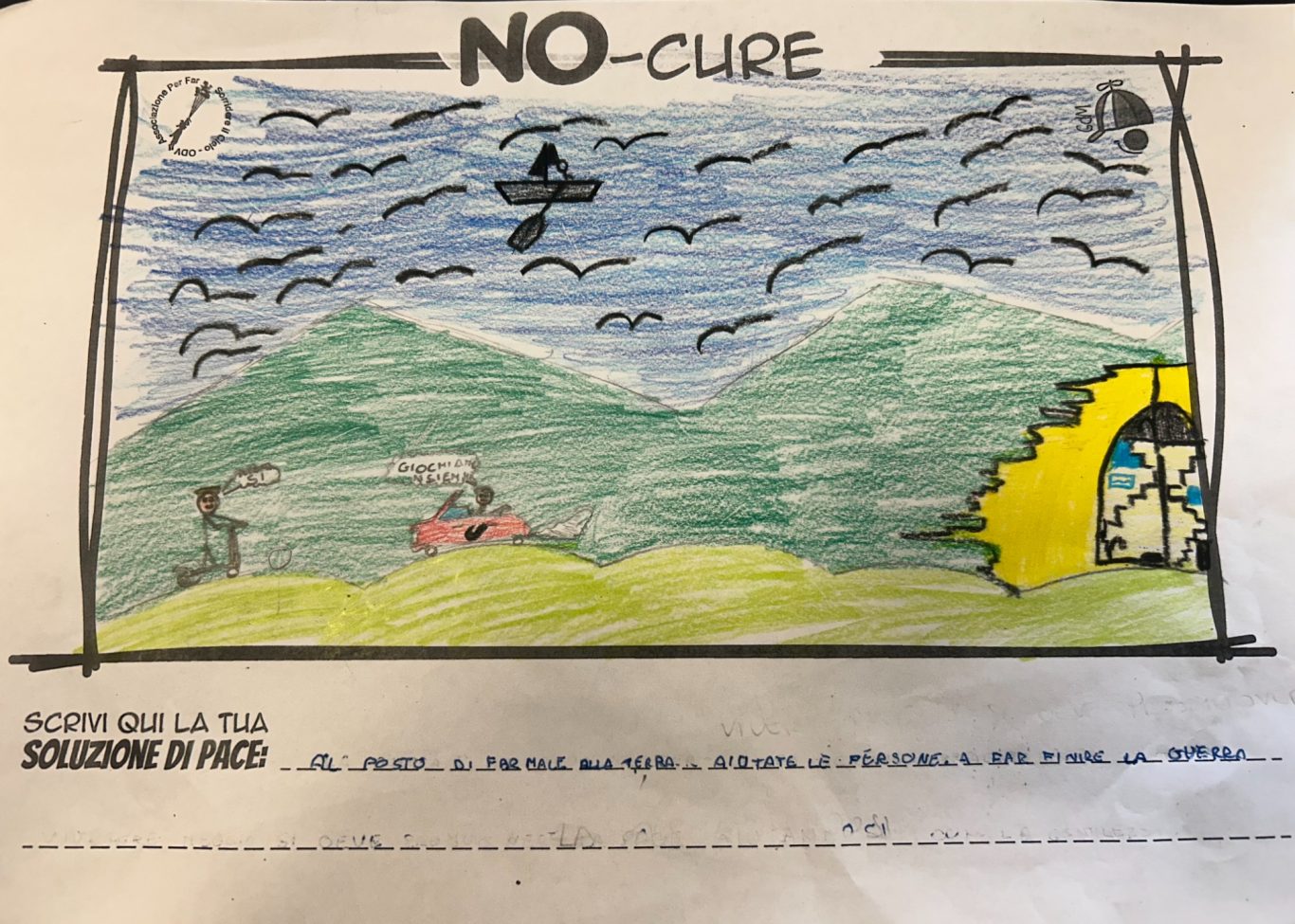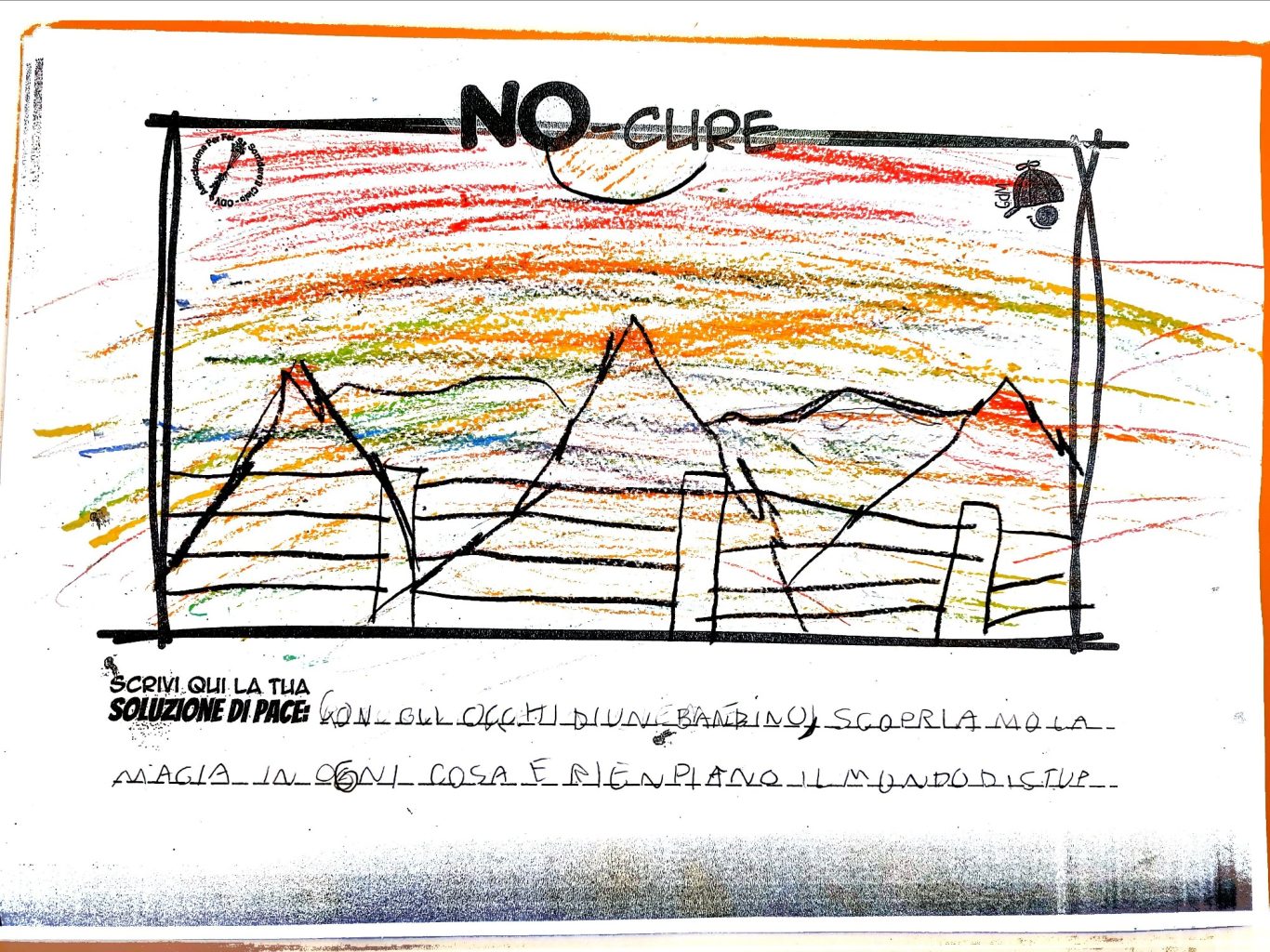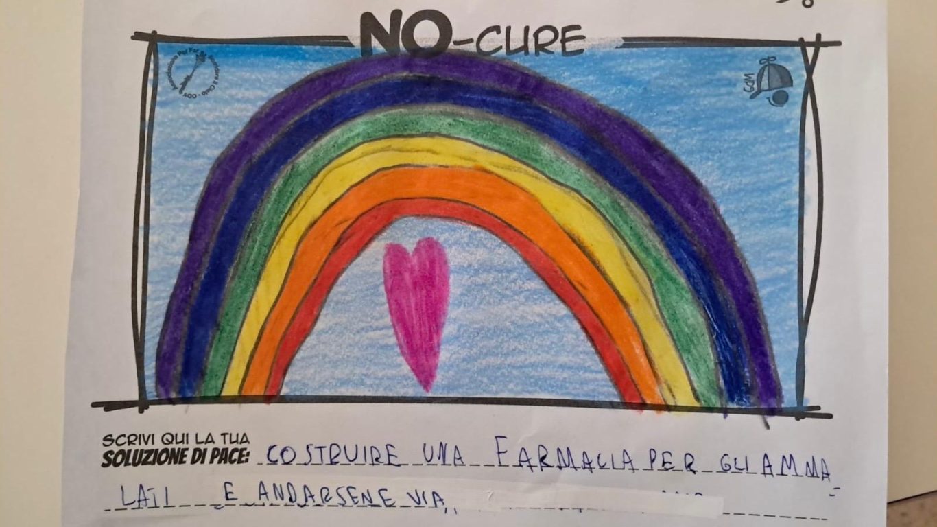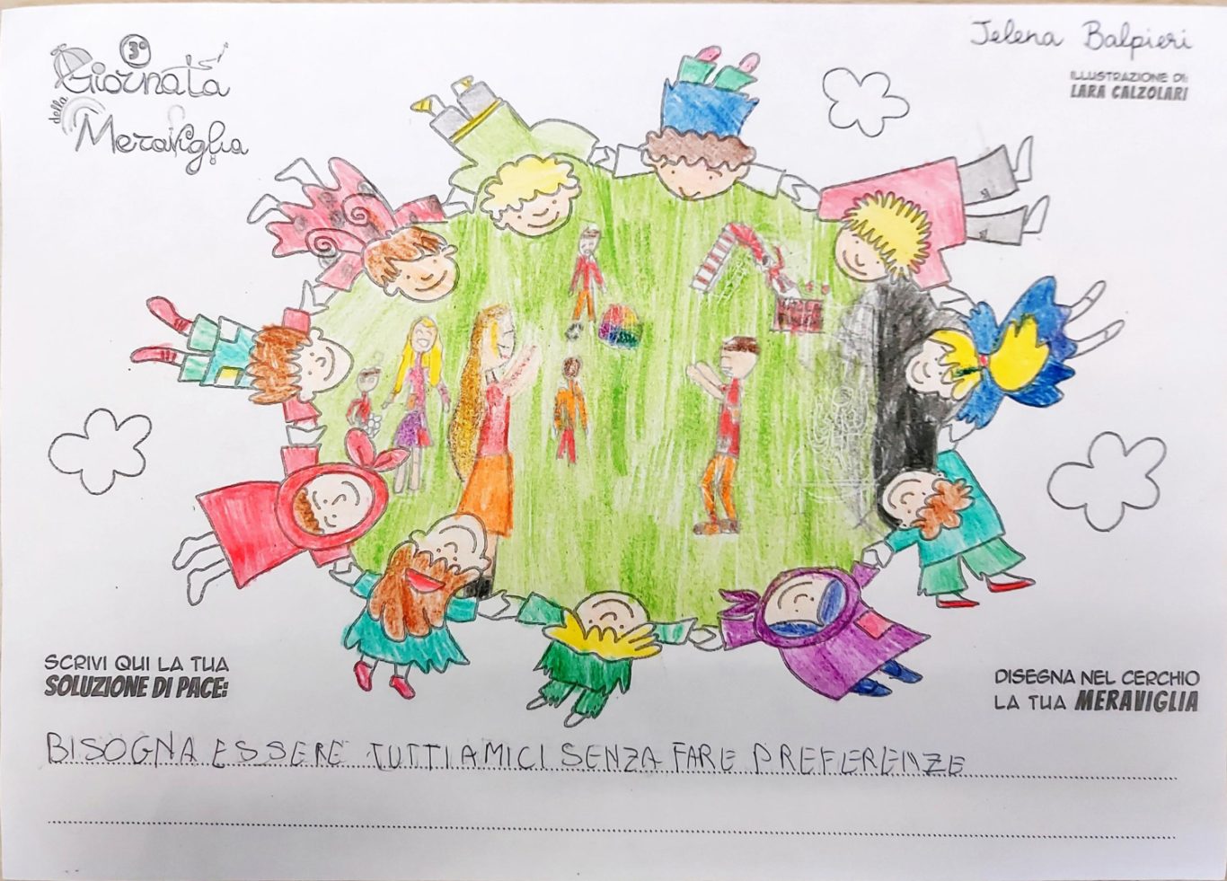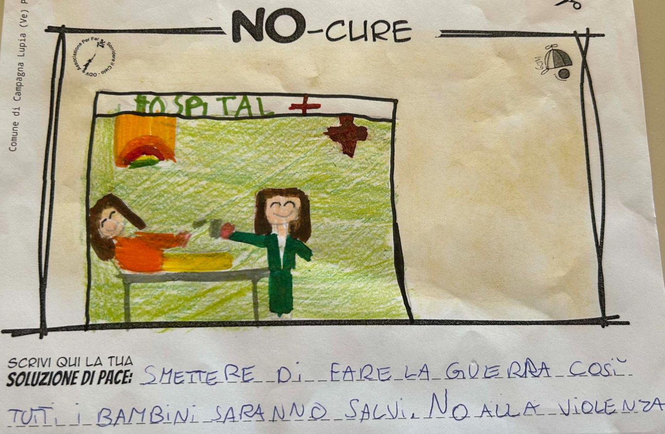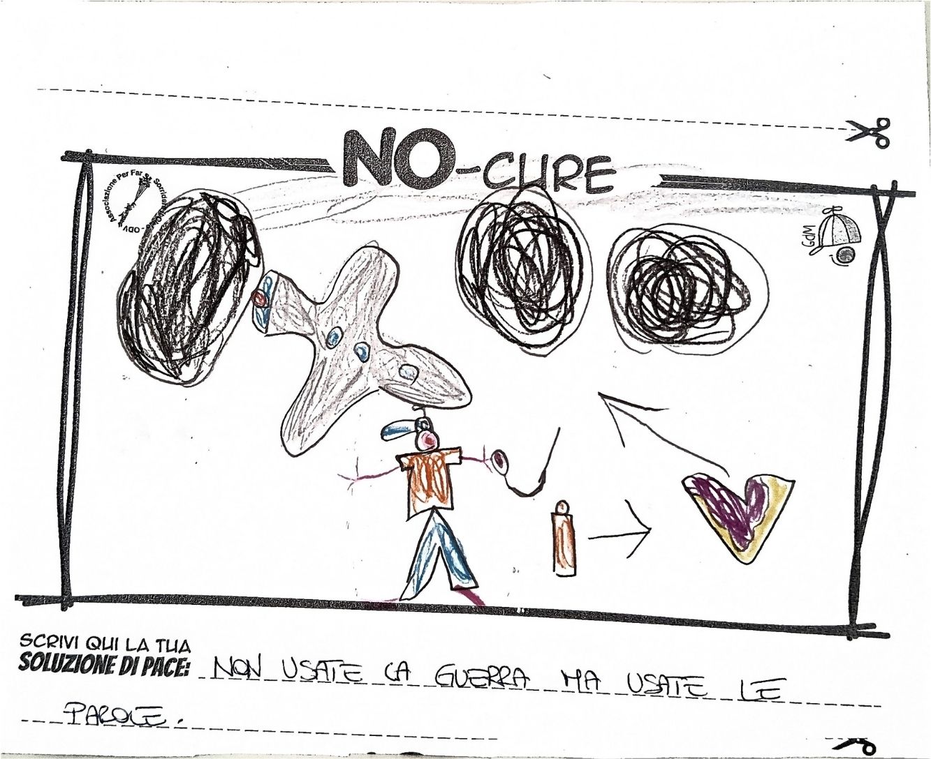 L’opera di sensibilizzazione si si esprime concretamente con la creazione di un DISEGNO DELLA MERAVIGLIA che andrà ad aiutare una delle 12 fatiche. Allo stesso modo chiederemo a tutti i partecipanti di andare a scrivere una “Soluzione di Pace” che possa aiutare anch’essa una delle 12 fatiche dei Bambini della guerra.
