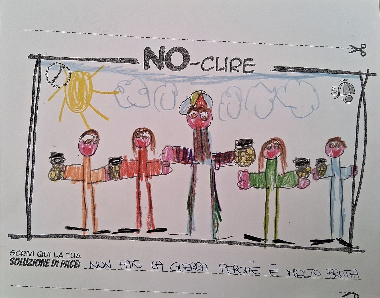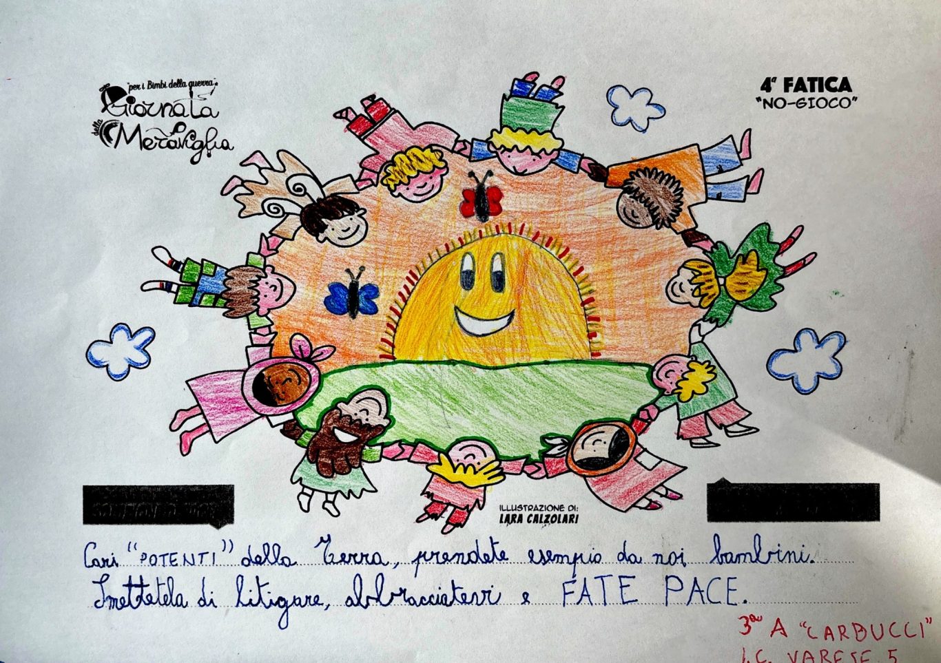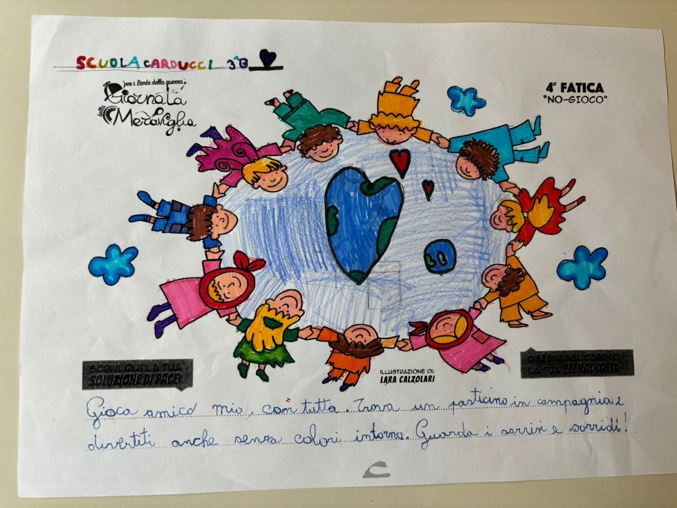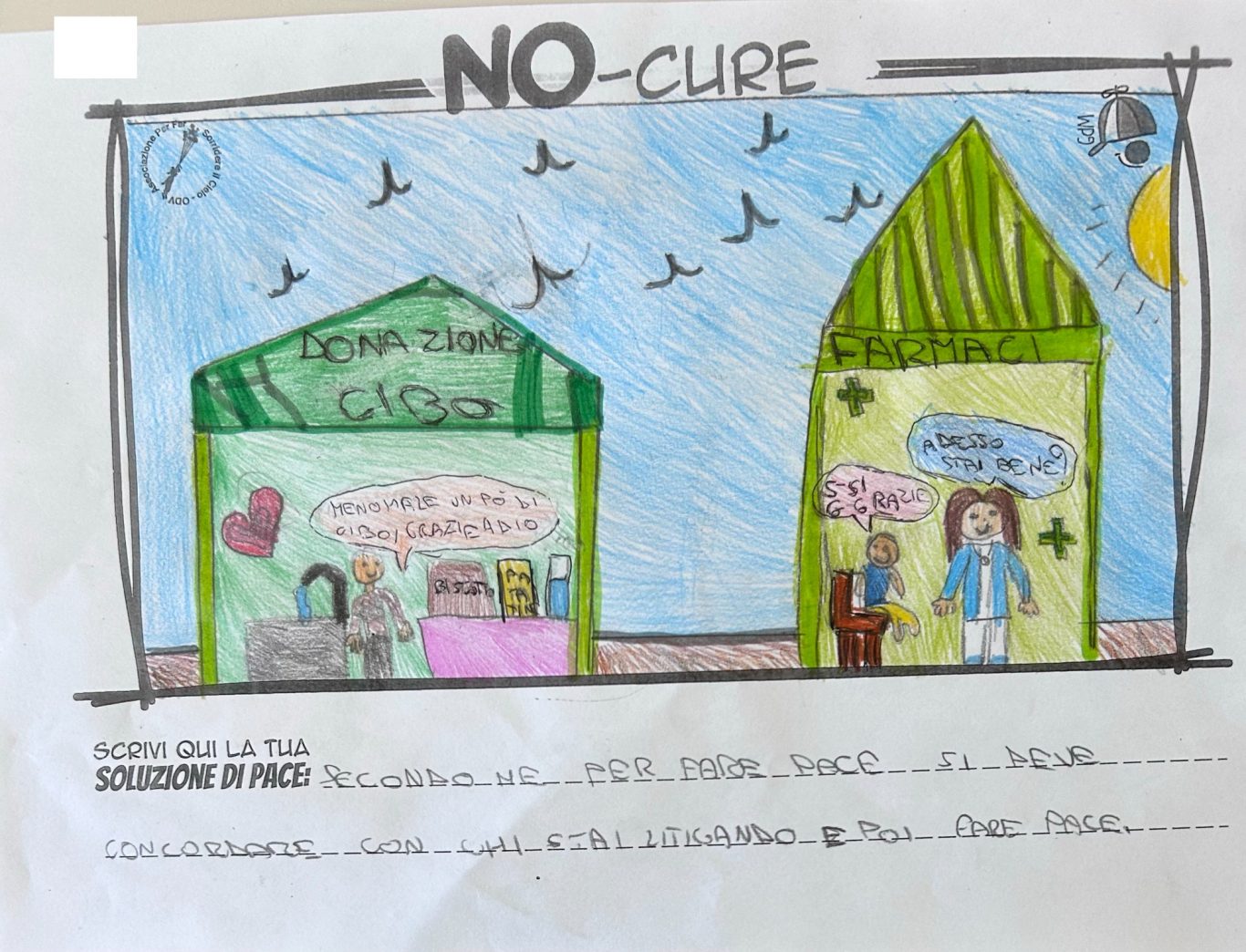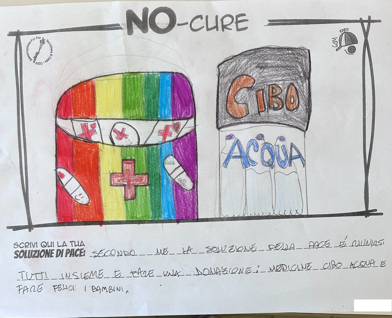 L’opera di sensibilizzazione si si esprime concretamente con la creazione di un DISEGNO DELLA MERAVIGLIA che andrà ad aiutare una delle 12 fatiche. Allo stesso modo chiederemo a tutti i partecipanti di andare a scrivere una “Soluzione di Pace” che possa aiutare anch’essa una delle 12 fatiche dei Bambini della guerra.