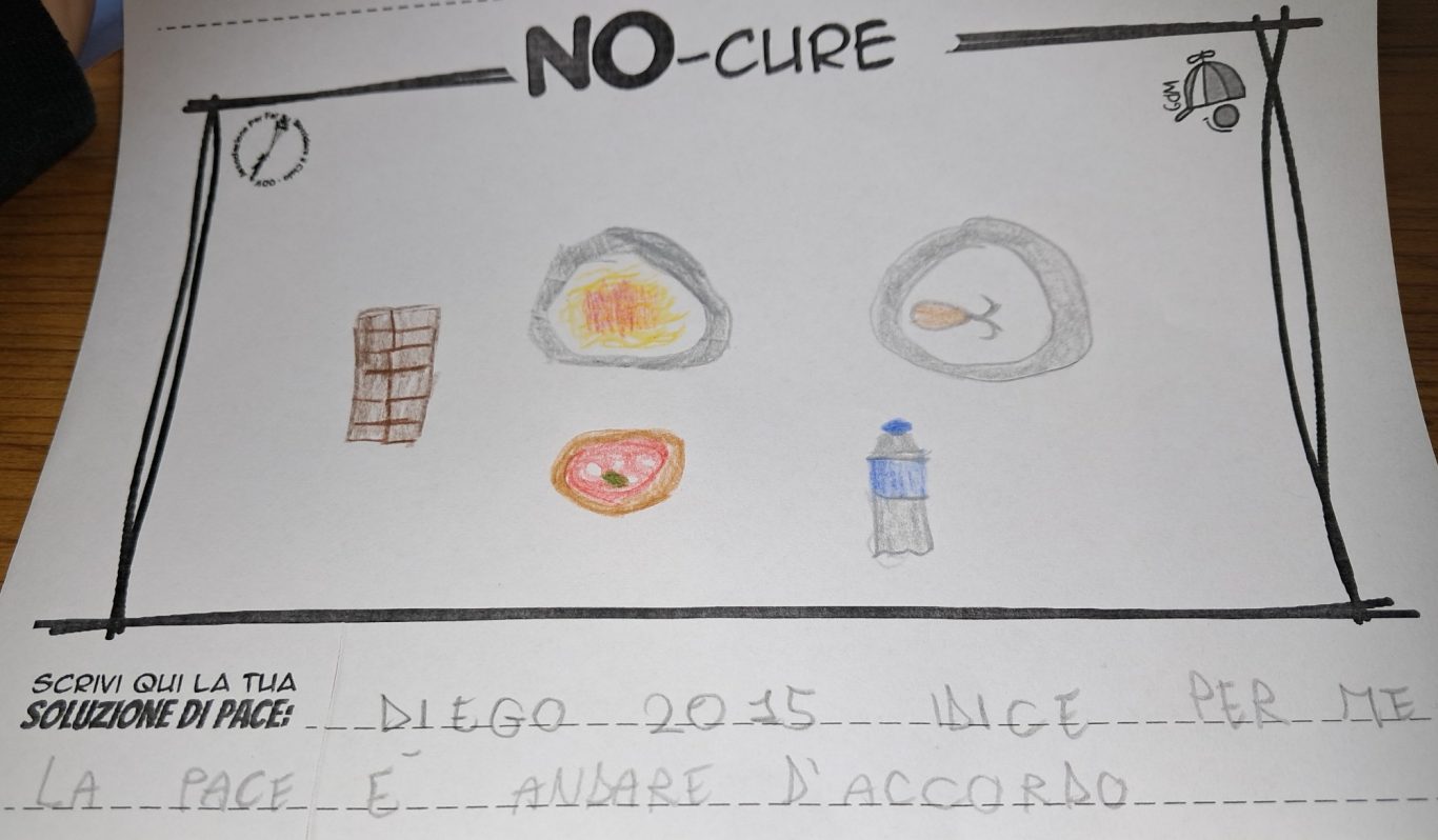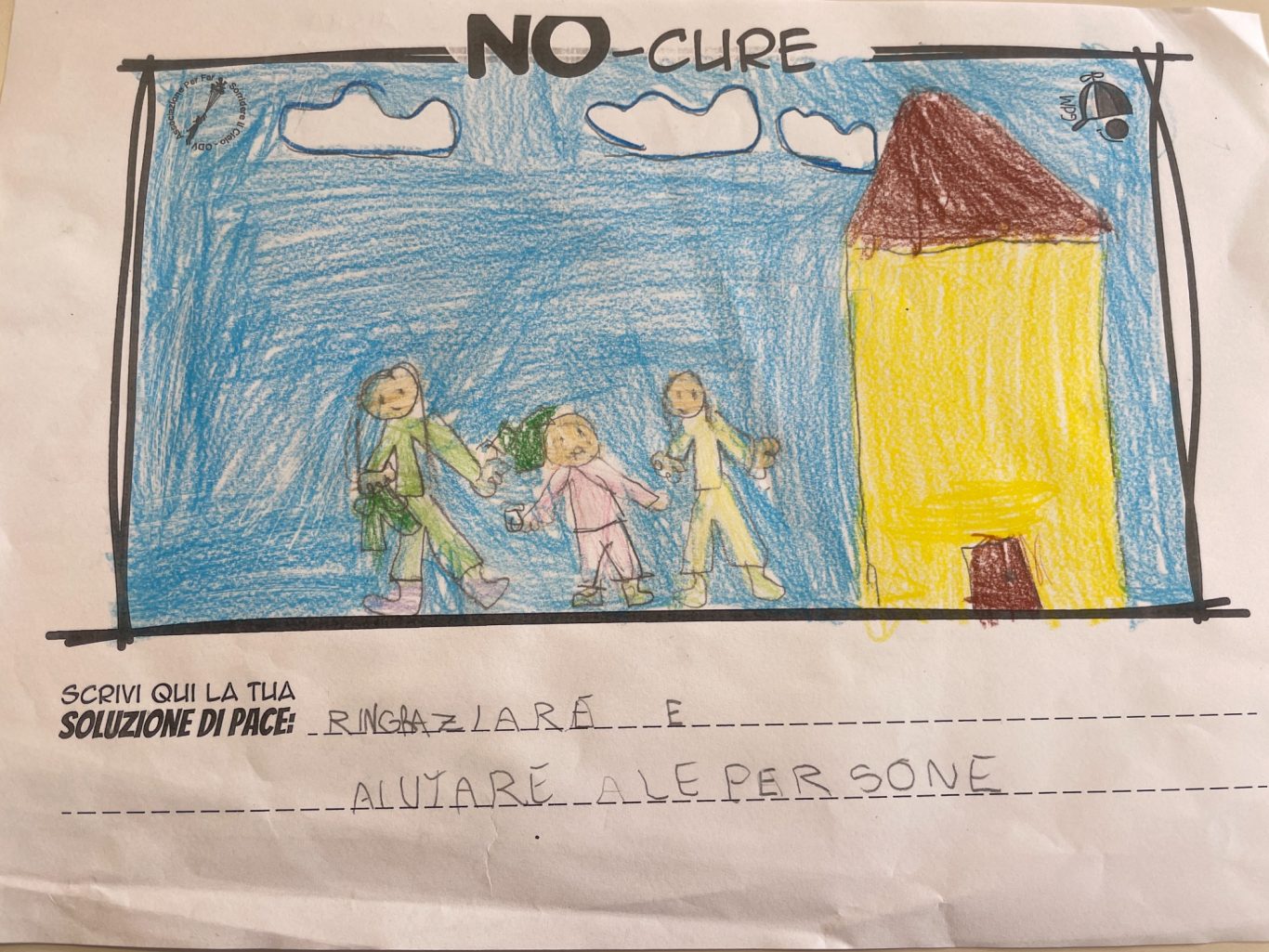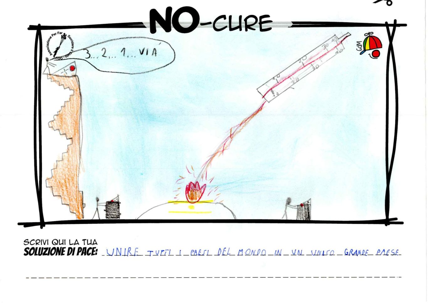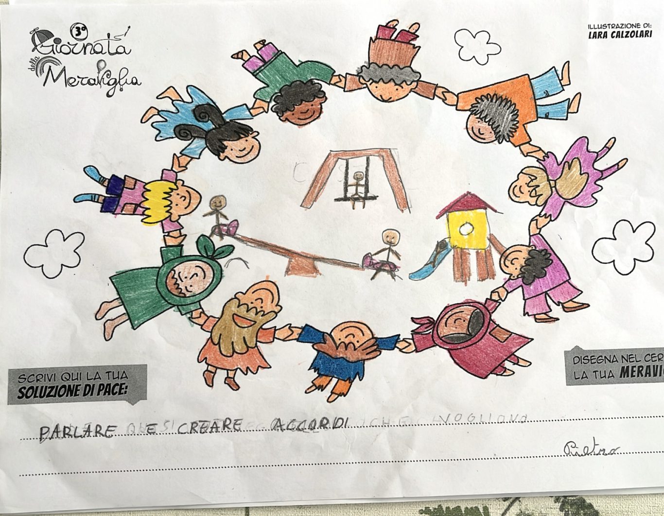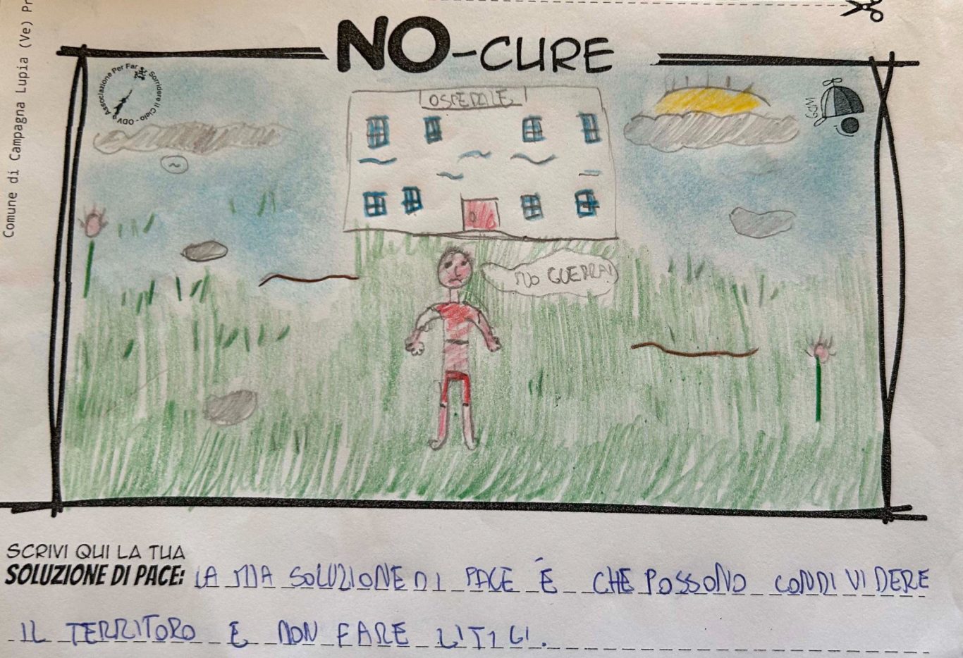 L’opera di sensibilizzazione si si esprime concretamente con la creazione di un DISEGNO DELLA MERAVIGLIA che andrà ad aiutare una delle 12 fatiche. Allo stesso modo chiederemo a tutti i partecipanti di andare a scrivere una “Soluzione di Pace” che possa aiutare anch’essa una delle 12 fatiche dei Bambini della guerra.