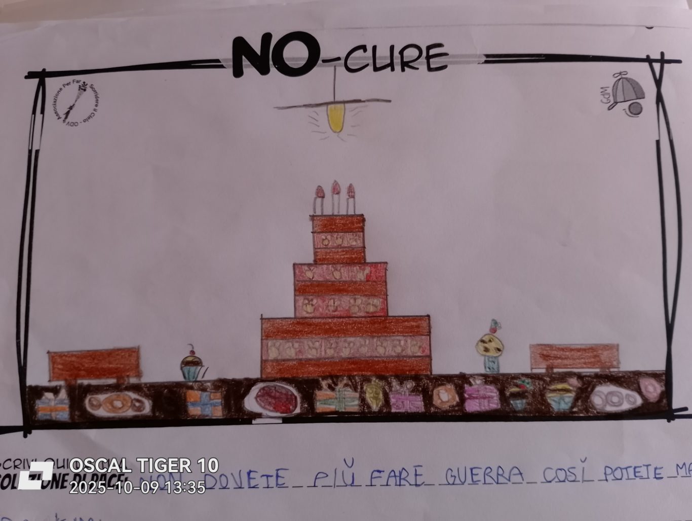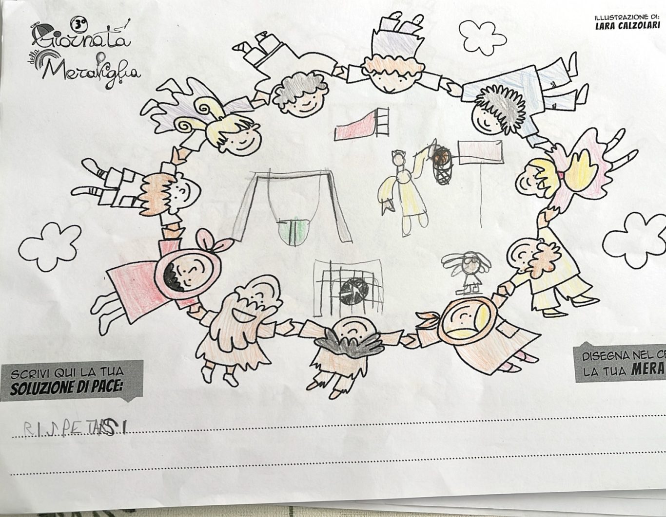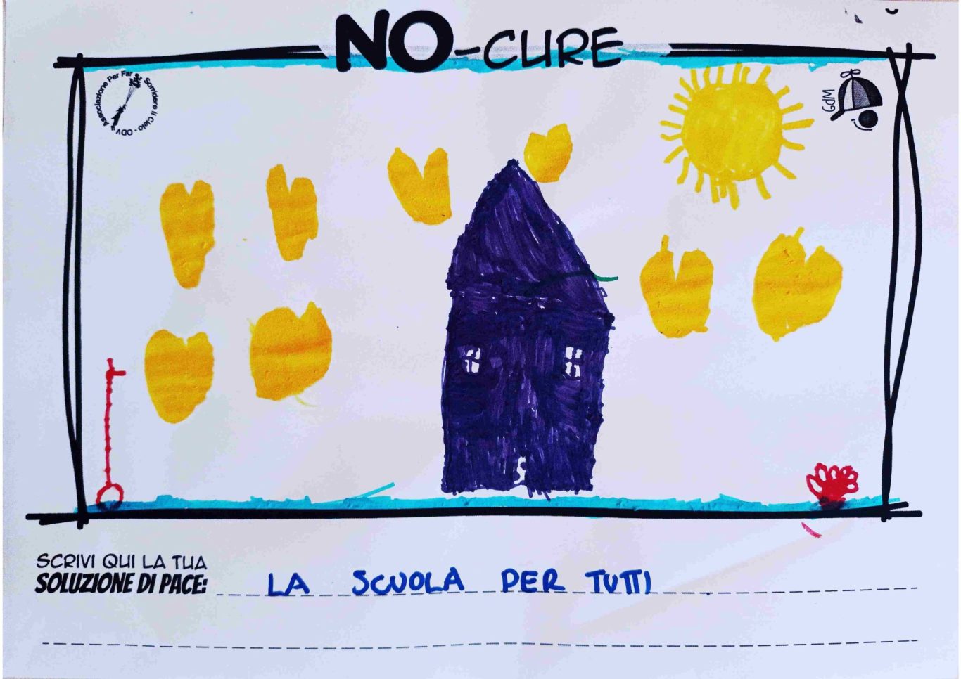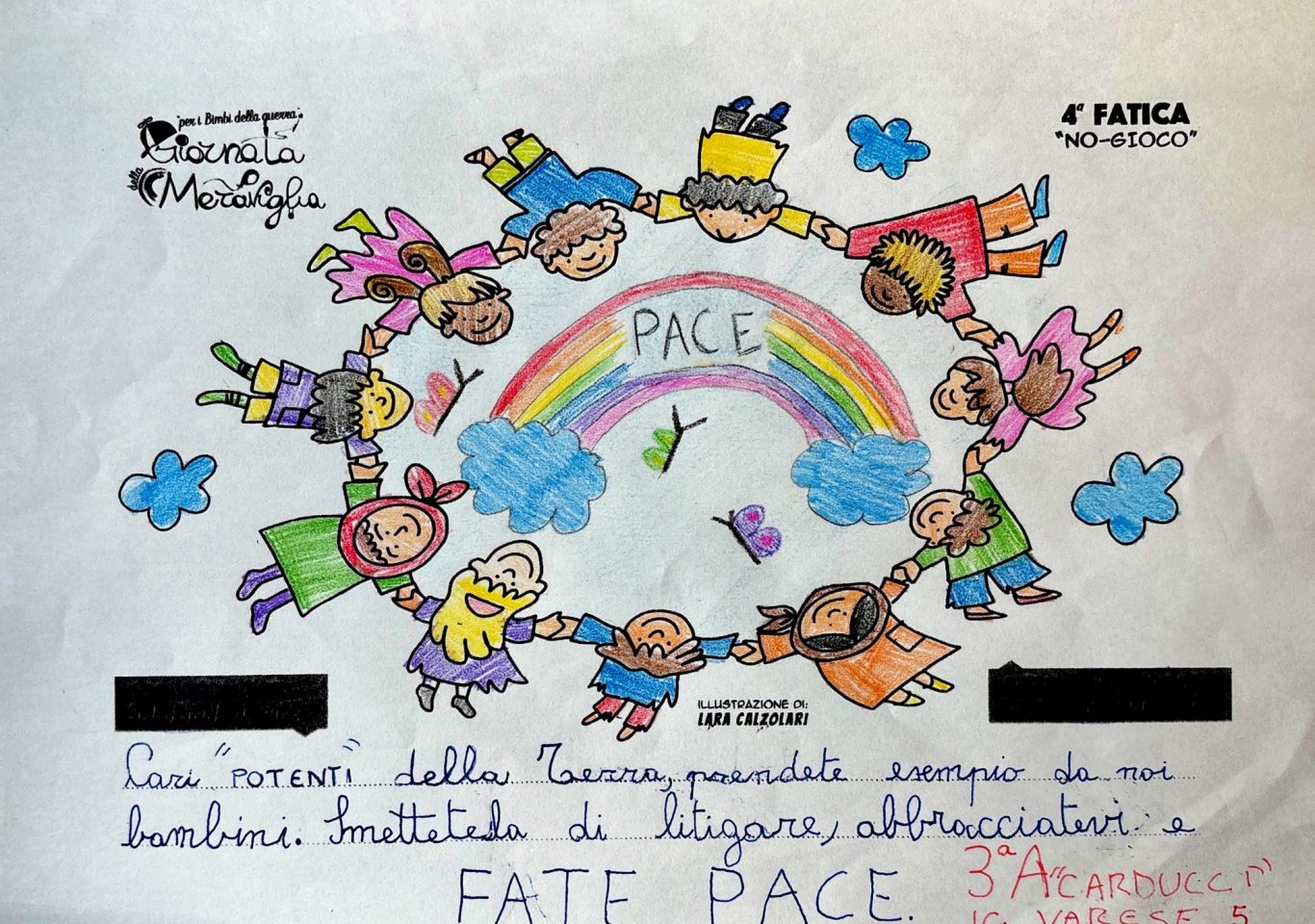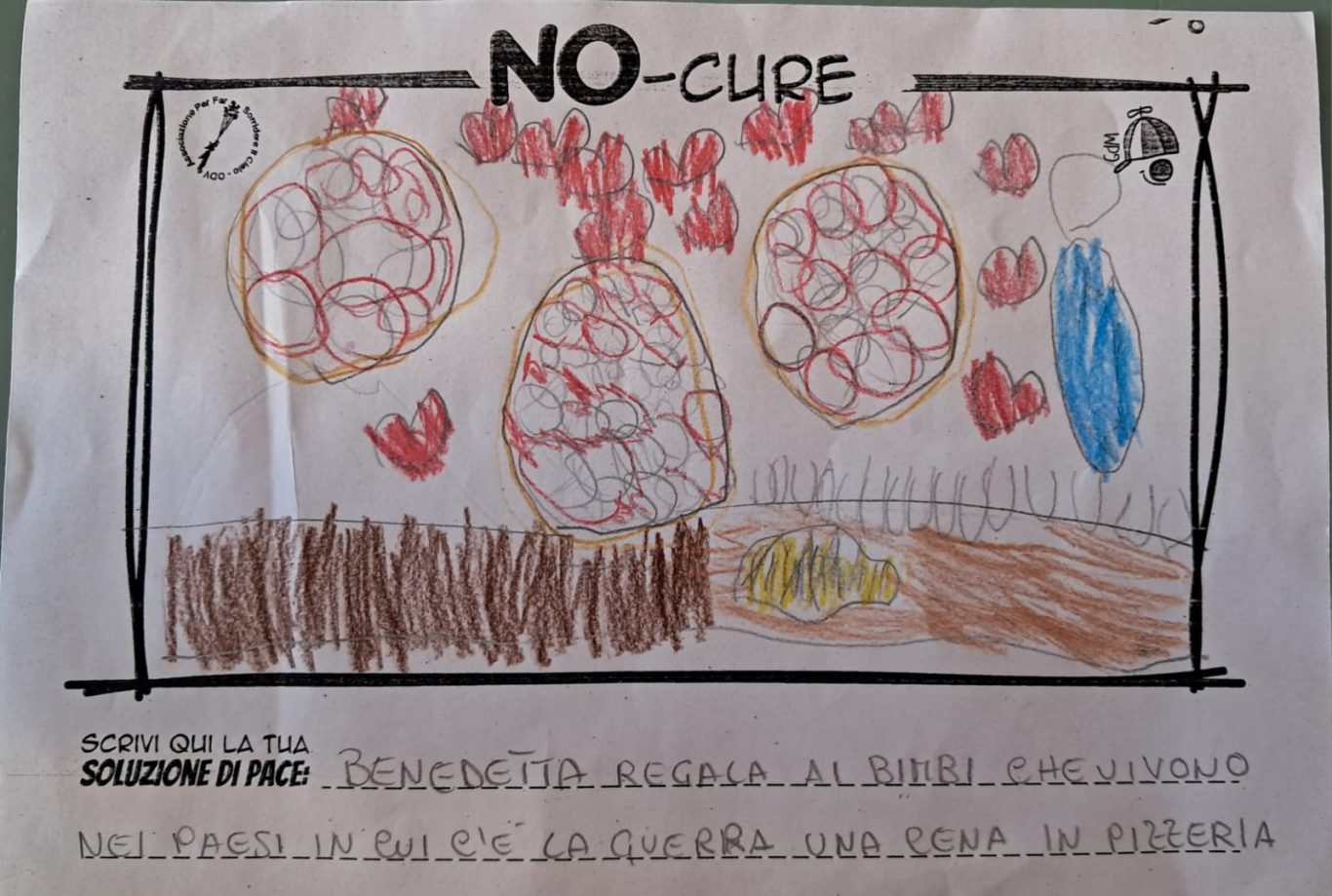 L’opera di sensibilizzazione si si esprime concretamente con la creazione di un DISEGNO DELLA MERAVIGLIA che andrà ad aiutare una delle 12 fatiche. Allo stesso modo chiederemo a tutti i partecipanti di andare a scrivere una “Soluzione di Pace” che possa aiutare anch’essa una delle 12 fatiche dei Bambini della guerra.