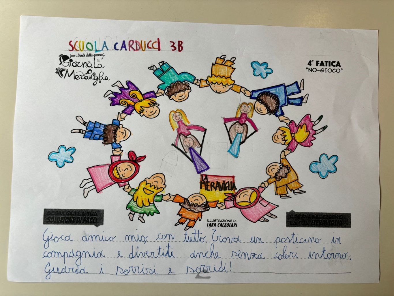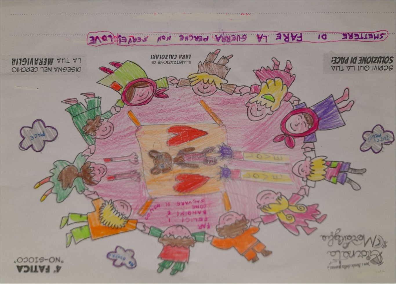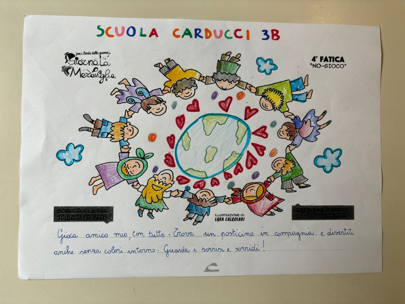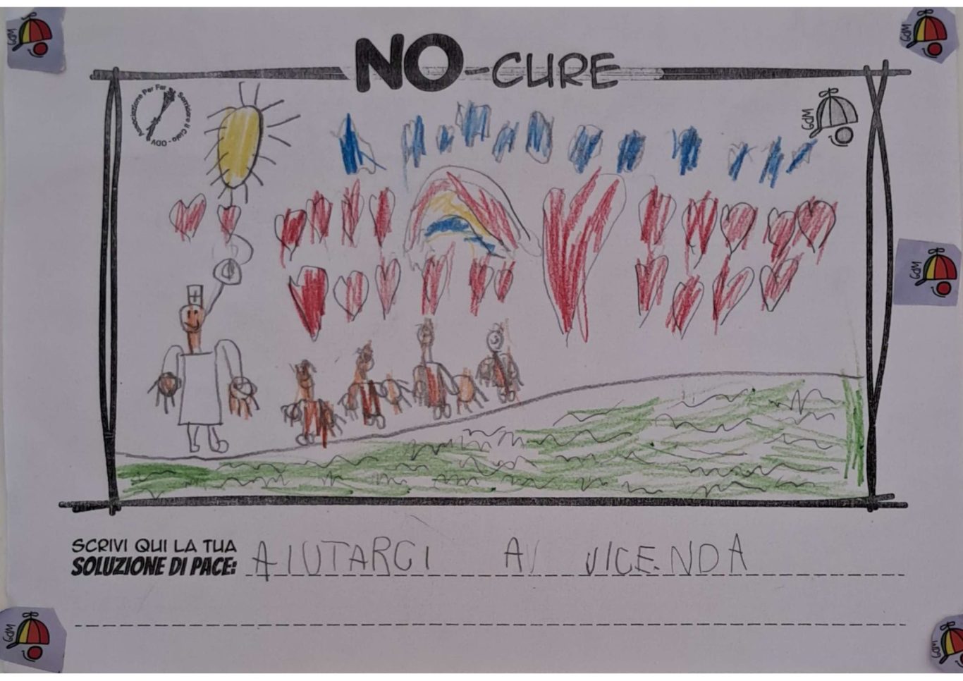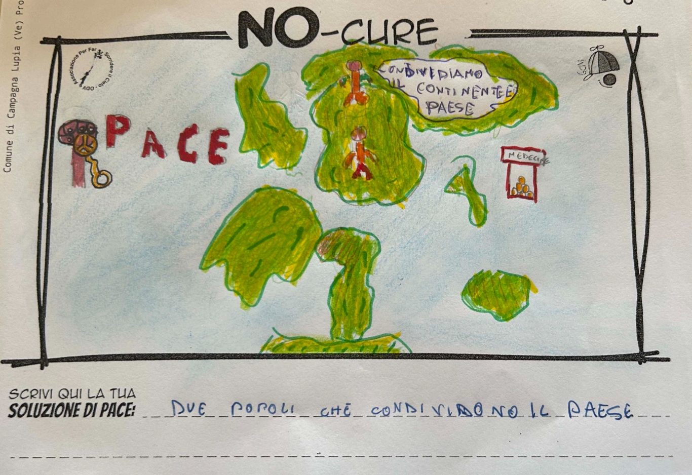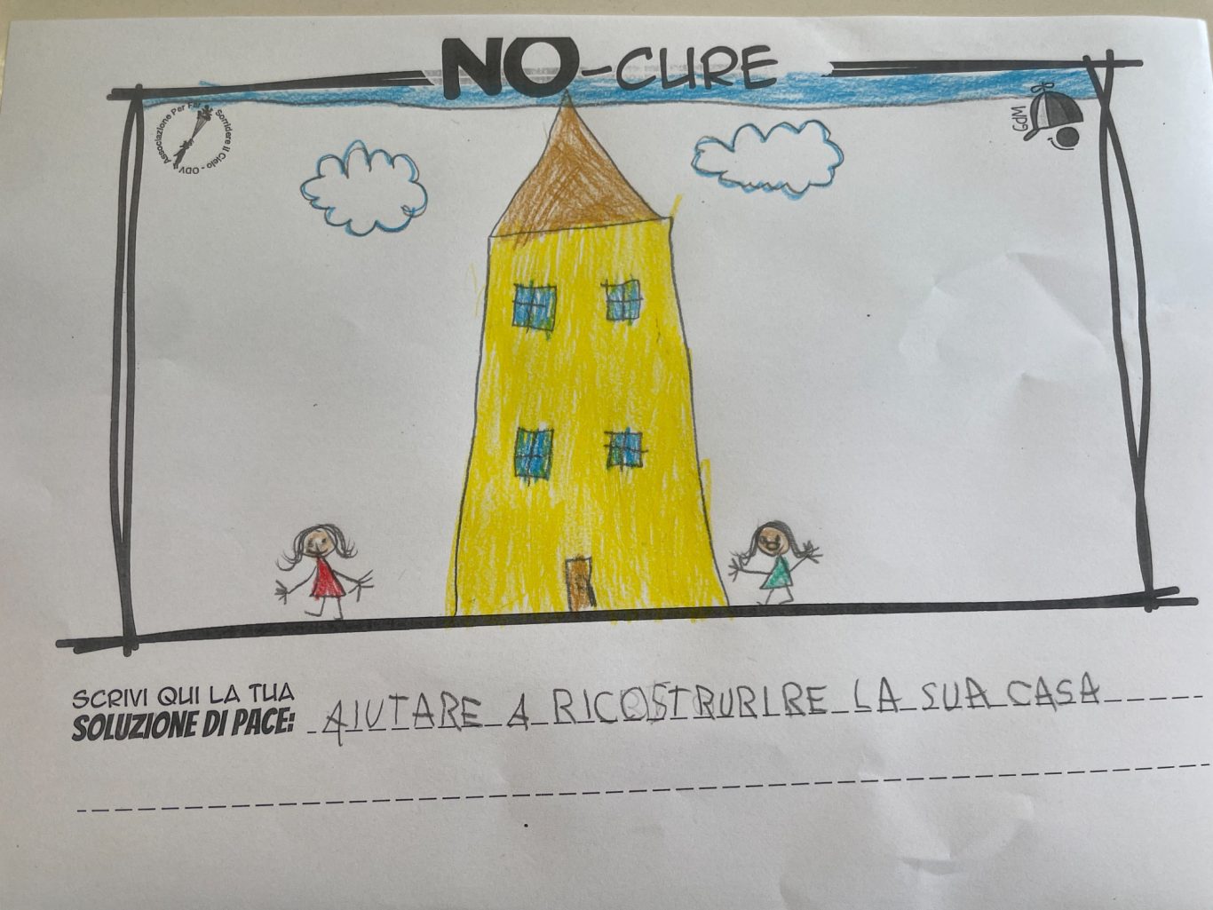 L’opera di sensibilizzazione si si esprime concretamente con la creazione di un DISEGNO DELLA MERAVIGLIA che andrà ad aiutare una delle 12 fatiche. Allo stesso modo chiederemo a tutti i partecipanti di andare a scrivere una “Soluzione di Pace” che possa aiutare anch’essa una delle 12 fatiche dei Bambini della guerra.
