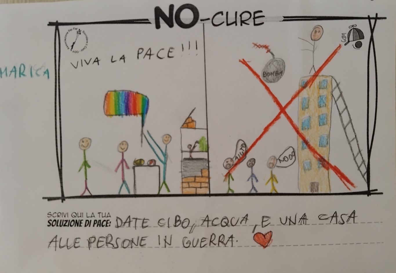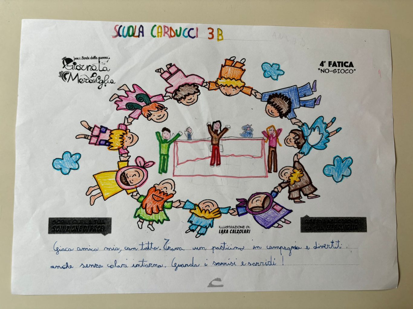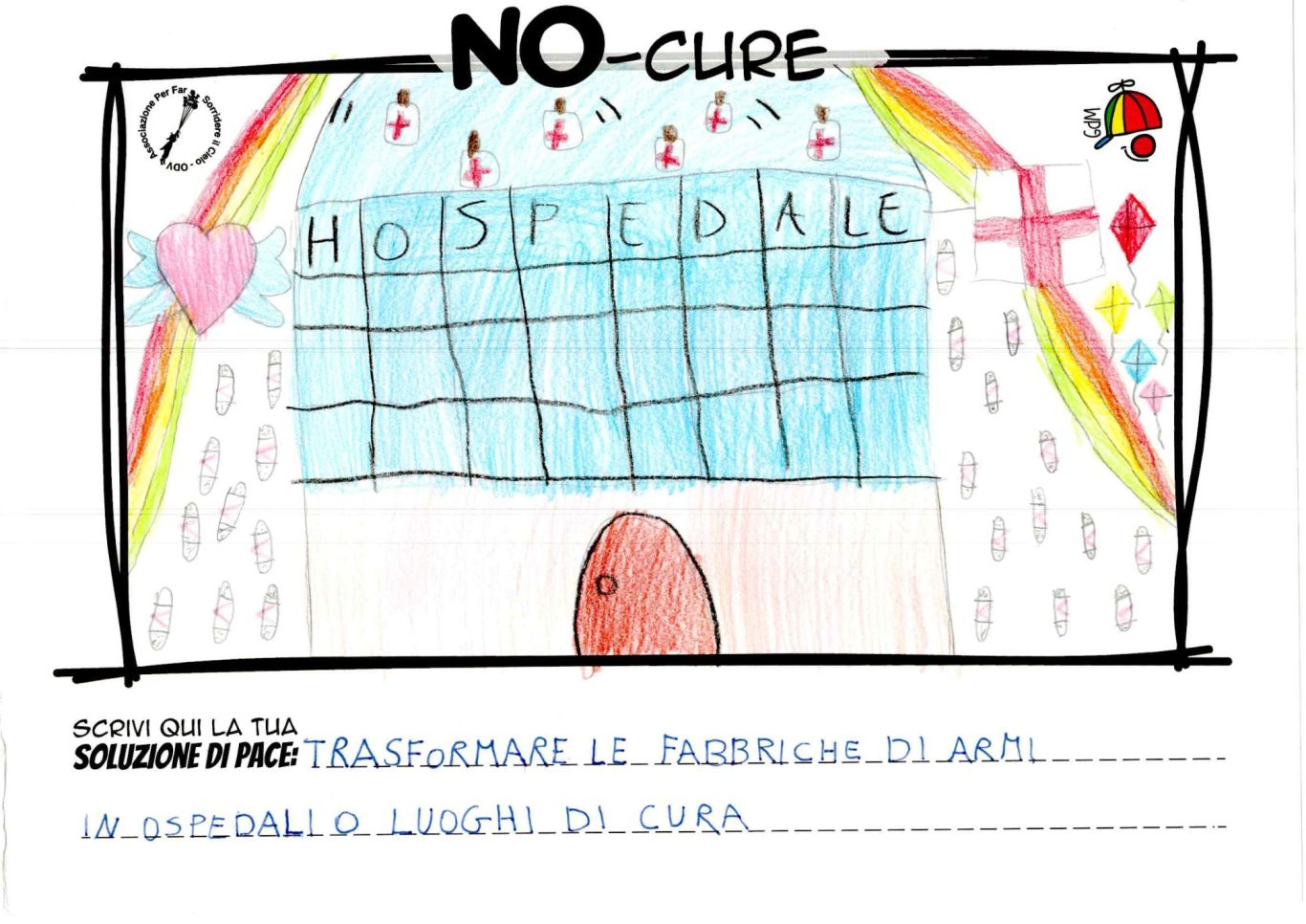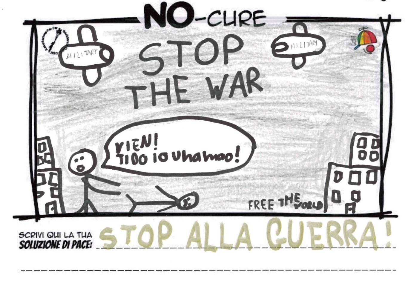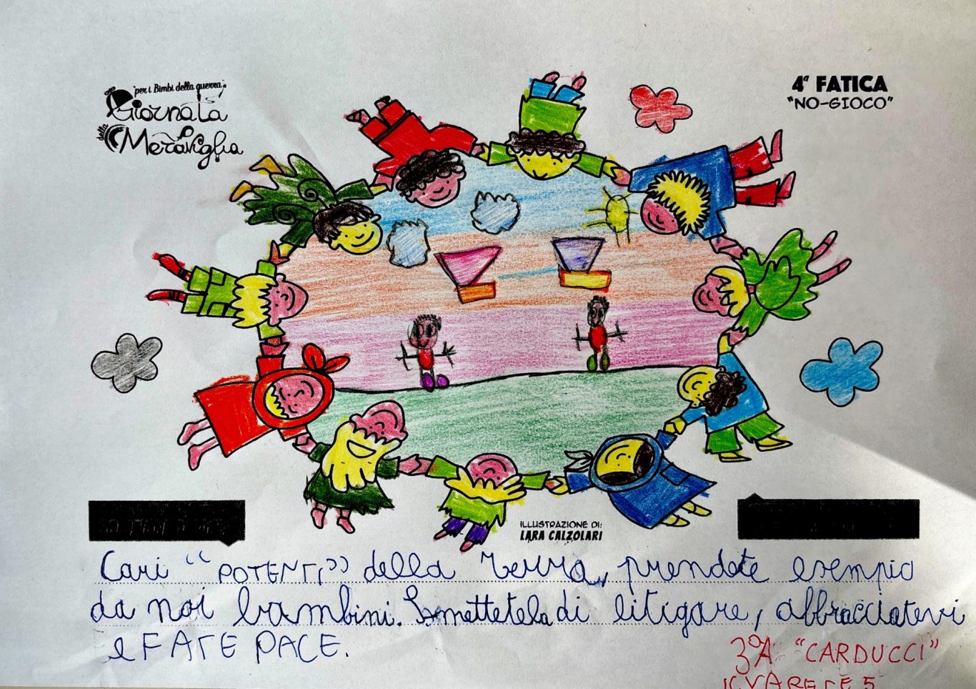 L’opera di sensibilizzazione si si esprime concretamente con la creazione di un DISEGNO DELLA MERAVIGLIA che andrà ad aiutare una delle 12 fatiche. Allo stesso modo chiederemo a tutti i partecipanti di andare a scrivere una “Soluzione di Pace” che possa aiutare anch’essa una delle 12 fatiche dei Bambini della guerra.