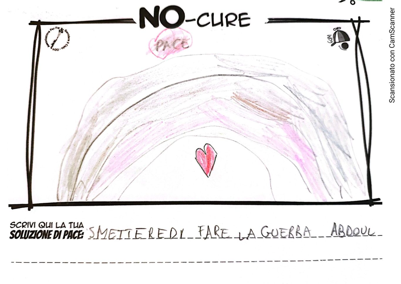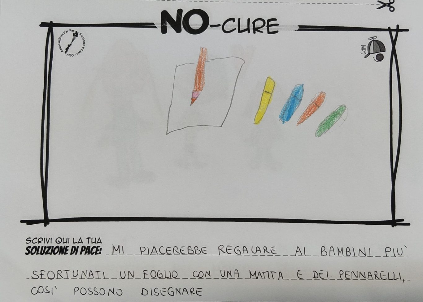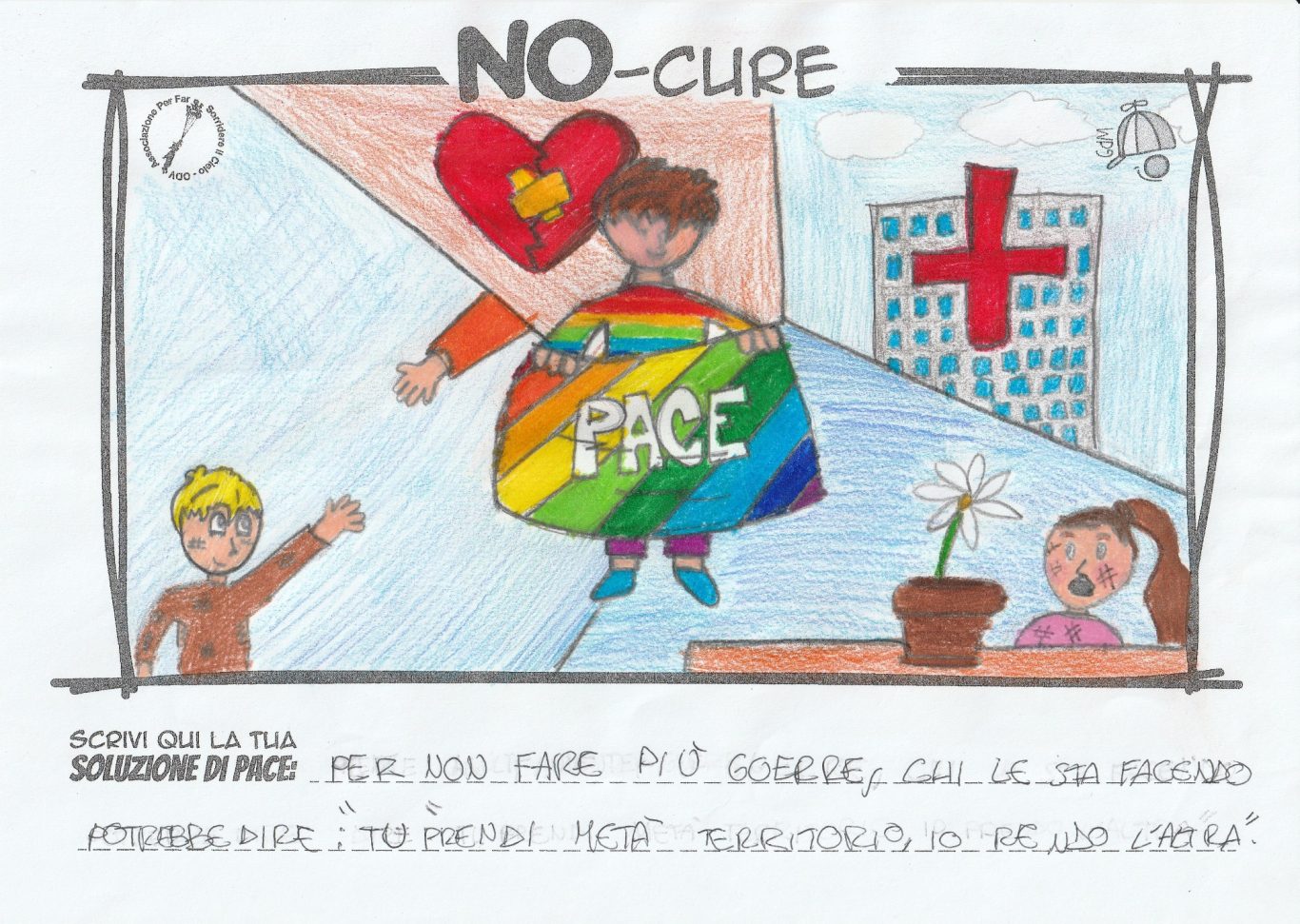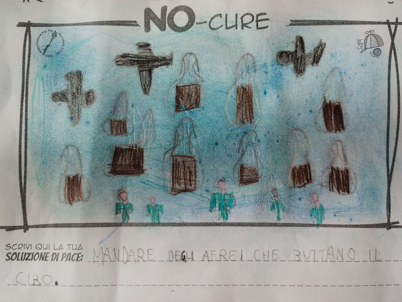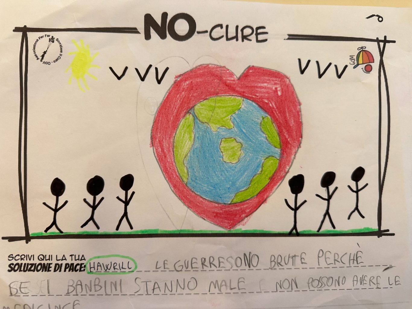 L’opera di sensibilizzazione si si esprime concretamente con la creazione di un DISEGNO DELLA MERAVIGLIA che andrà ad aiutare una delle 12 fatiche. Allo stesso modo chiederemo a tutti i partecipanti di andare a scrivere una “Soluzione di Pace” che possa aiutare anch’essa una delle 12 fatiche dei Bambini della guerra.