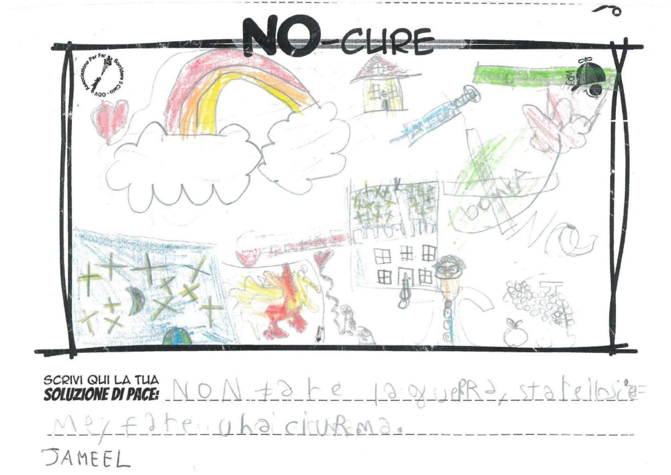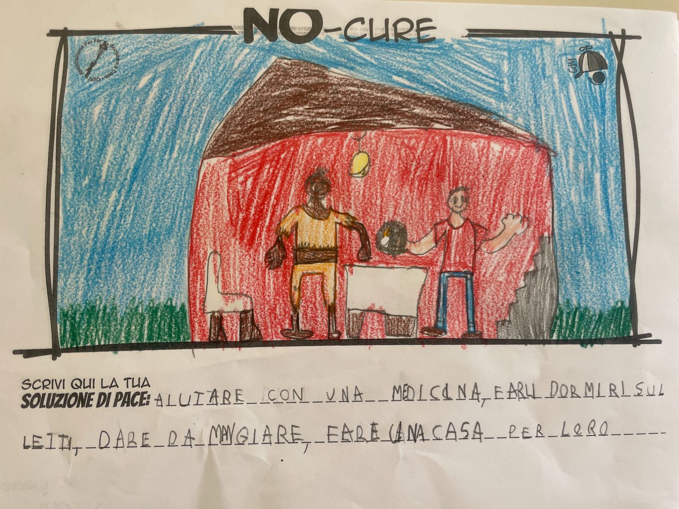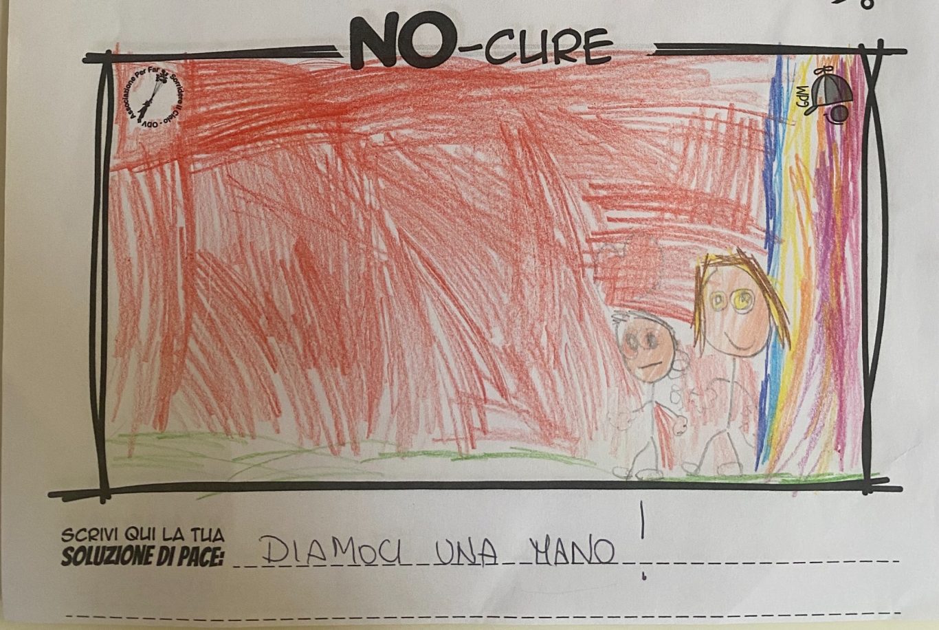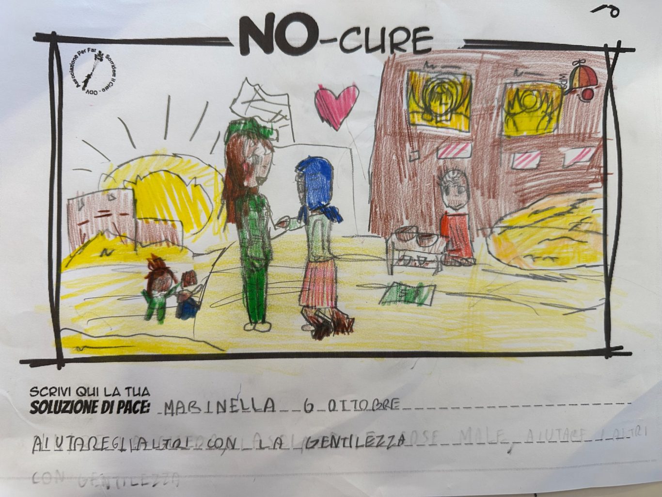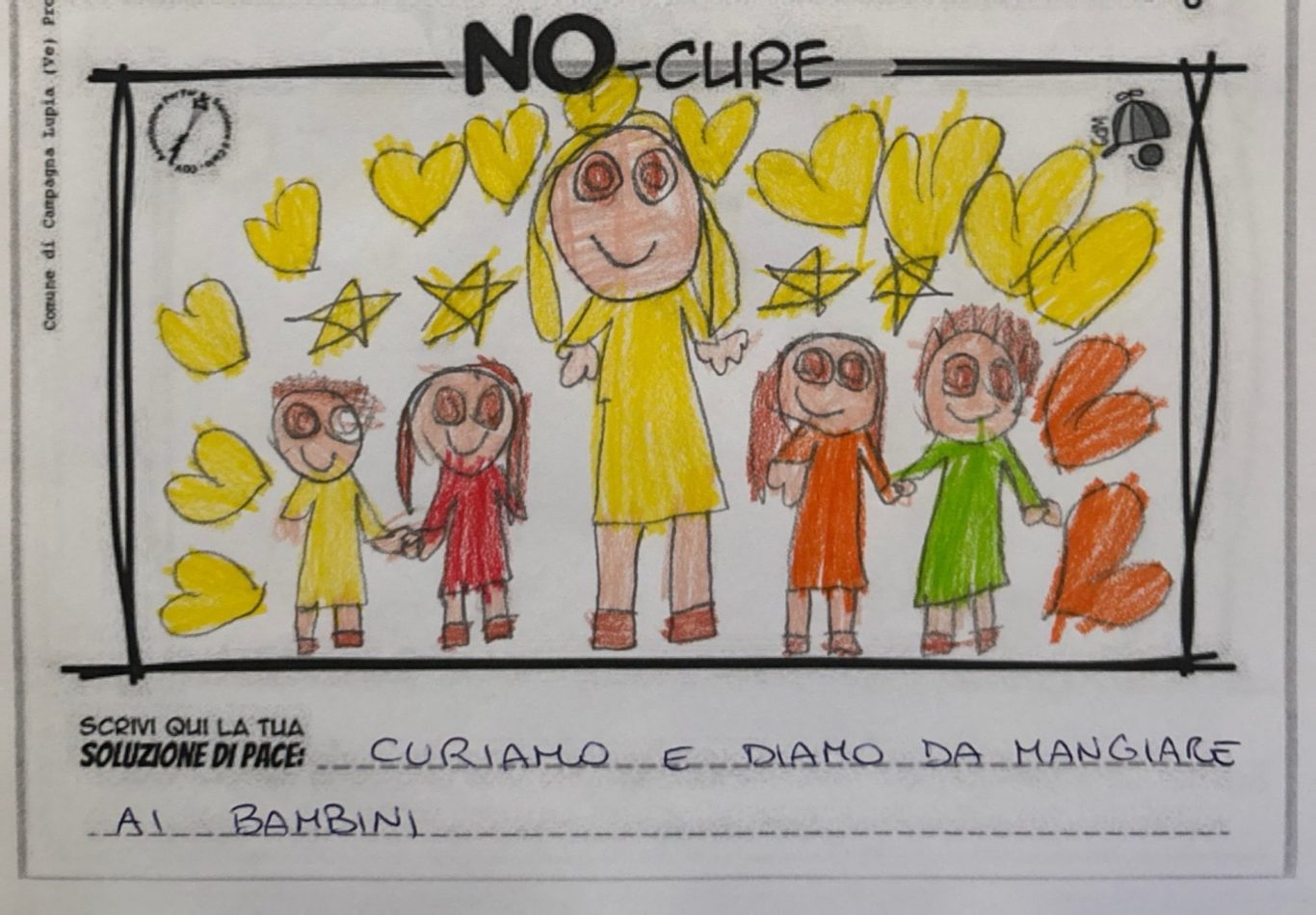 L’opera di sensibilizzazione si si esprime concretamente con la creazione di un DISEGNO DELLA MERAVIGLIA che andrà ad aiutare una delle 12 fatiche. Allo stesso modo chiederemo a tutti i partecipanti di andare a scrivere una “Soluzione di Pace” che possa aiutare anch’essa una delle 12 fatiche dei Bambini della guerra.