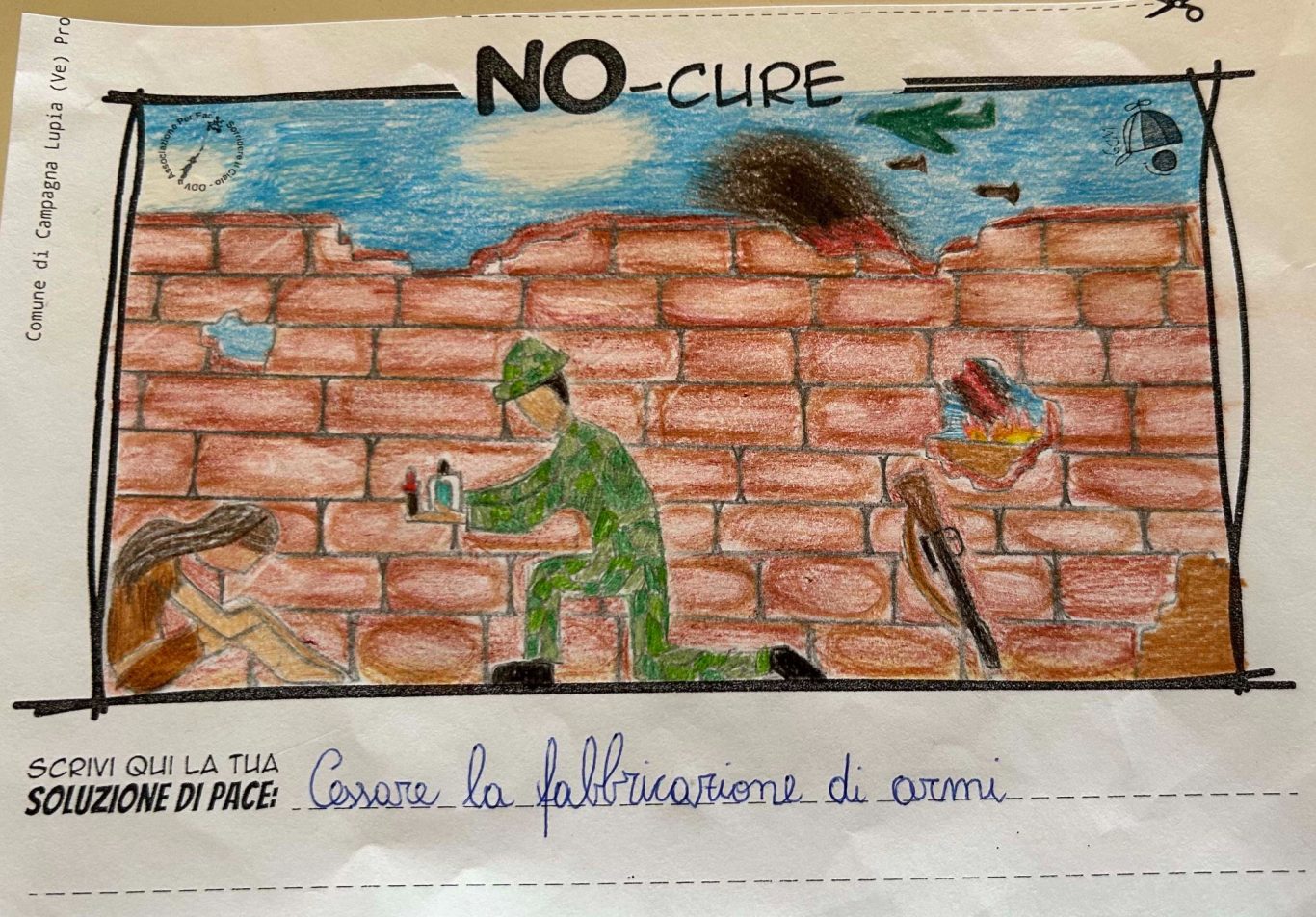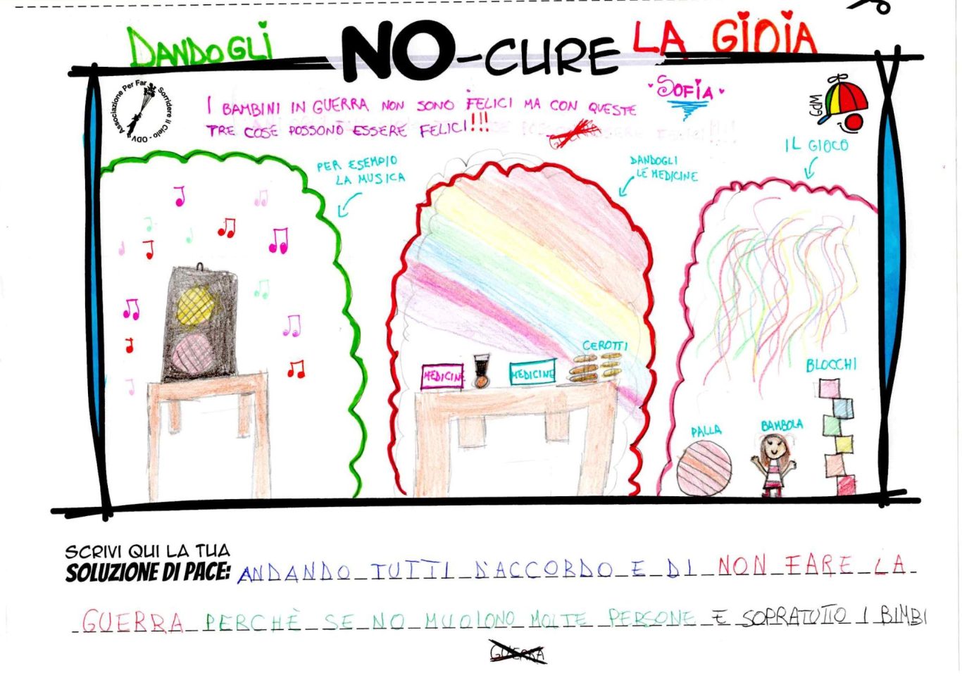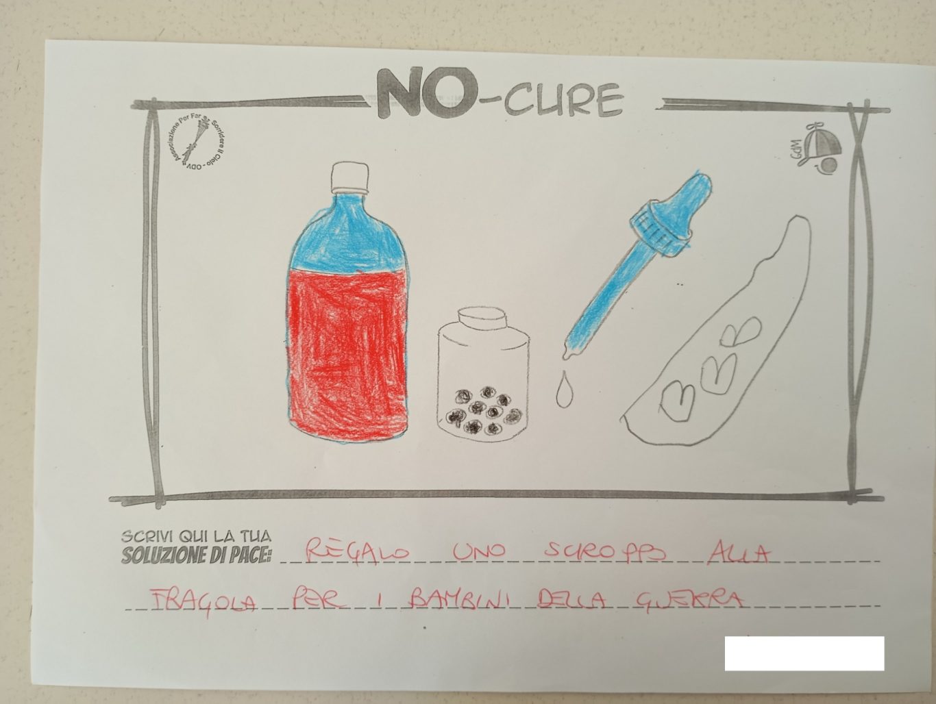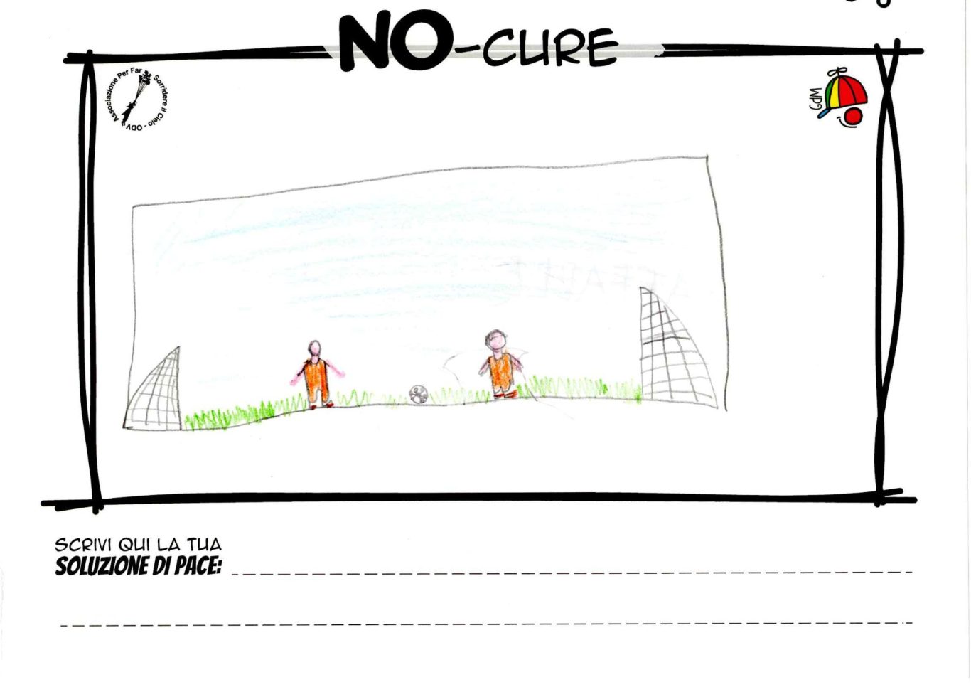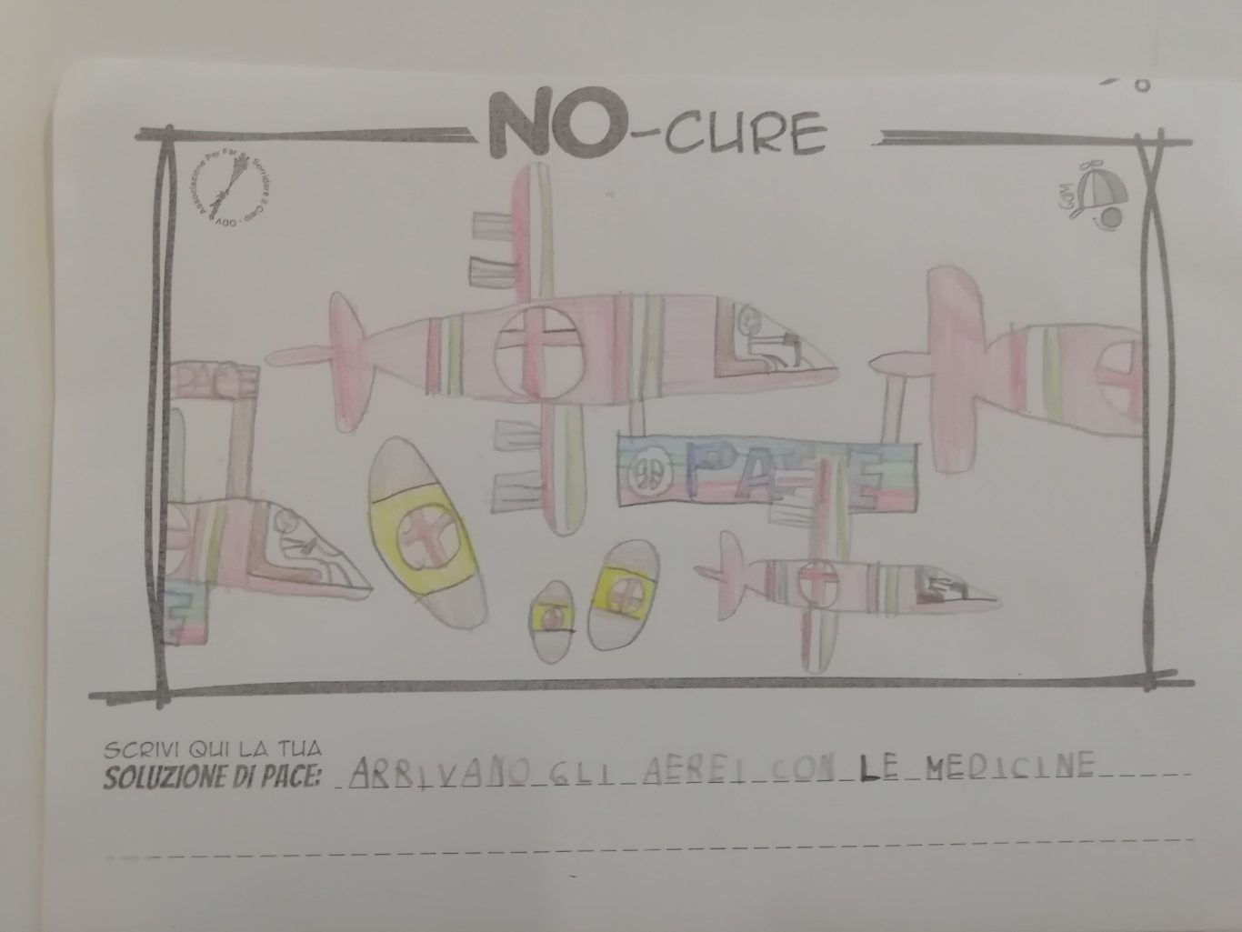 L’opera di sensibilizzazione si si esprime concretamente con la creazione di un DISEGNO DELLA MERAVIGLIA che andrà ad aiutare una delle 12 fatiche. Allo stesso modo chiederemo a tutti i partecipanti di andare a scrivere una “Soluzione di Pace” che possa aiutare anch’essa una delle 12 fatiche dei Bambini della guerra.