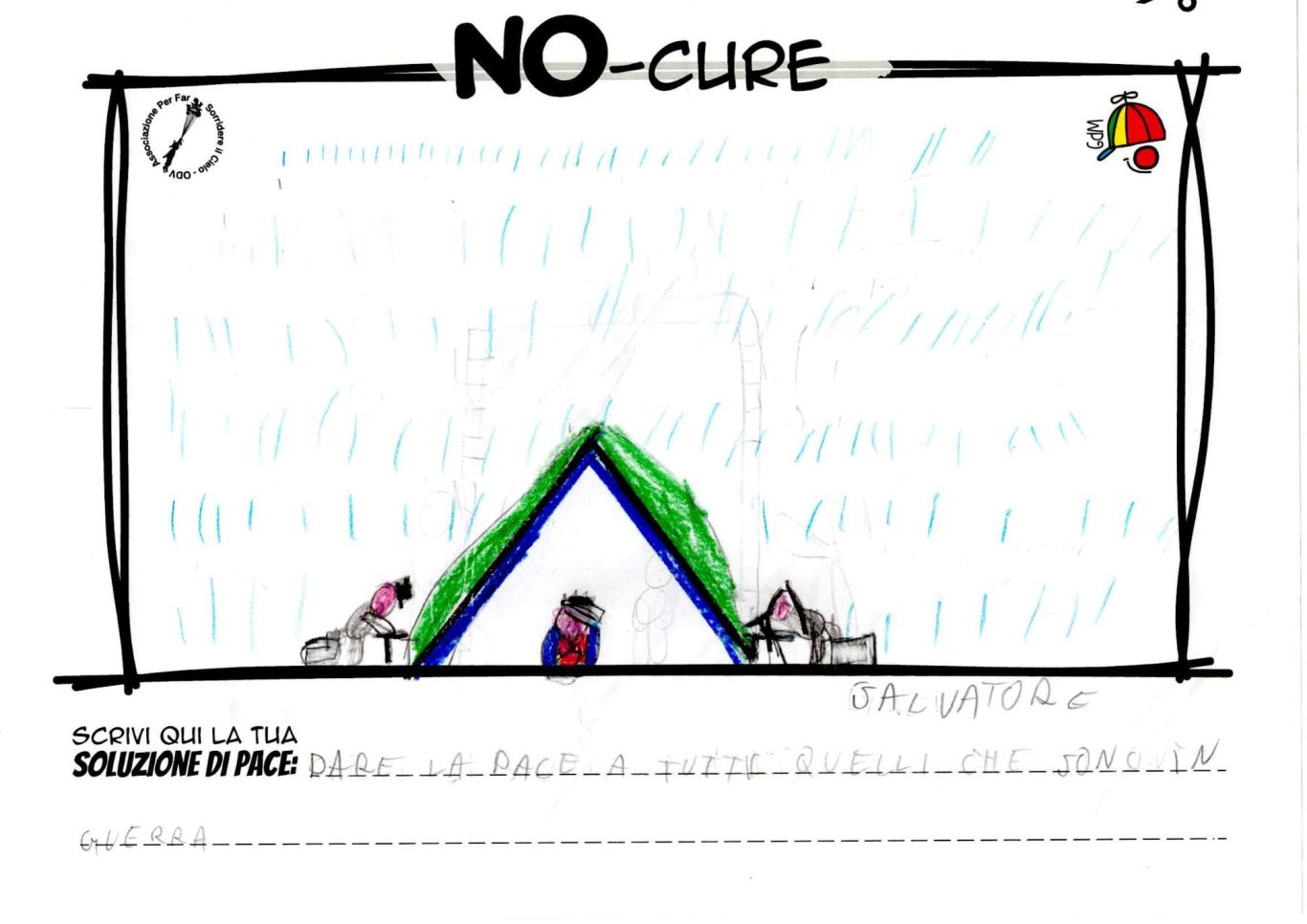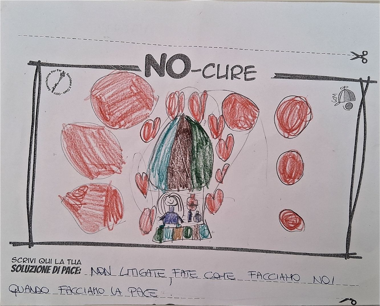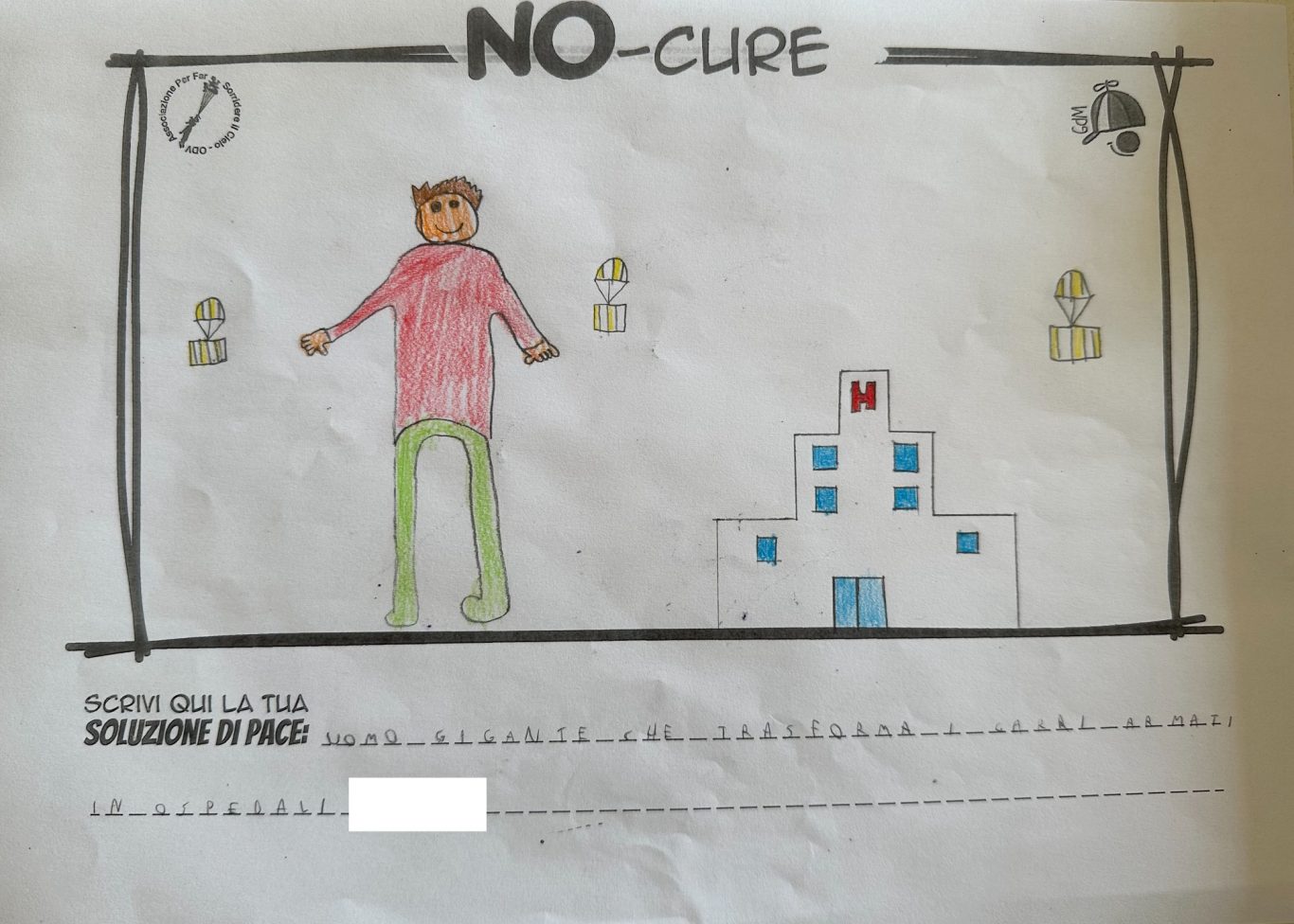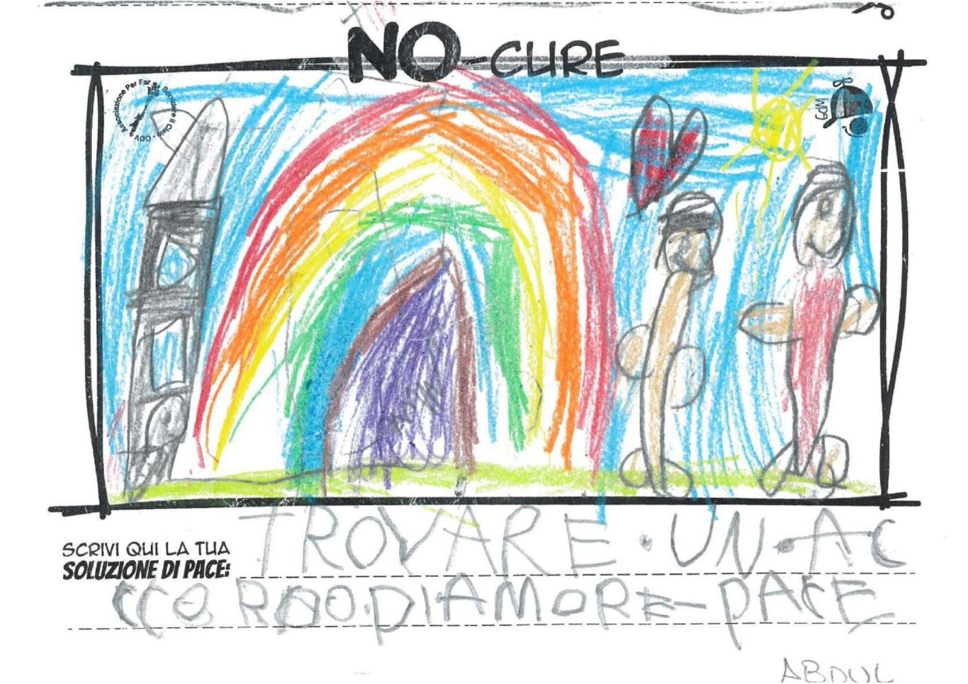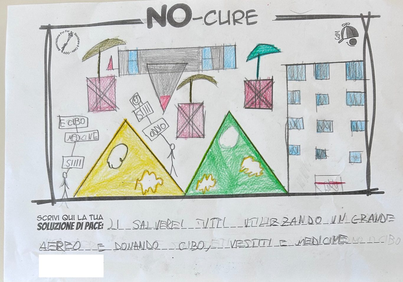 L’opera di sensibilizzazione si si esprime concretamente con la creazione di un DISEGNO DELLA MERAVIGLIA che andrà ad aiutare una delle 12 fatiche. Allo stesso modo chiederemo a tutti i partecipanti di andare a scrivere una “Soluzione di Pace” che possa aiutare anch’essa una delle 12 fatiche dei Bambini della guerra.