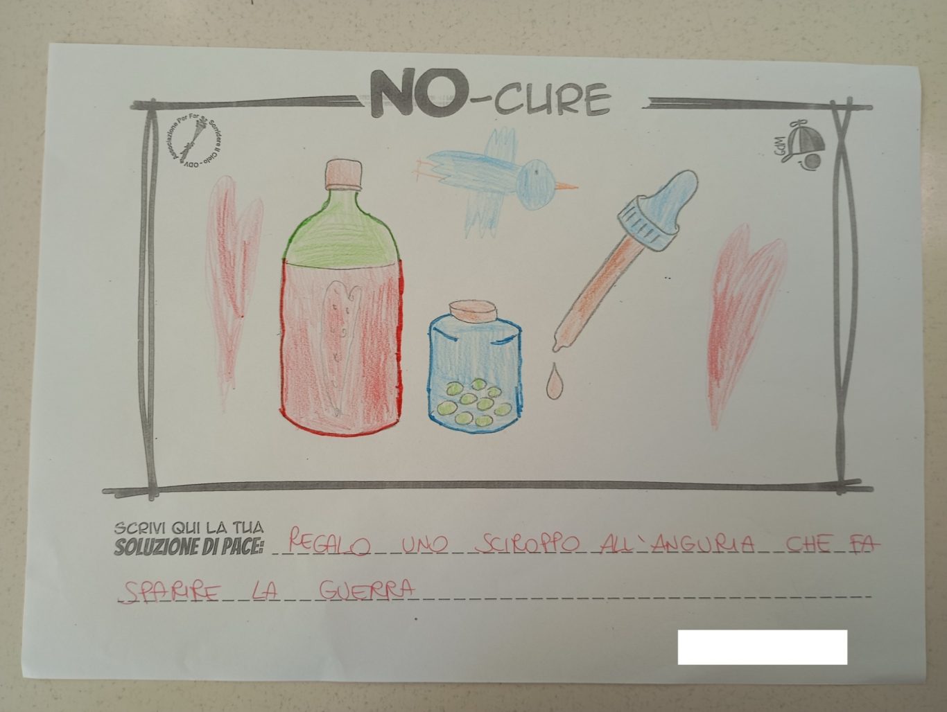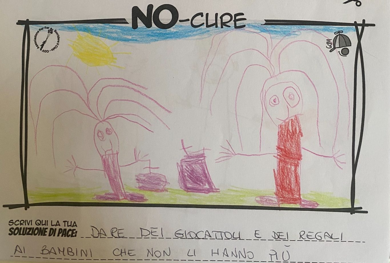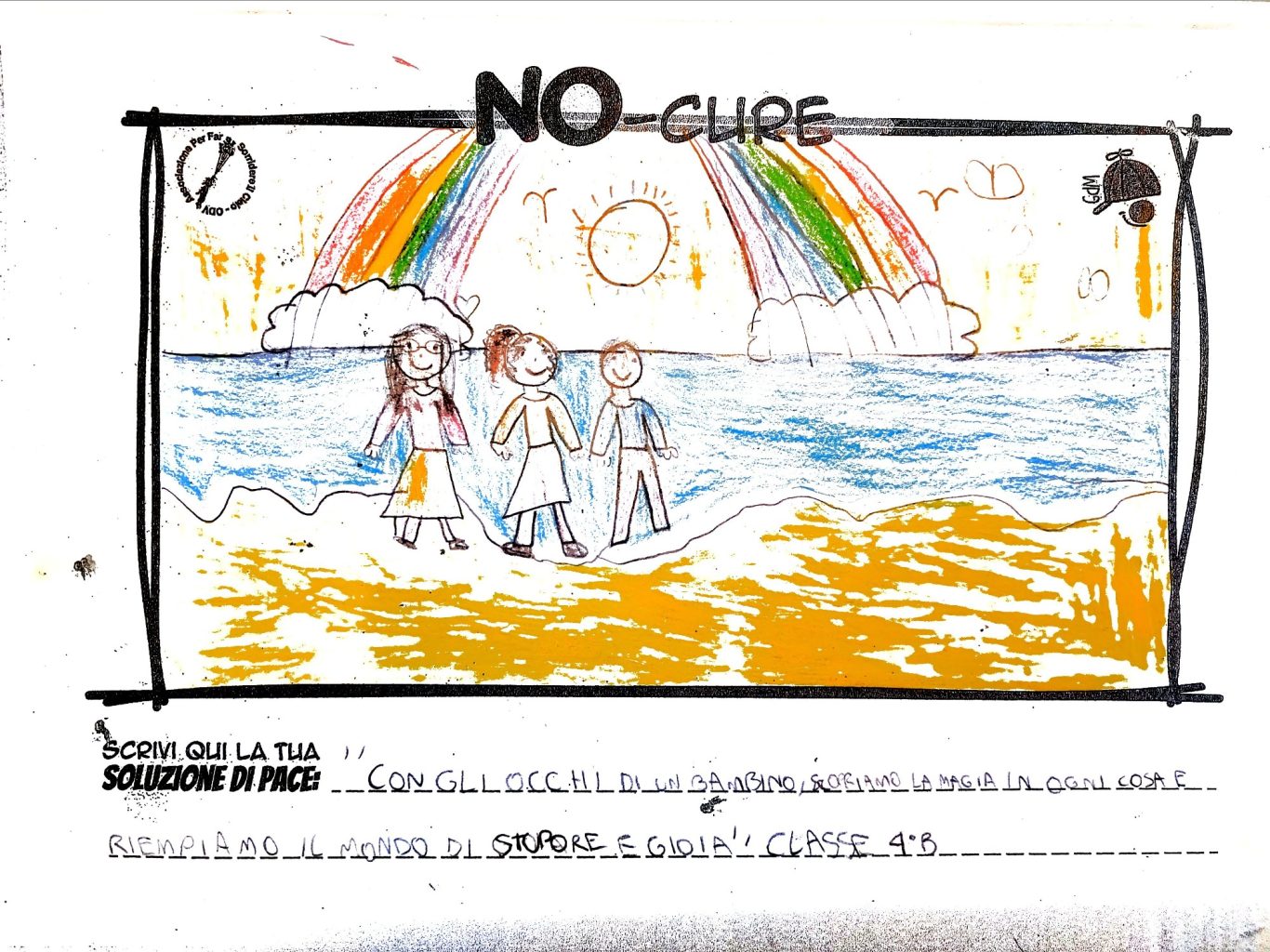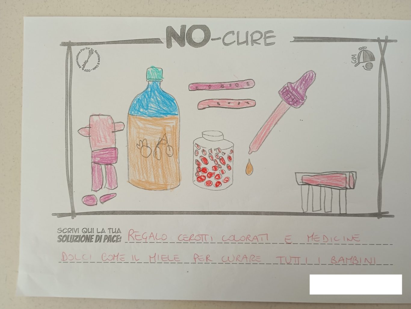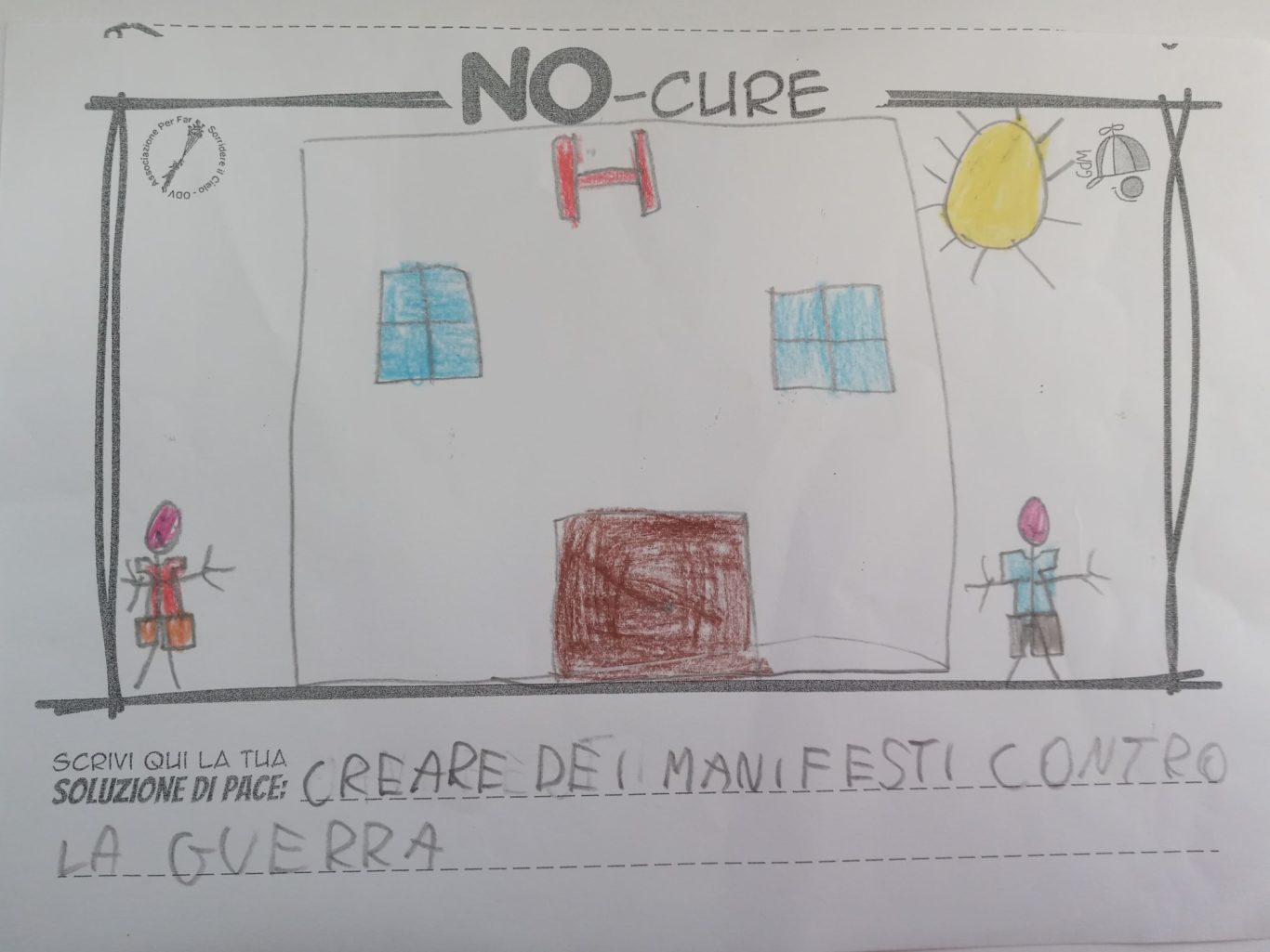 L’opera di sensibilizzazione si si esprime concretamente con la creazione di un DISEGNO DELLA MERAVIGLIA che andrà ad aiutare una delle 12 fatiche. Allo stesso modo chiederemo a tutti i partecipanti di andare a scrivere una “Soluzione di Pace” che possa aiutare anch’essa una delle 12 fatiche dei Bambini della guerra.