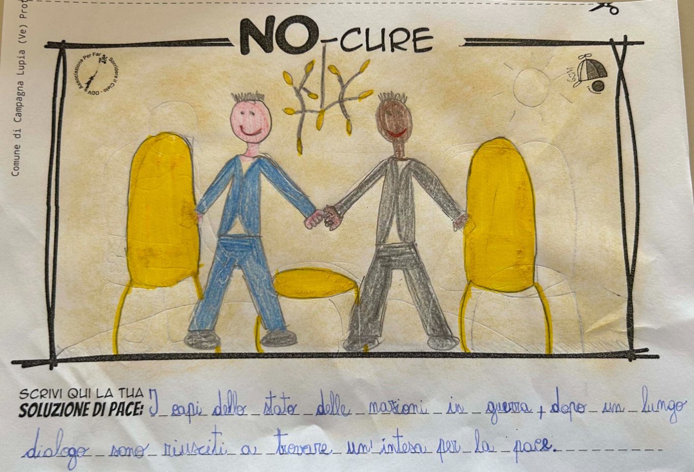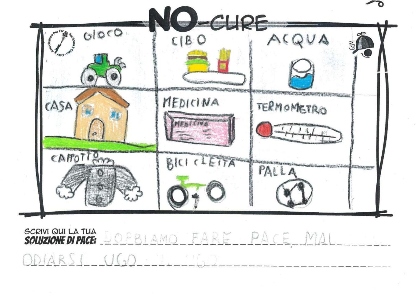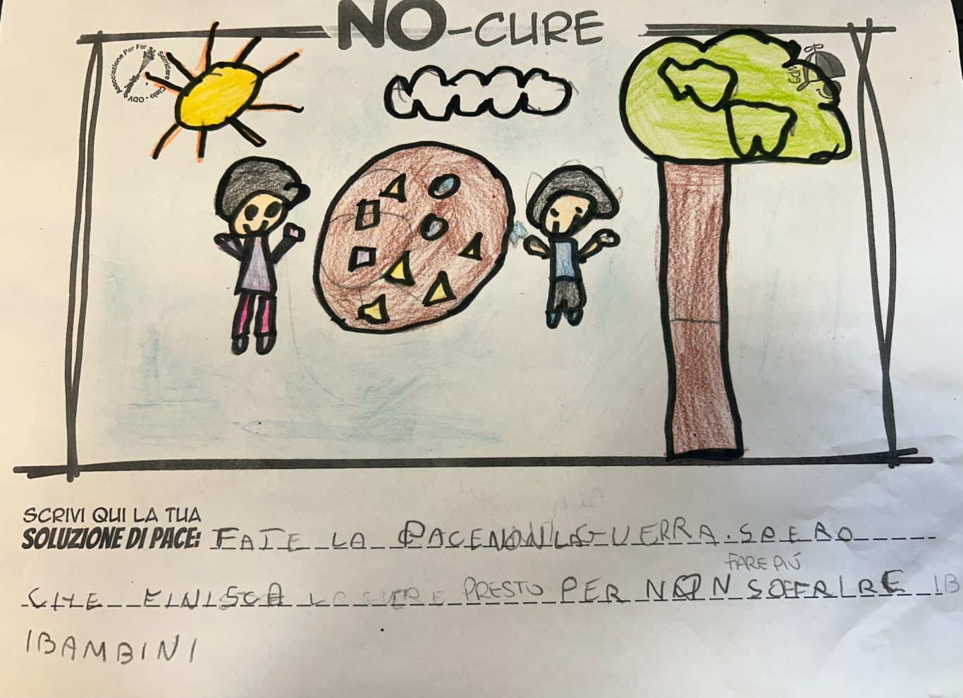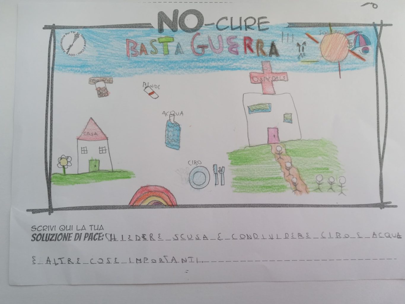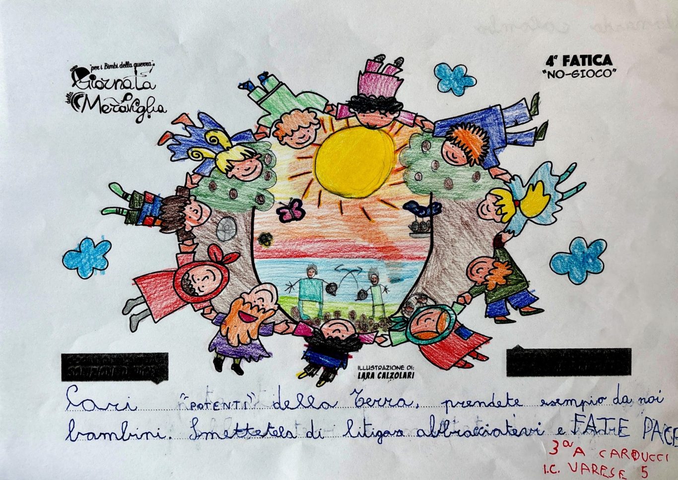 L’opera di sensibilizzazione si si esprime concretamente con la creazione di un DISEGNO DELLA MERAVIGLIA che andrà ad aiutare una delle 12 fatiche. Allo stesso modo chiederemo a tutti i partecipanti di andare a scrivere una “Soluzione di Pace” che possa aiutare anch’essa una delle 12 fatiche dei Bambini della guerra.