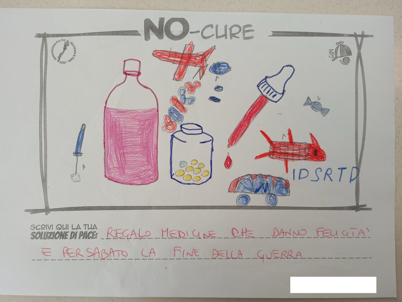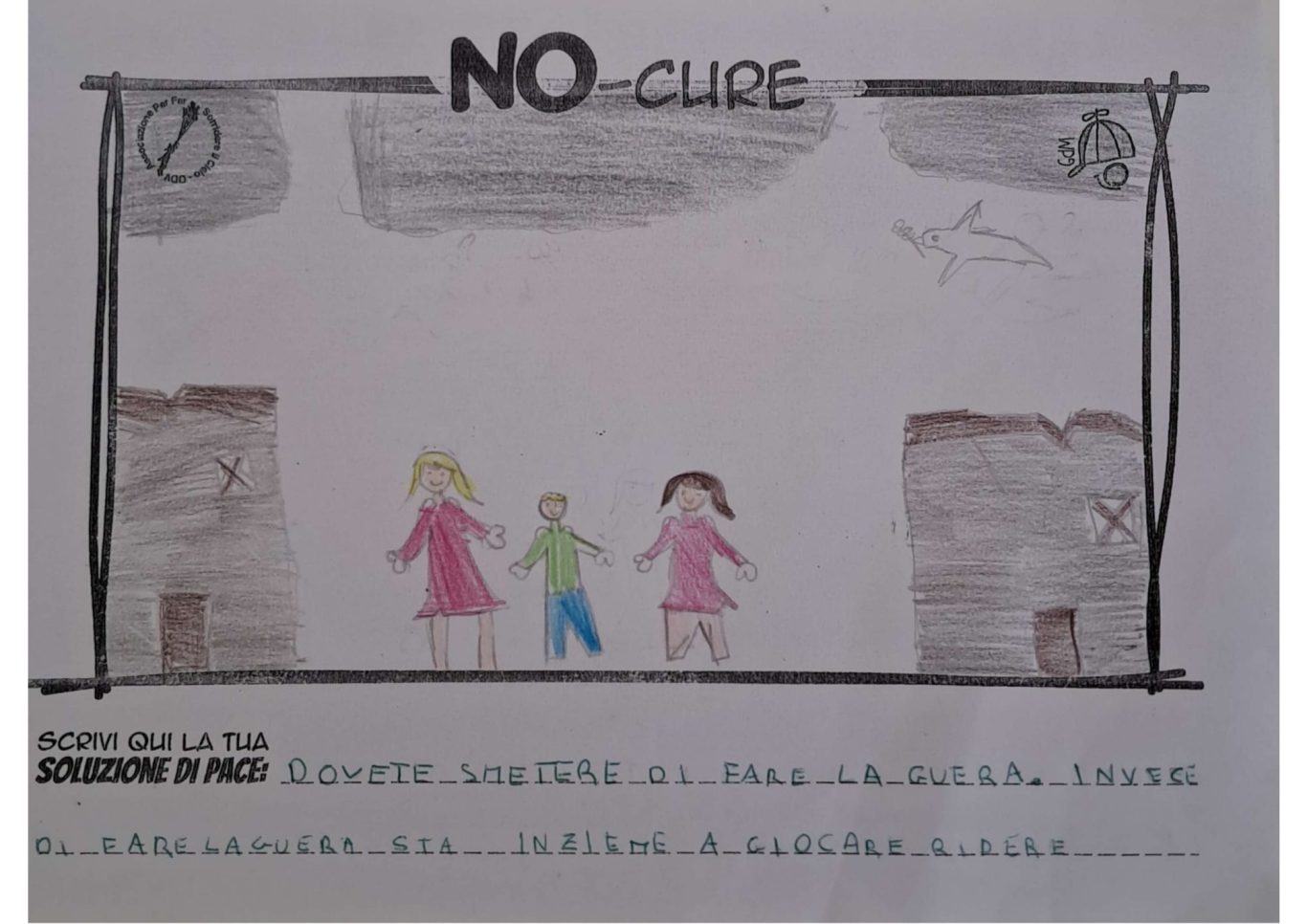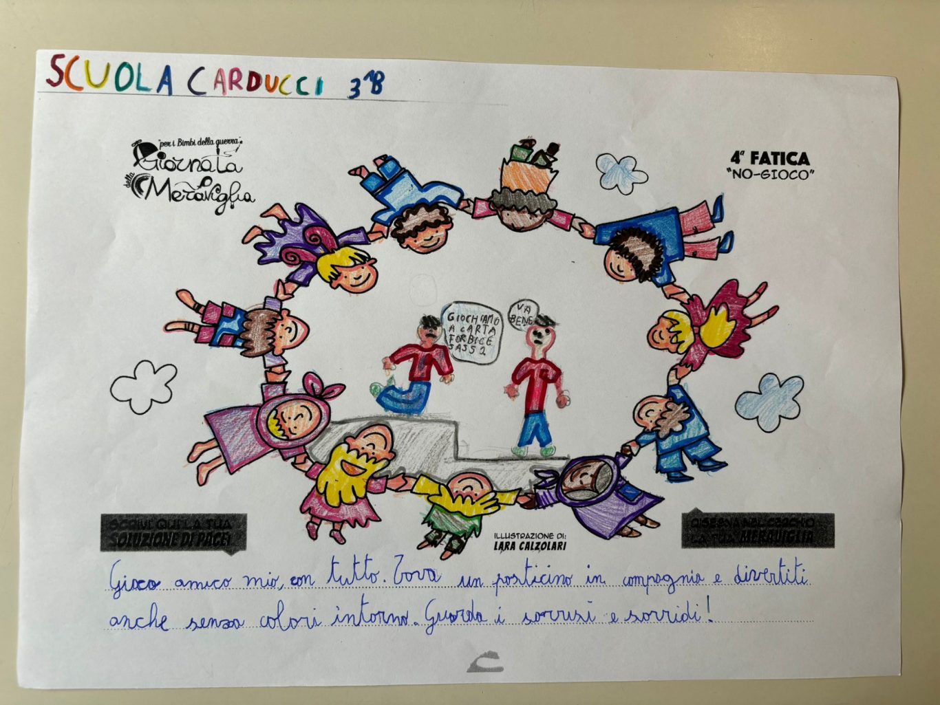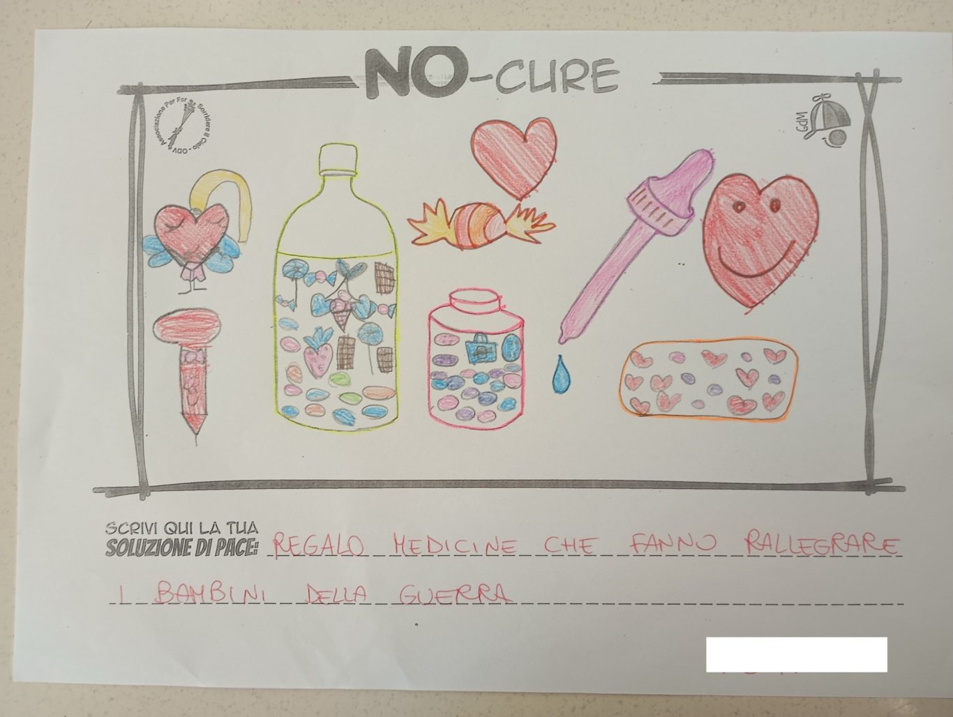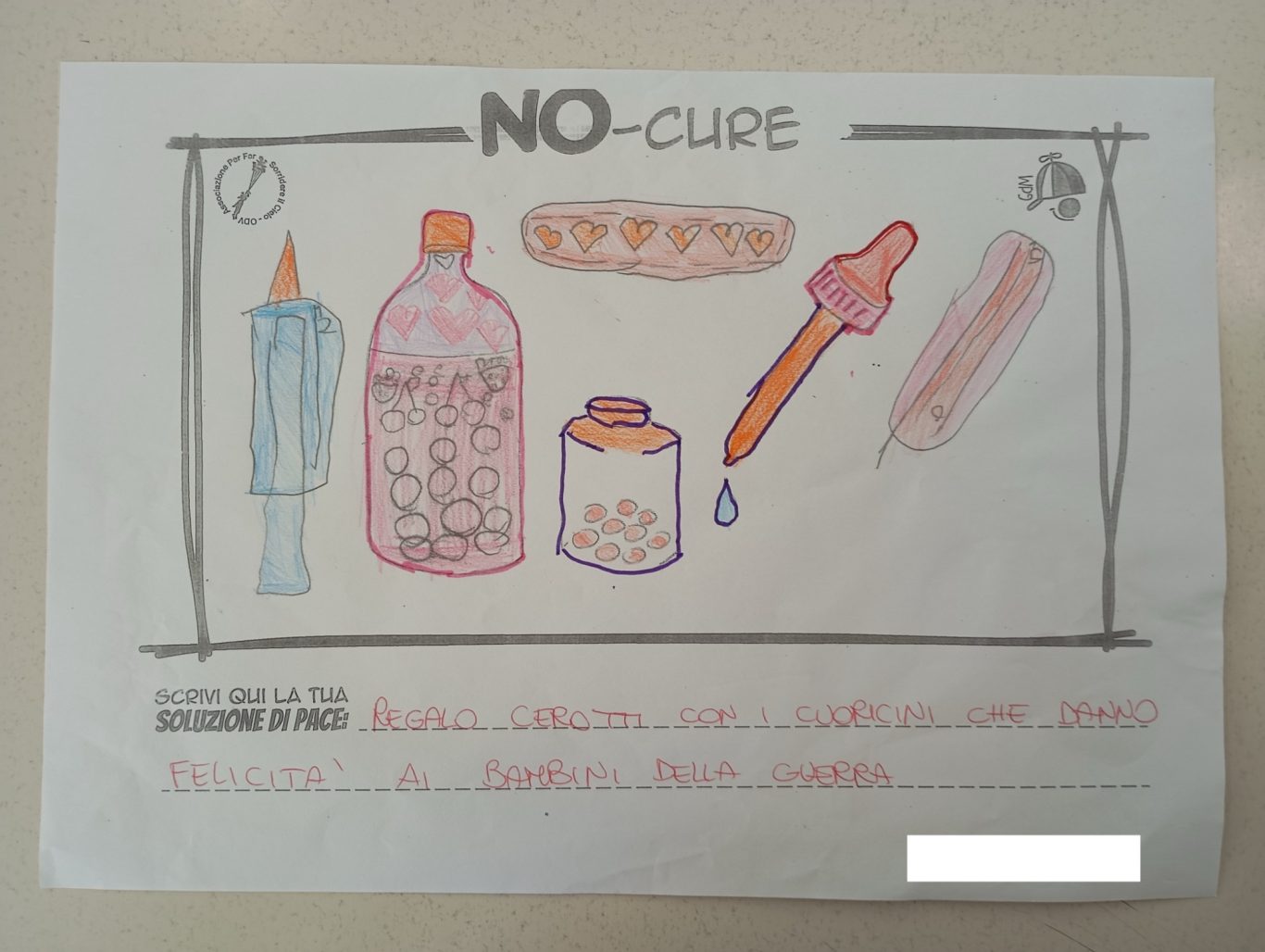 L’opera di sensibilizzazione si si esprime concretamente con la creazione di un DISEGNO DELLA MERAVIGLIA che andrà ad aiutare una delle 12 fatiche. Allo stesso modo chiederemo a tutti i partecipanti di andare a scrivere una “Soluzione di Pace” che possa aiutare anch’essa una delle 12 fatiche dei Bambini della guerra.