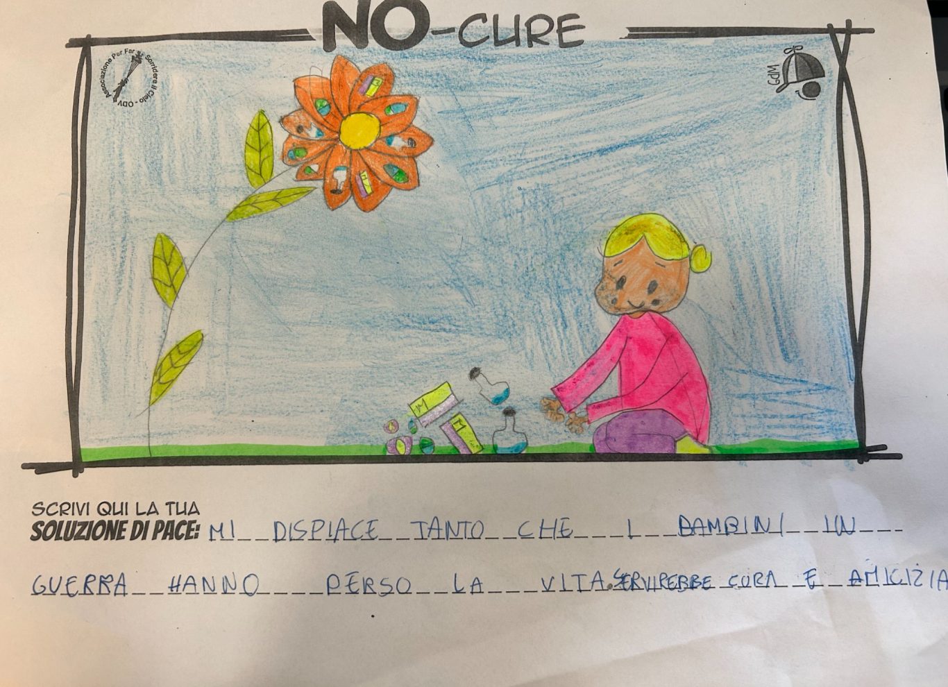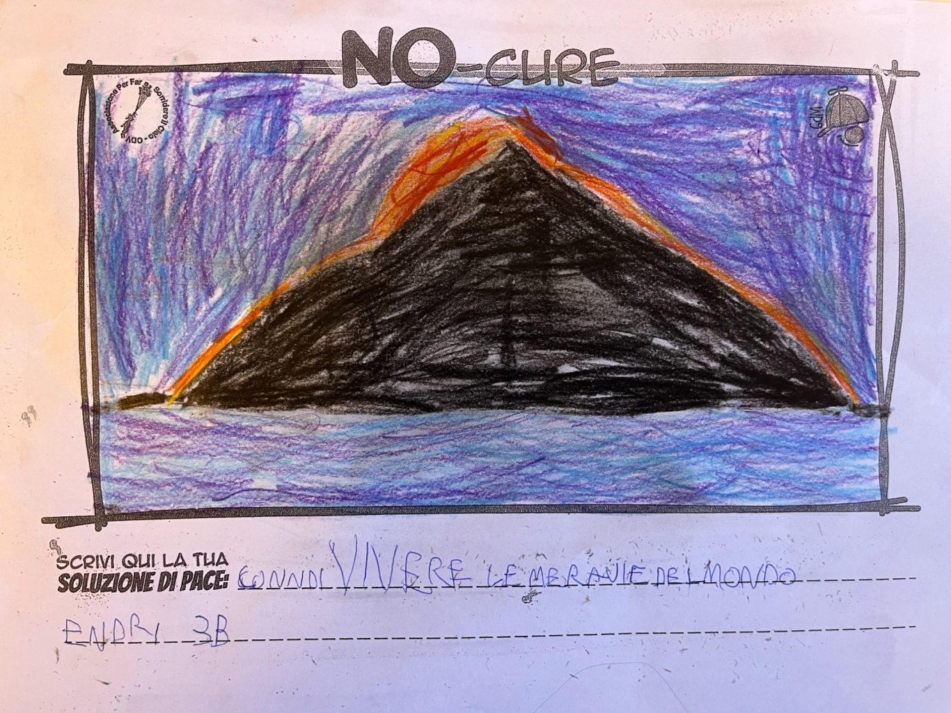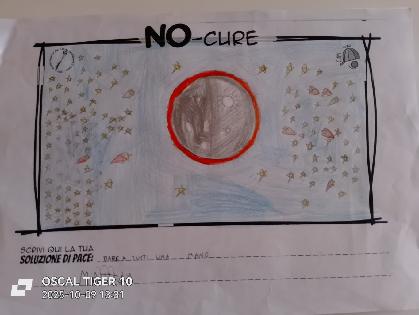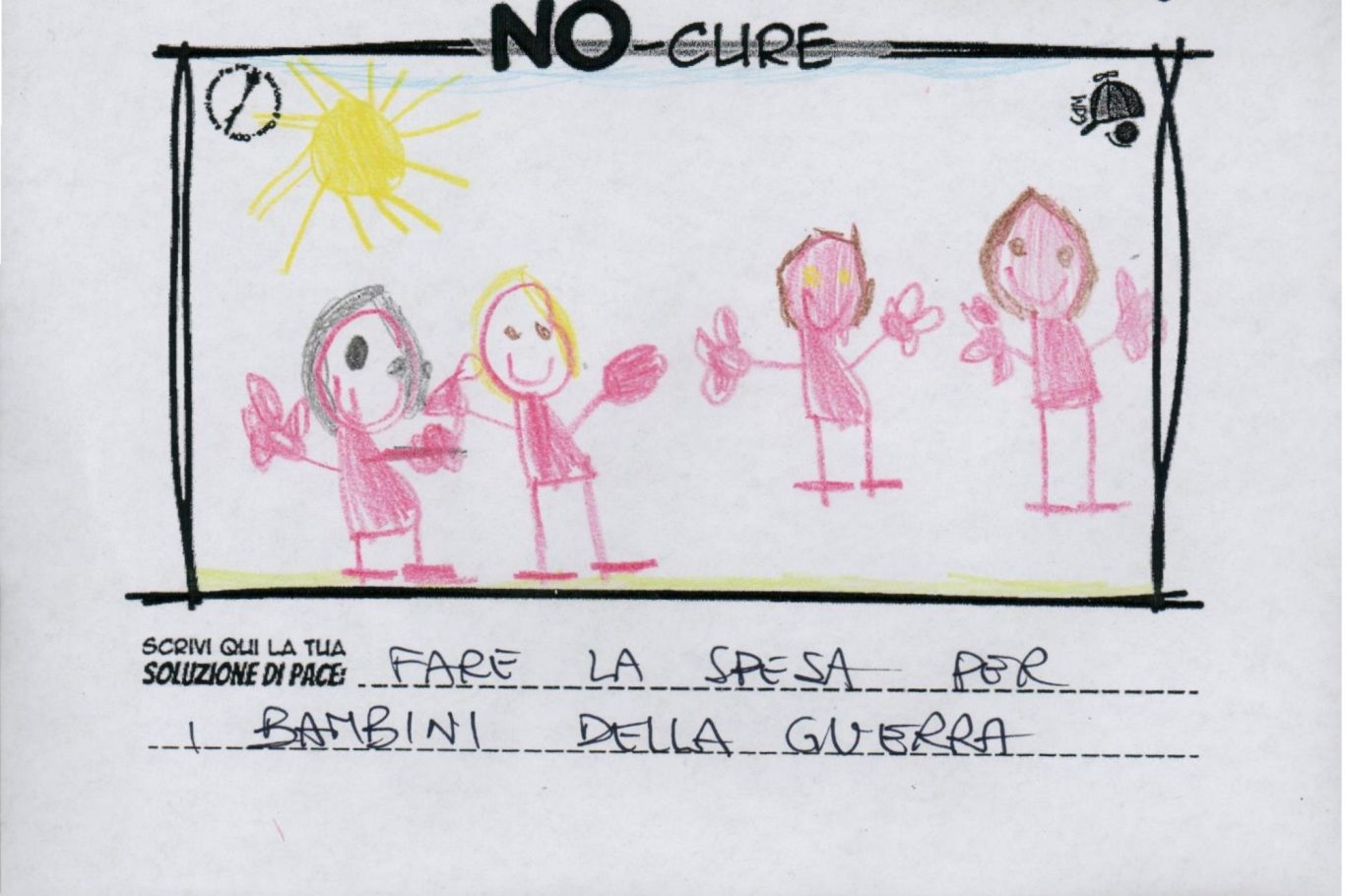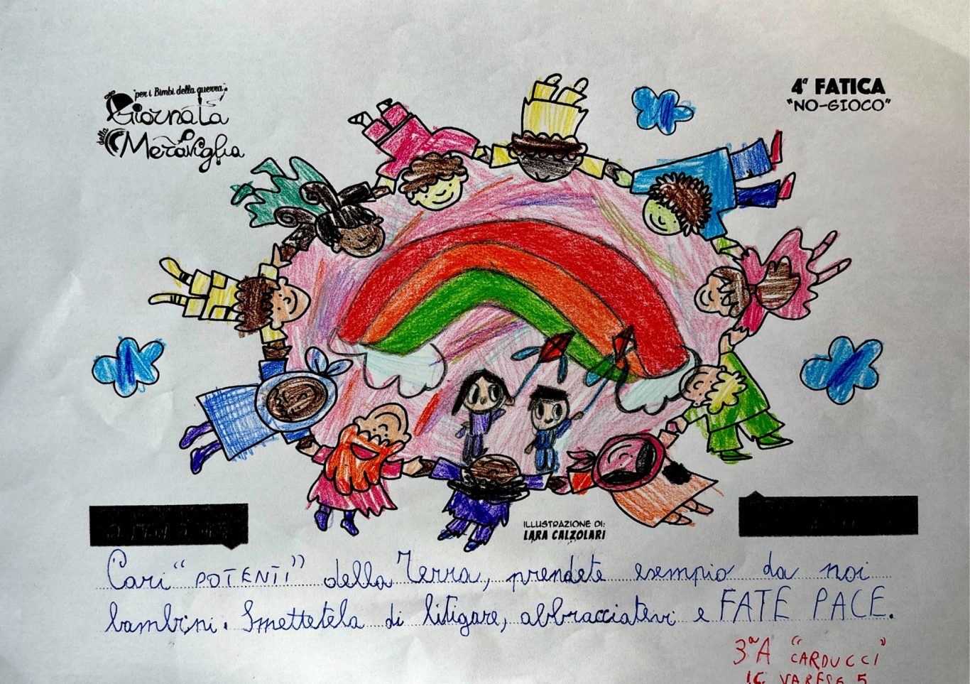 L’opera di sensibilizzazione si si esprime concretamente con la creazione di un DISEGNO DELLA MERAVIGLIA che andrà ad aiutare una delle 12 fatiche. Allo stesso modo chiederemo a tutti i partecipanti di andare a scrivere una “Soluzione di Pace” che possa aiutare anch’essa una delle 12 fatiche dei Bambini della guerra.