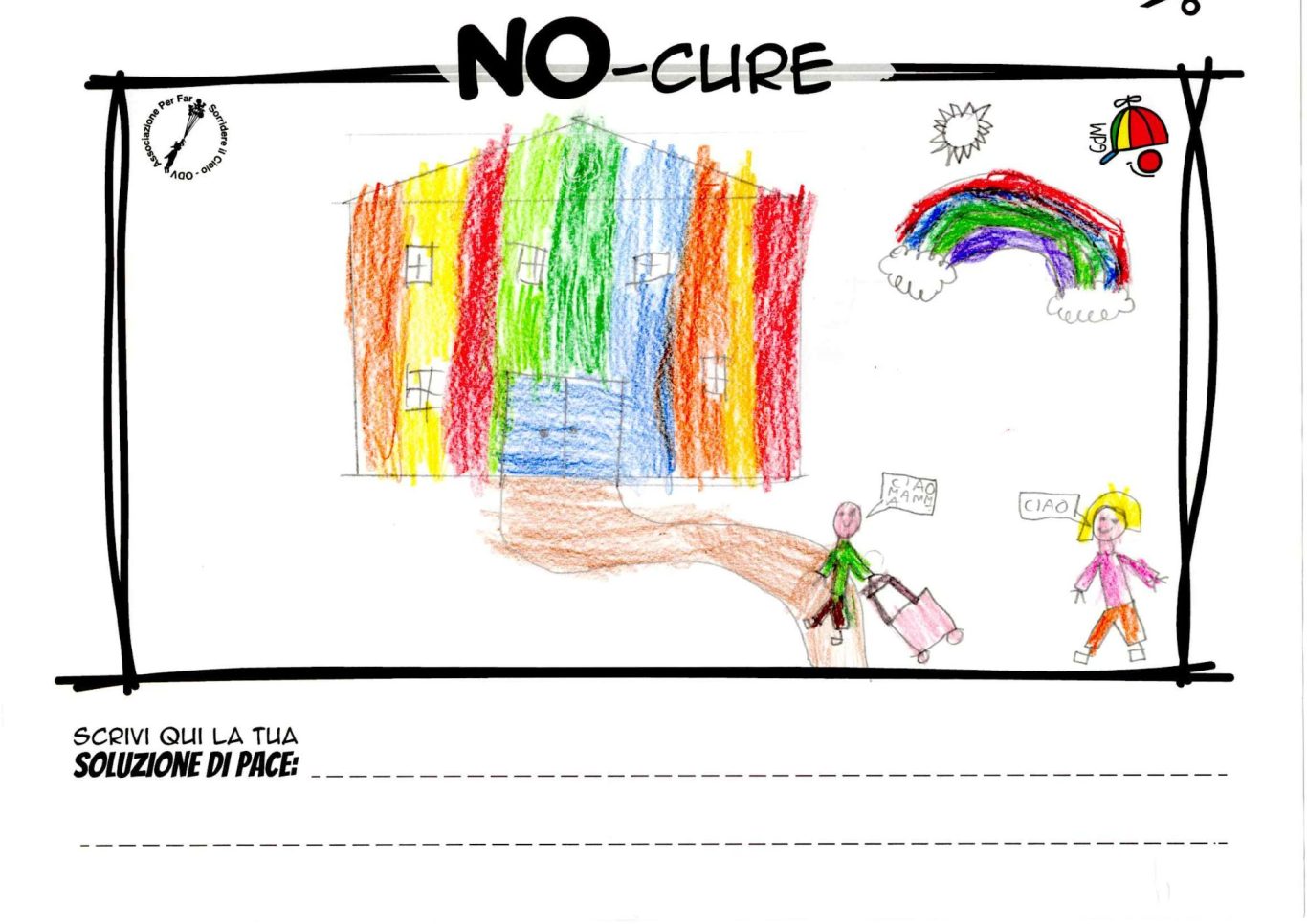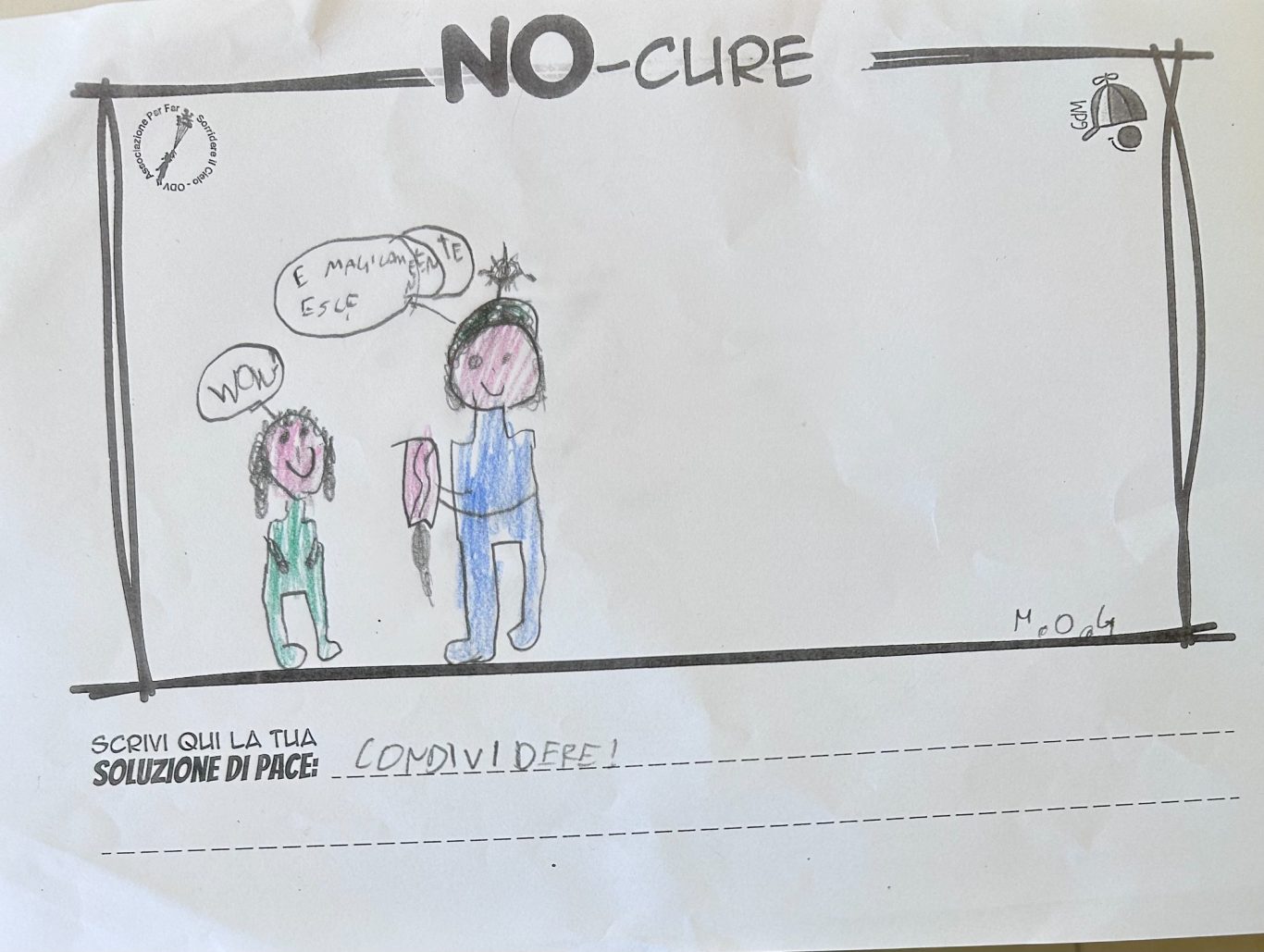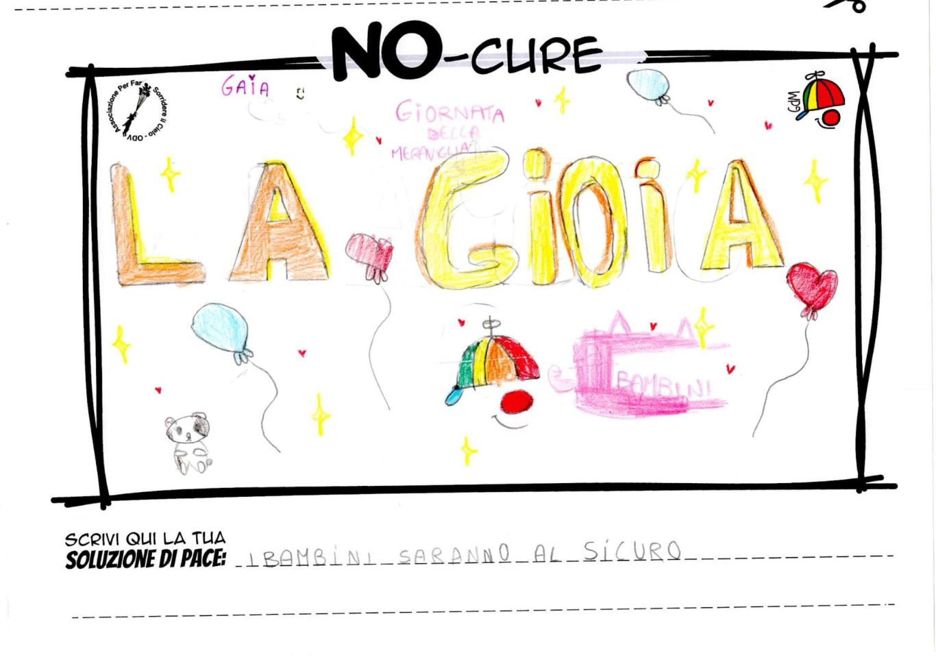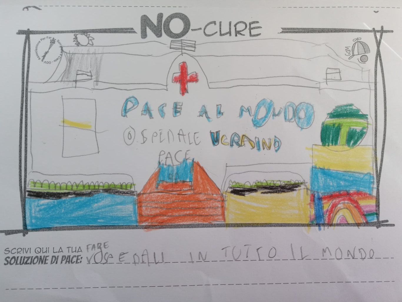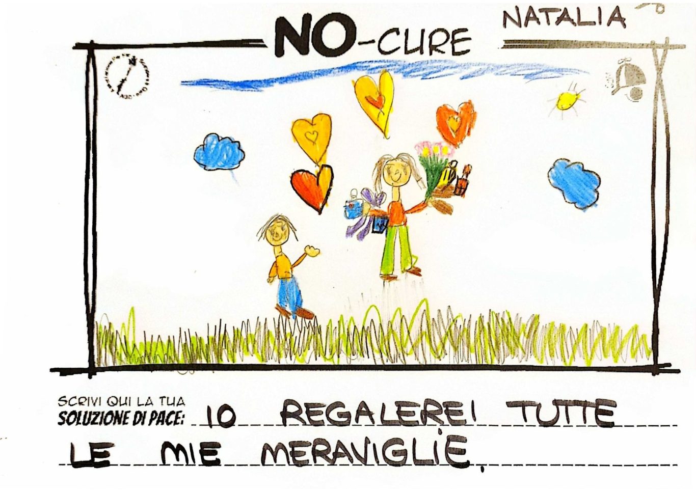 L’opera di sensibilizzazione si si esprime concretamente con la creazione di un DISEGNO DELLA MERAVIGLIA che andrà ad aiutare una delle 12 fatiche. Allo stesso modo chiederemo a tutti i partecipanti di andare a scrivere una “Soluzione di Pace” che possa aiutare anch’essa una delle 12 fatiche dei Bambini della guerra.