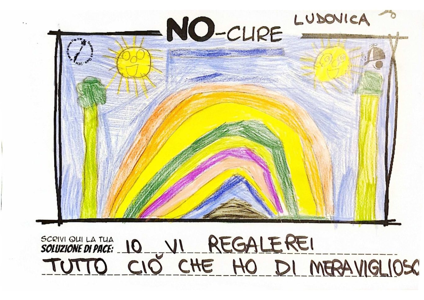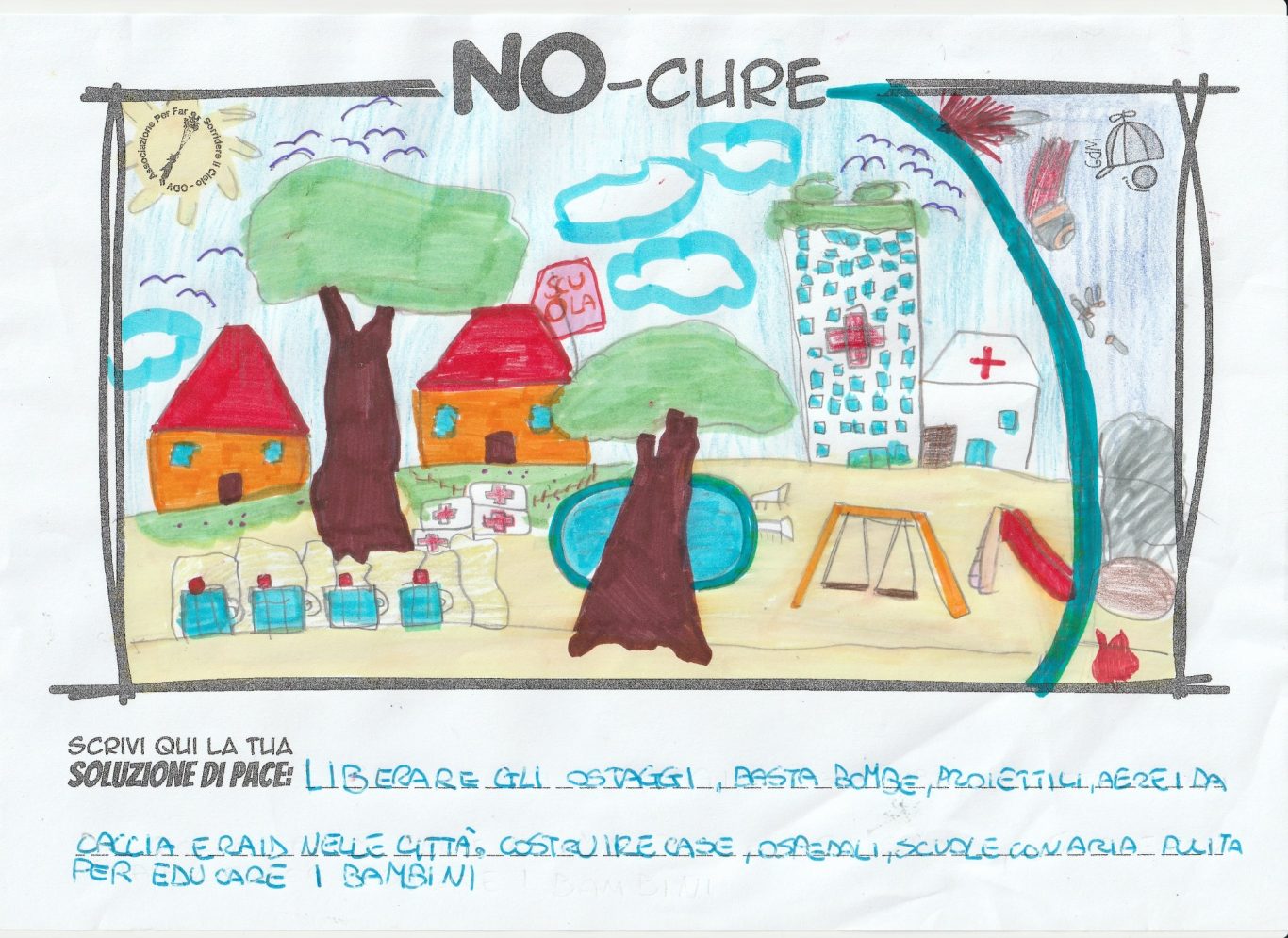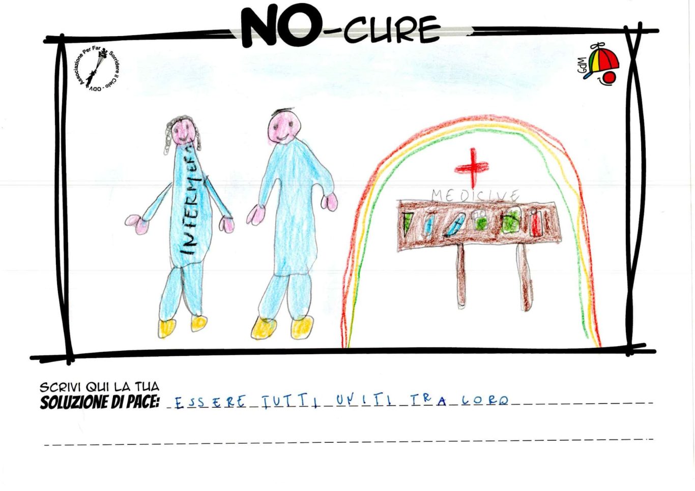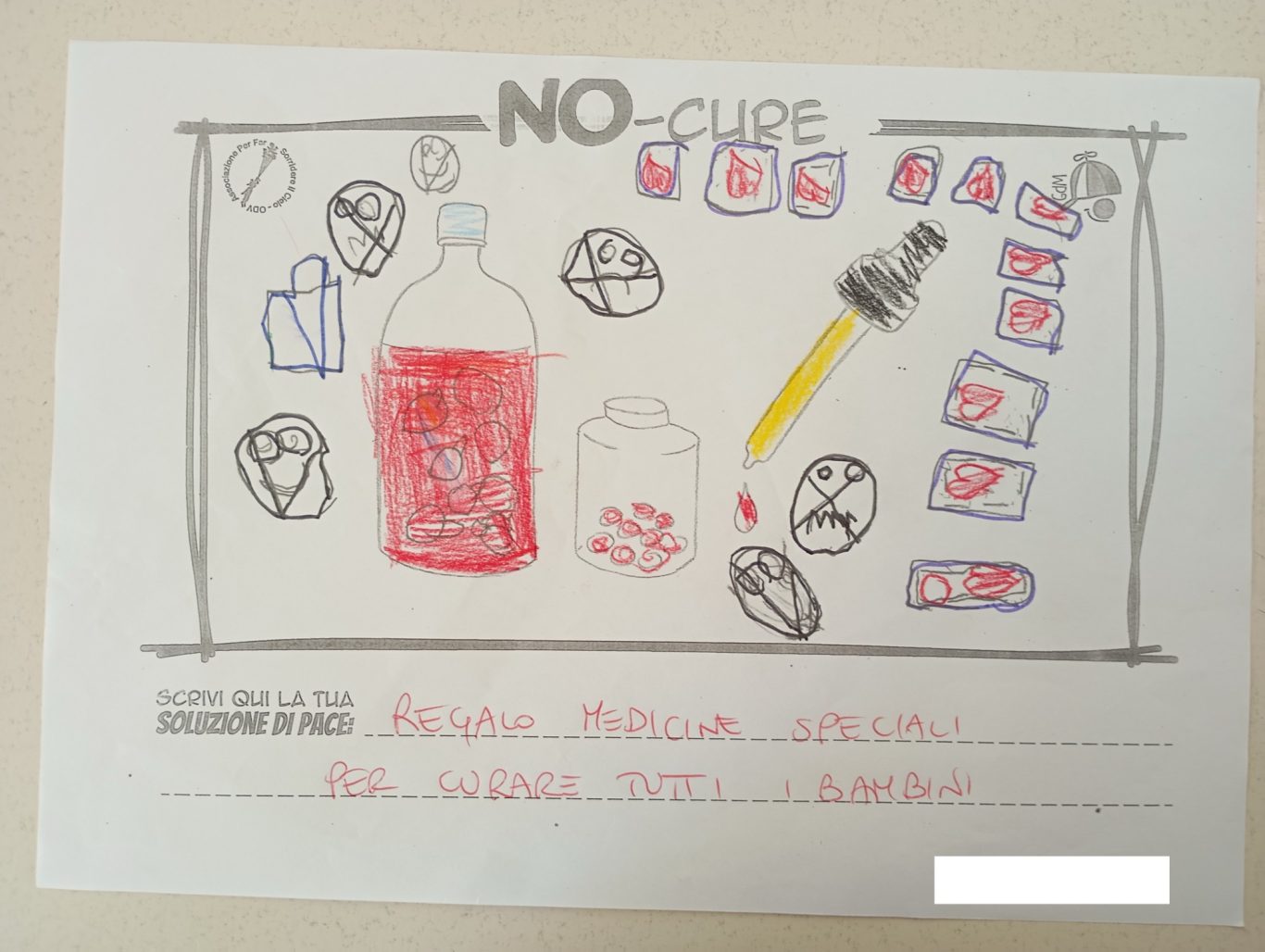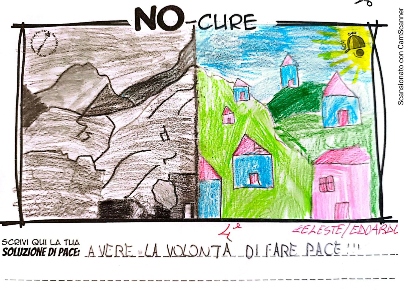 L’opera di sensibilizzazione si si esprime concretamente con la creazione di un DISEGNO DELLA MERAVIGLIA che andrà ad aiutare una delle 12 fatiche. Allo stesso modo chiederemo a tutti i partecipanti di andare a scrivere una “Soluzione di Pace” che possa aiutare anch’essa una delle 12 fatiche dei Bambini della guerra.