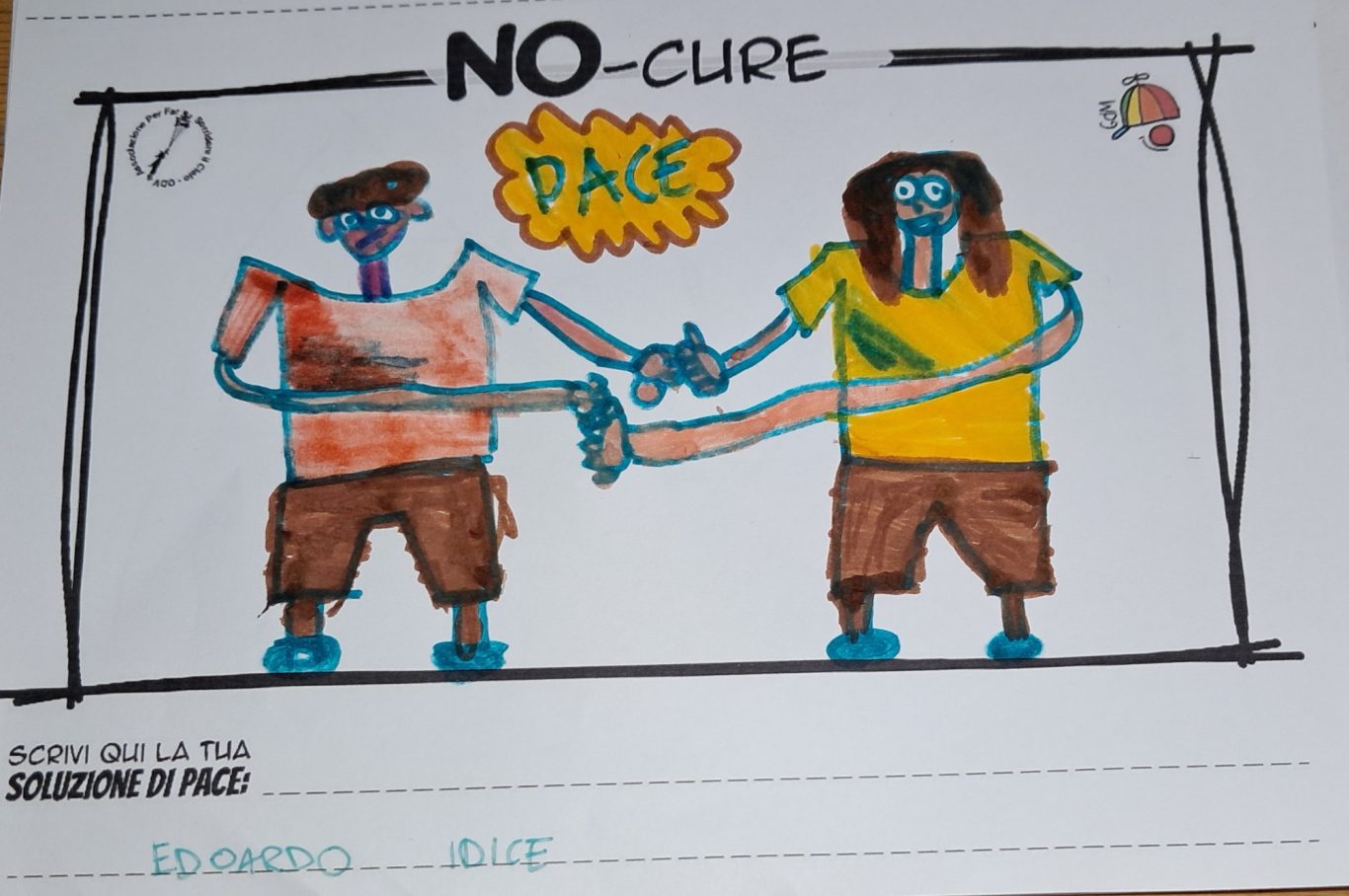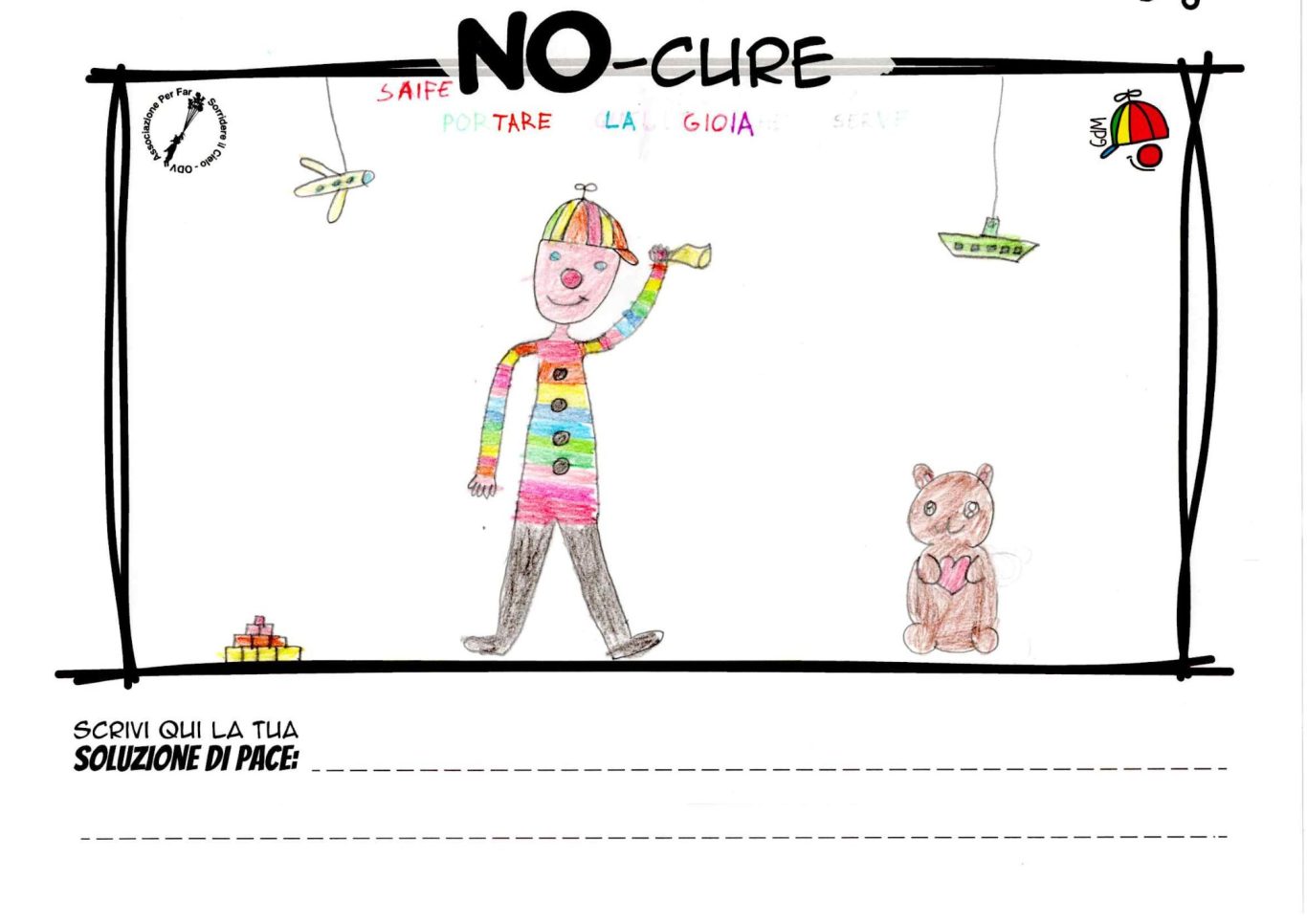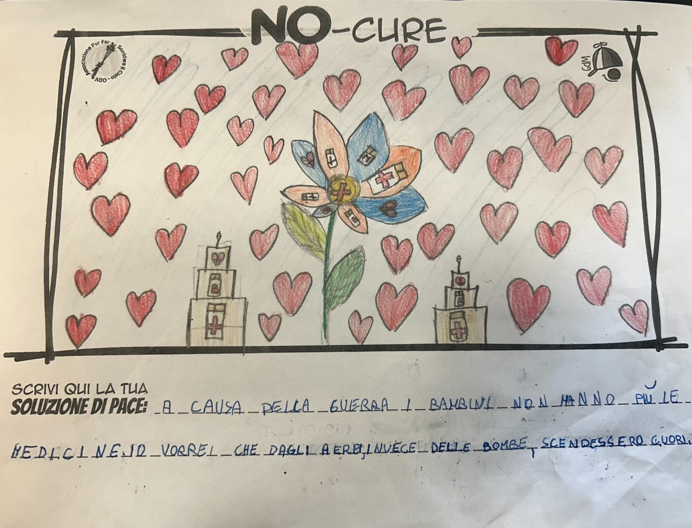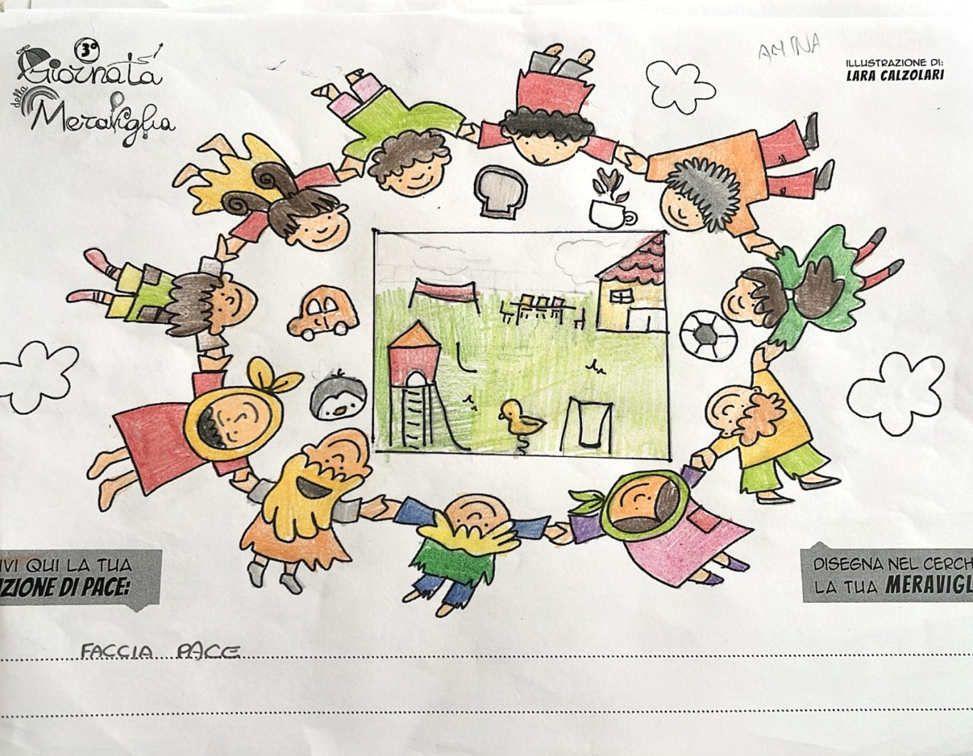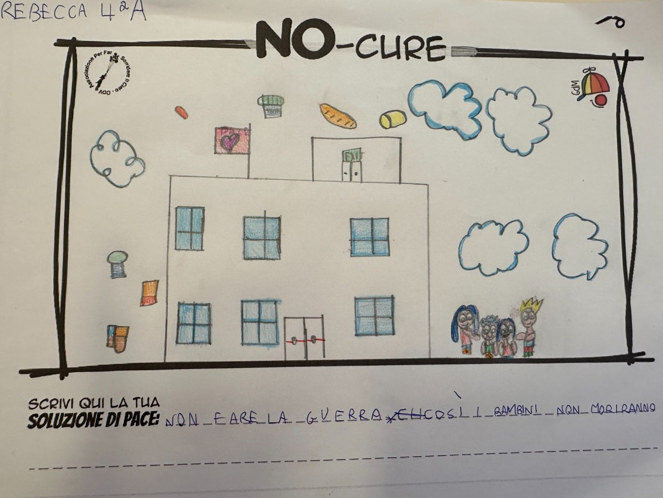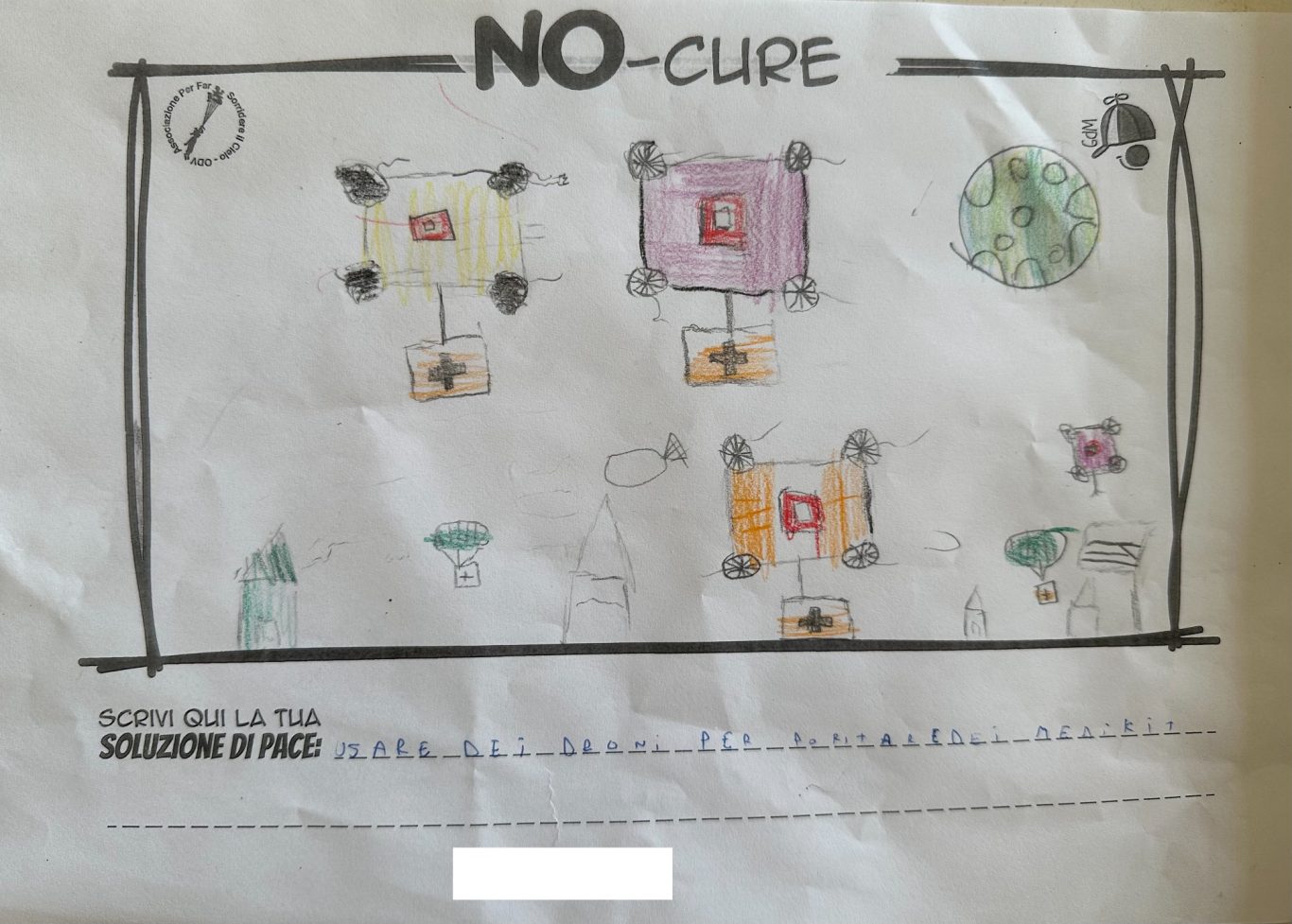 L’opera di sensibilizzazione si si esprime concretamente con la creazione di un DISEGNO DELLA MERAVIGLIA che andrà ad aiutare una delle 12 fatiche. Allo stesso modo chiederemo a tutti i partecipanti di andare a scrivere una “Soluzione di Pace” che possa aiutare anch’essa una delle 12 fatiche dei Bambini della guerra.