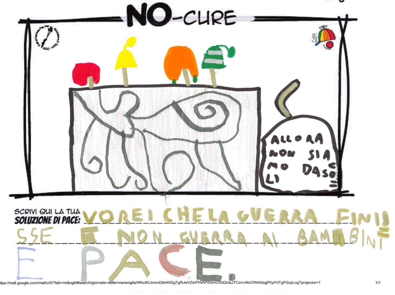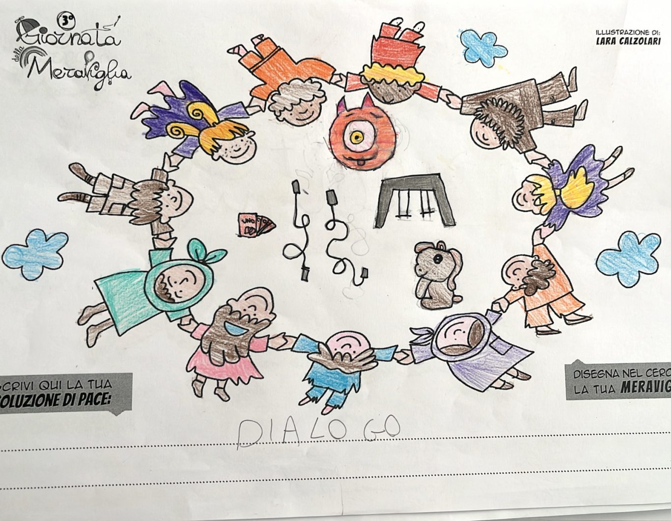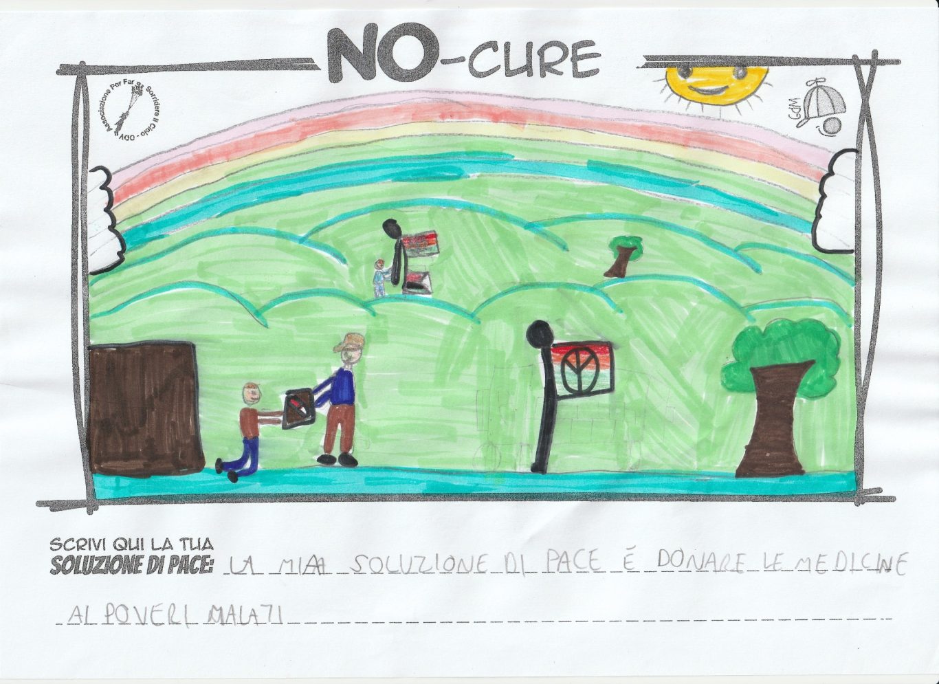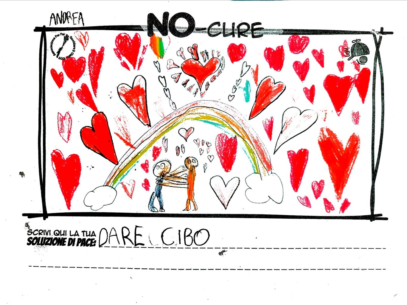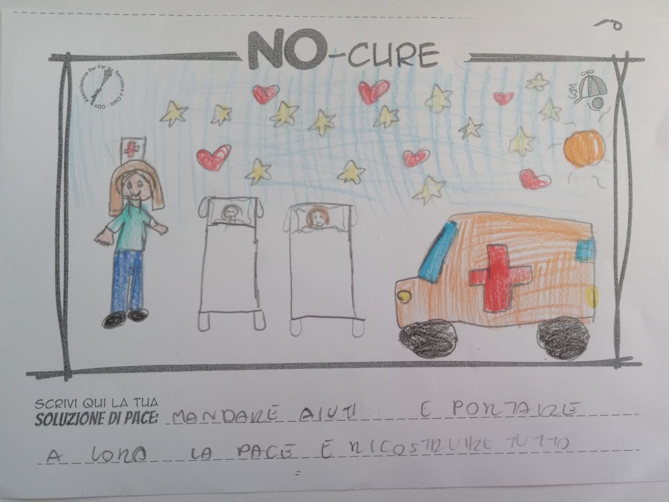 L’opera di sensibilizzazione si si esprime concretamente con la creazione di un DISEGNO DELLA MERAVIGLIA che andrà ad aiutare una delle 12 fatiche. Allo stesso modo chiederemo a tutti i partecipanti di andare a scrivere una “Soluzione di Pace” che possa aiutare anch’essa una delle 12 fatiche dei Bambini della guerra.