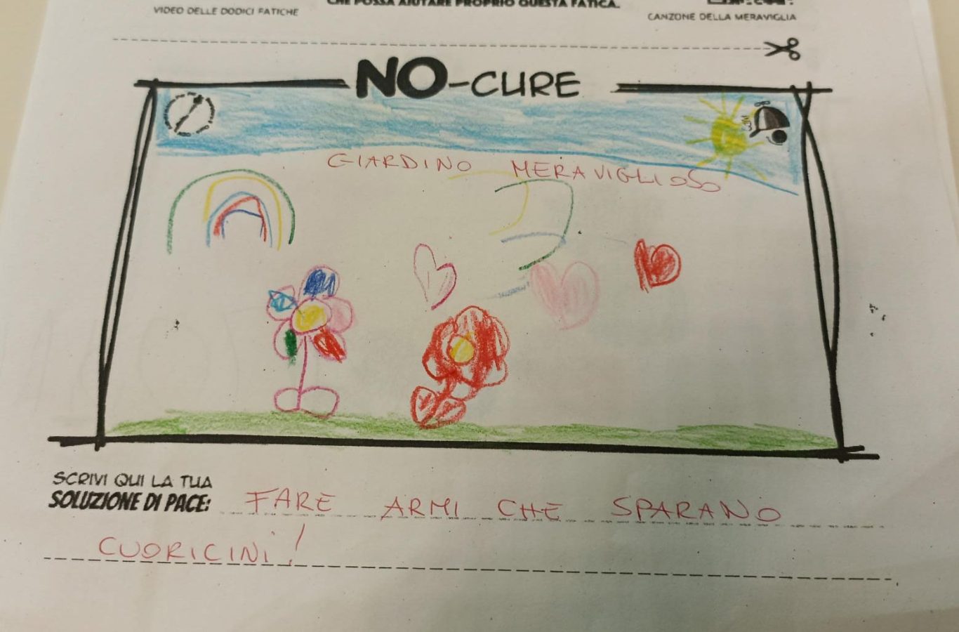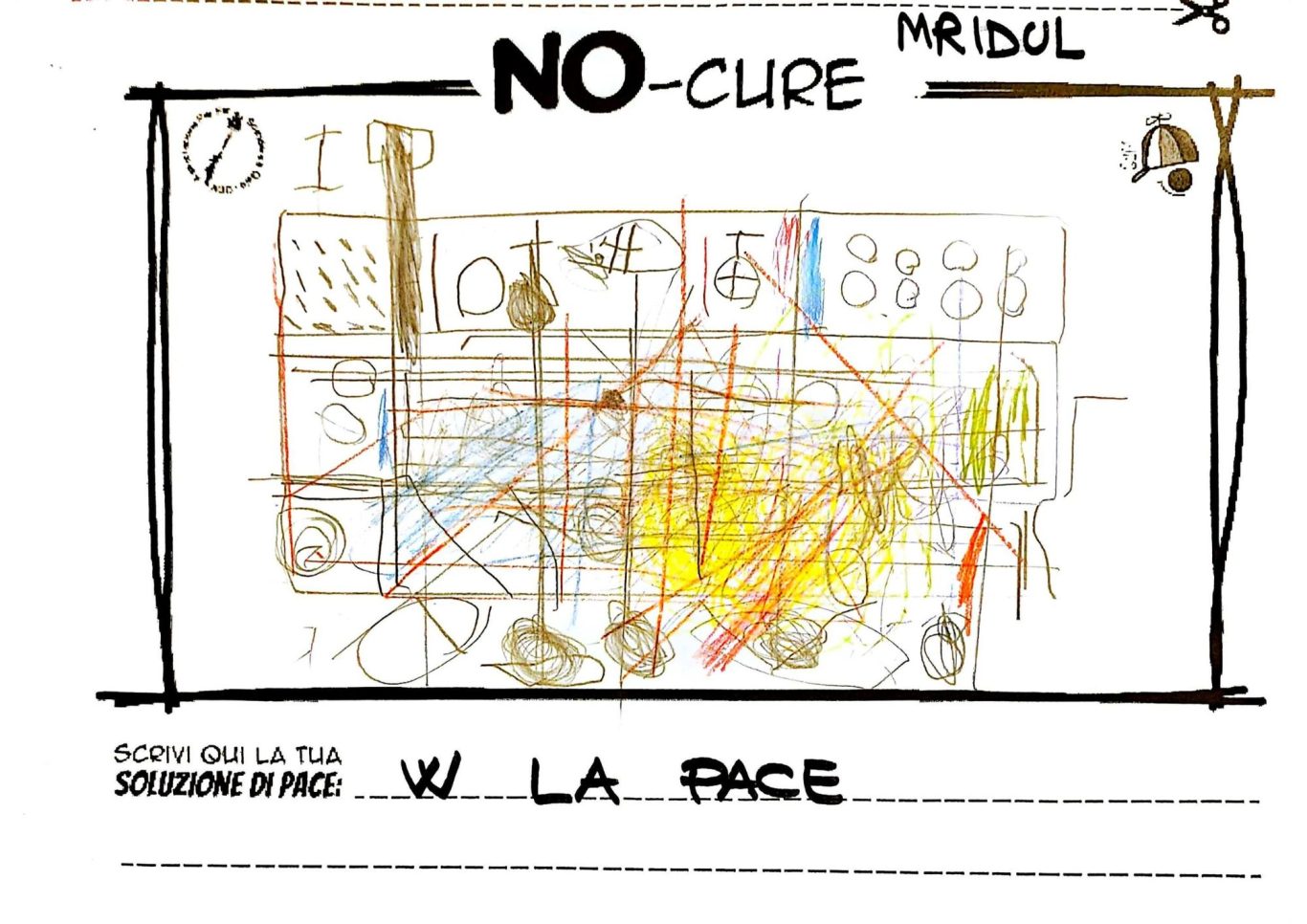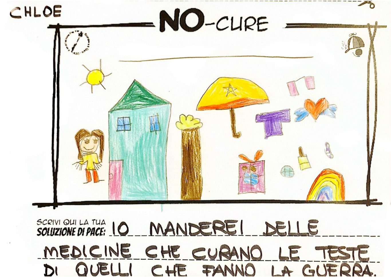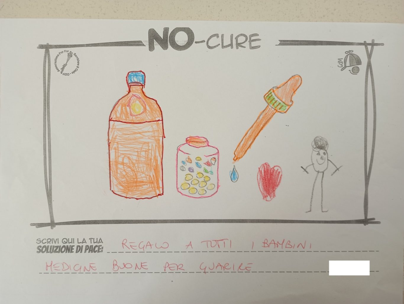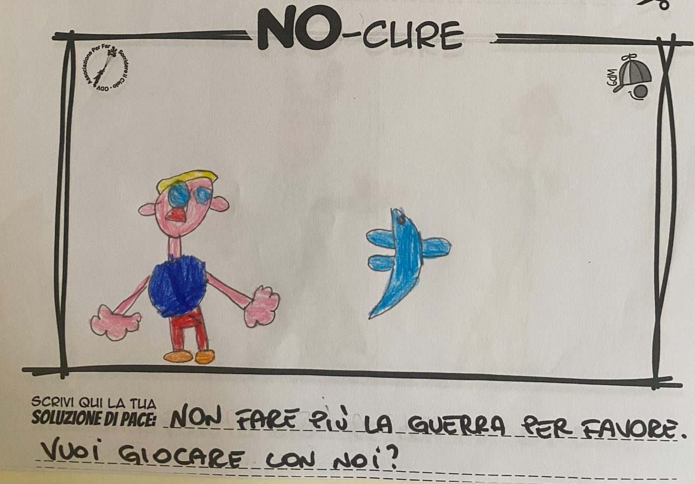 L’opera di sensibilizzazione si si esprime concretamente con la creazione di un DISEGNO DELLA MERAVIGLIA che andrà ad aiutare una delle 12 fatiche. Allo stesso modo chiederemo a tutti i partecipanti di andare a scrivere una “Soluzione di Pace” che possa aiutare anch’essa una delle 12 fatiche dei Bambini della guerra.