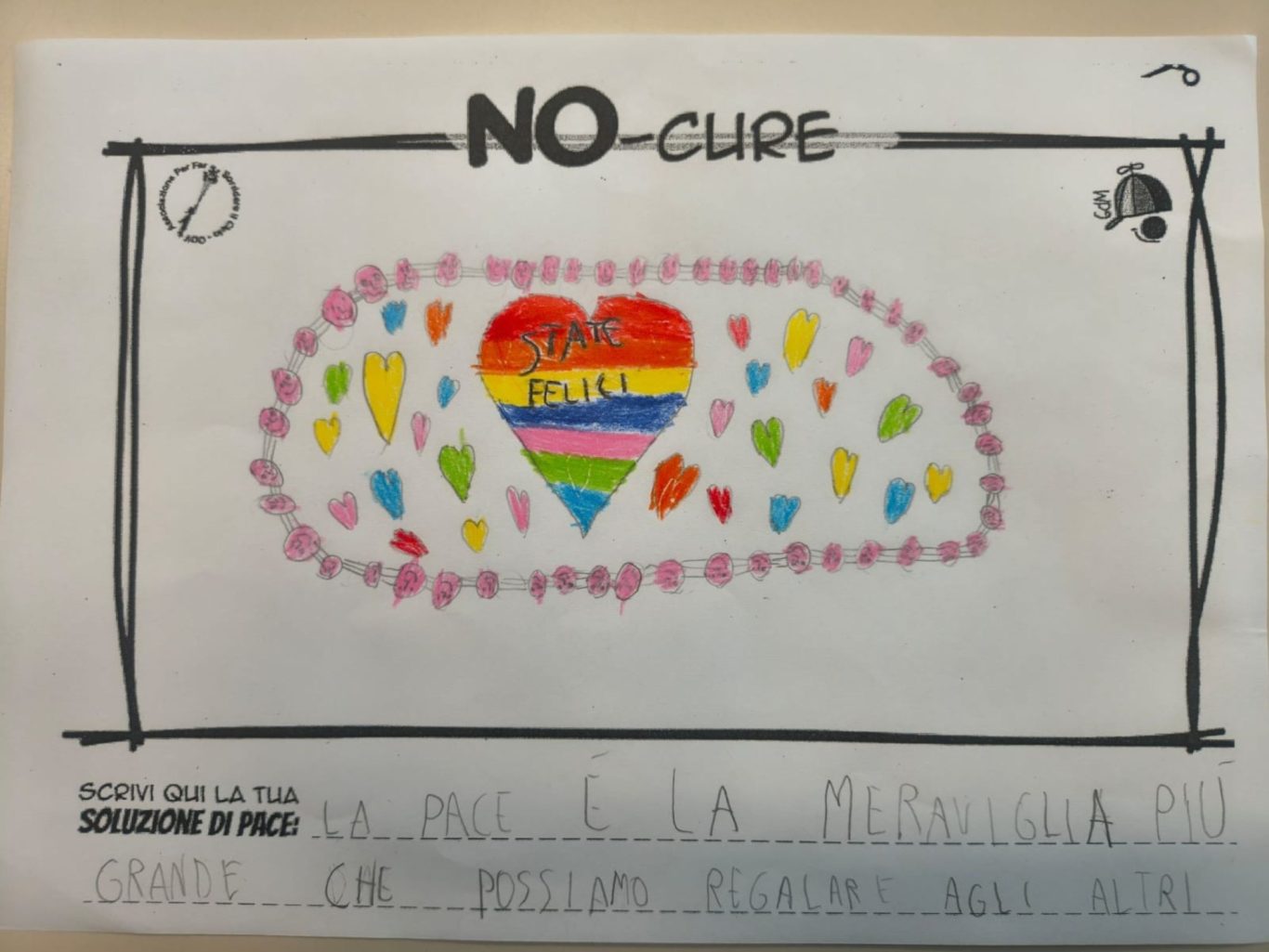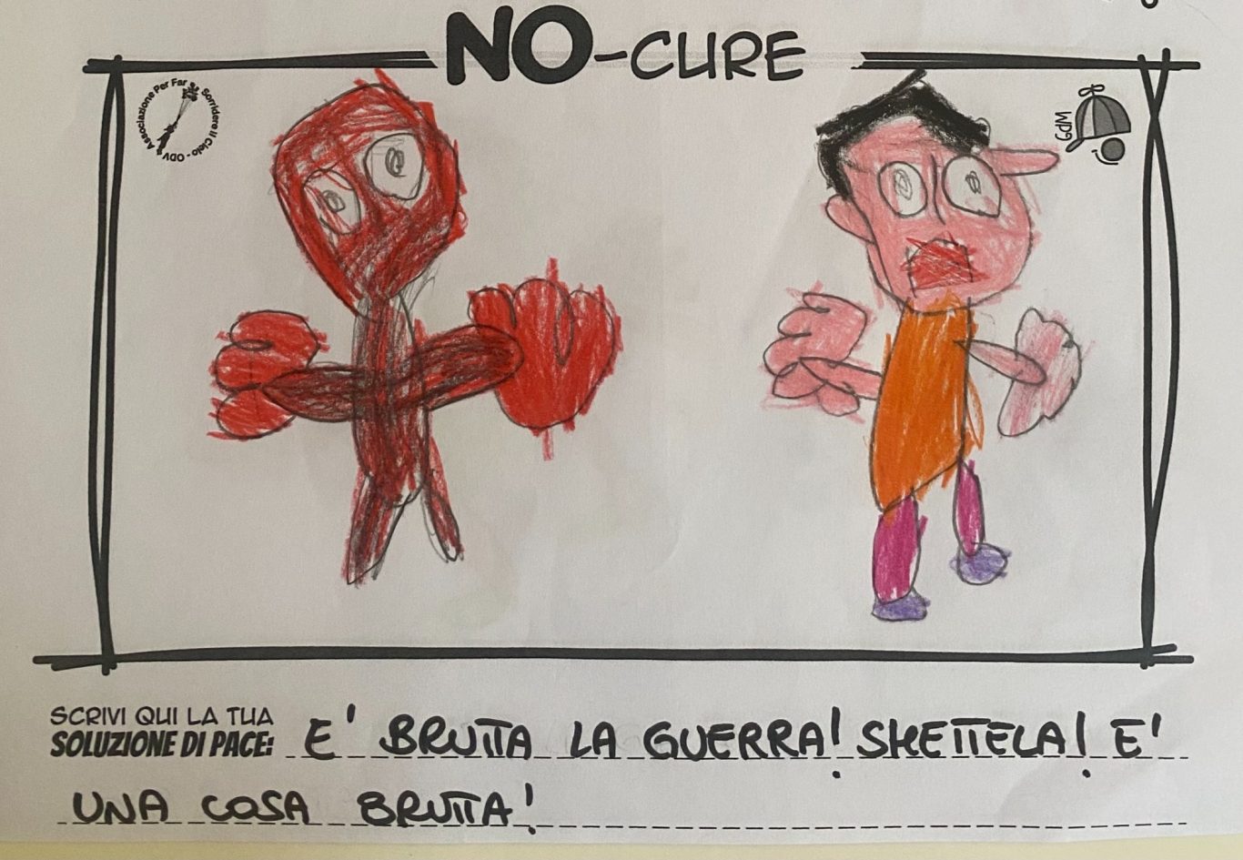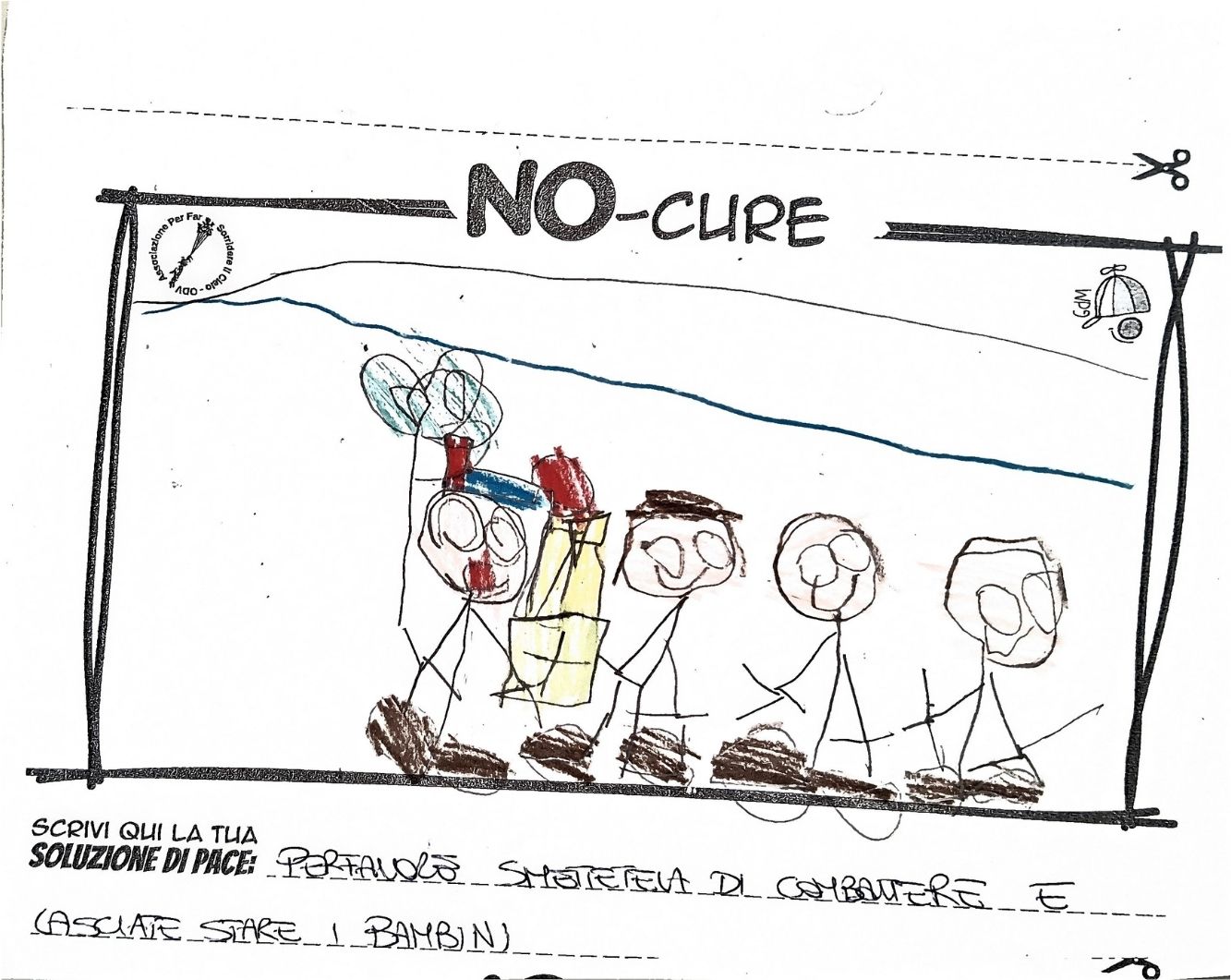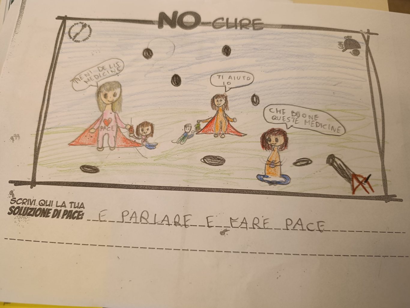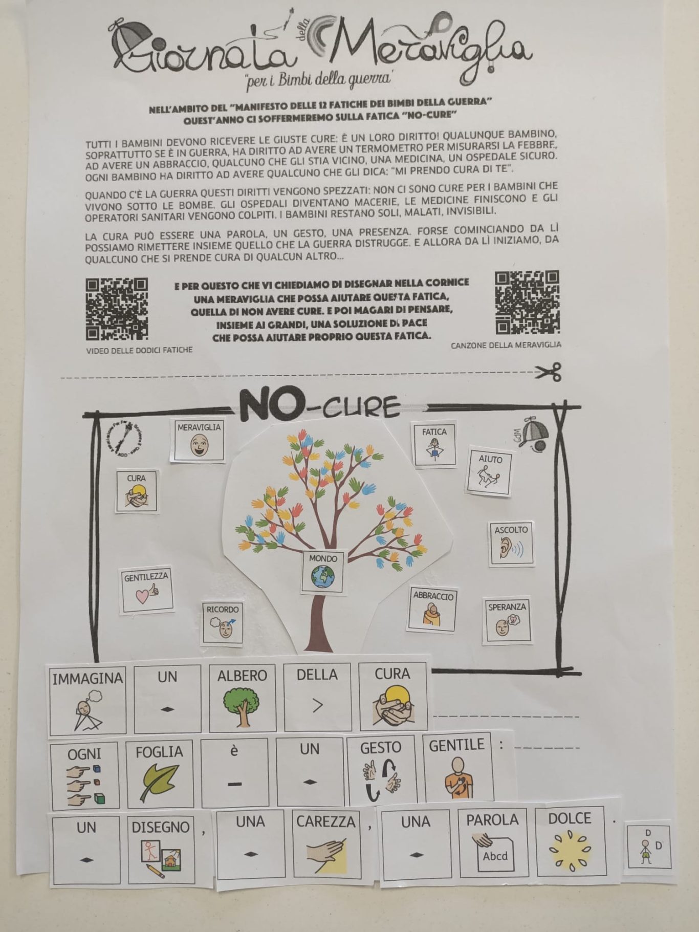 L’opera di sensibilizzazione si si esprime concretamente con la creazione di un DISEGNO DELLA MERAVIGLIA che andrà ad aiutare una delle 12 fatiche. Allo stesso modo chiederemo a tutti i partecipanti di andare a scrivere una “Soluzione di Pace” che possa aiutare anch’essa una delle 12 fatiche dei Bambini della guerra.
