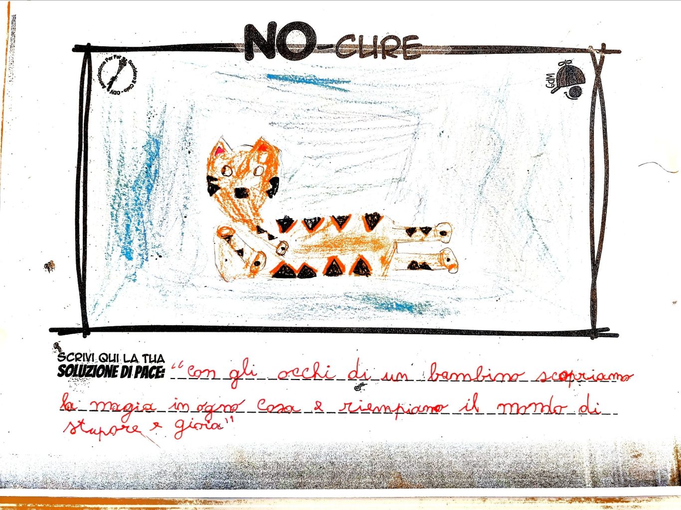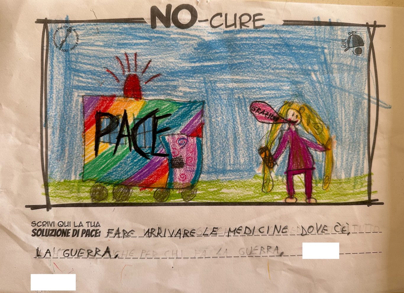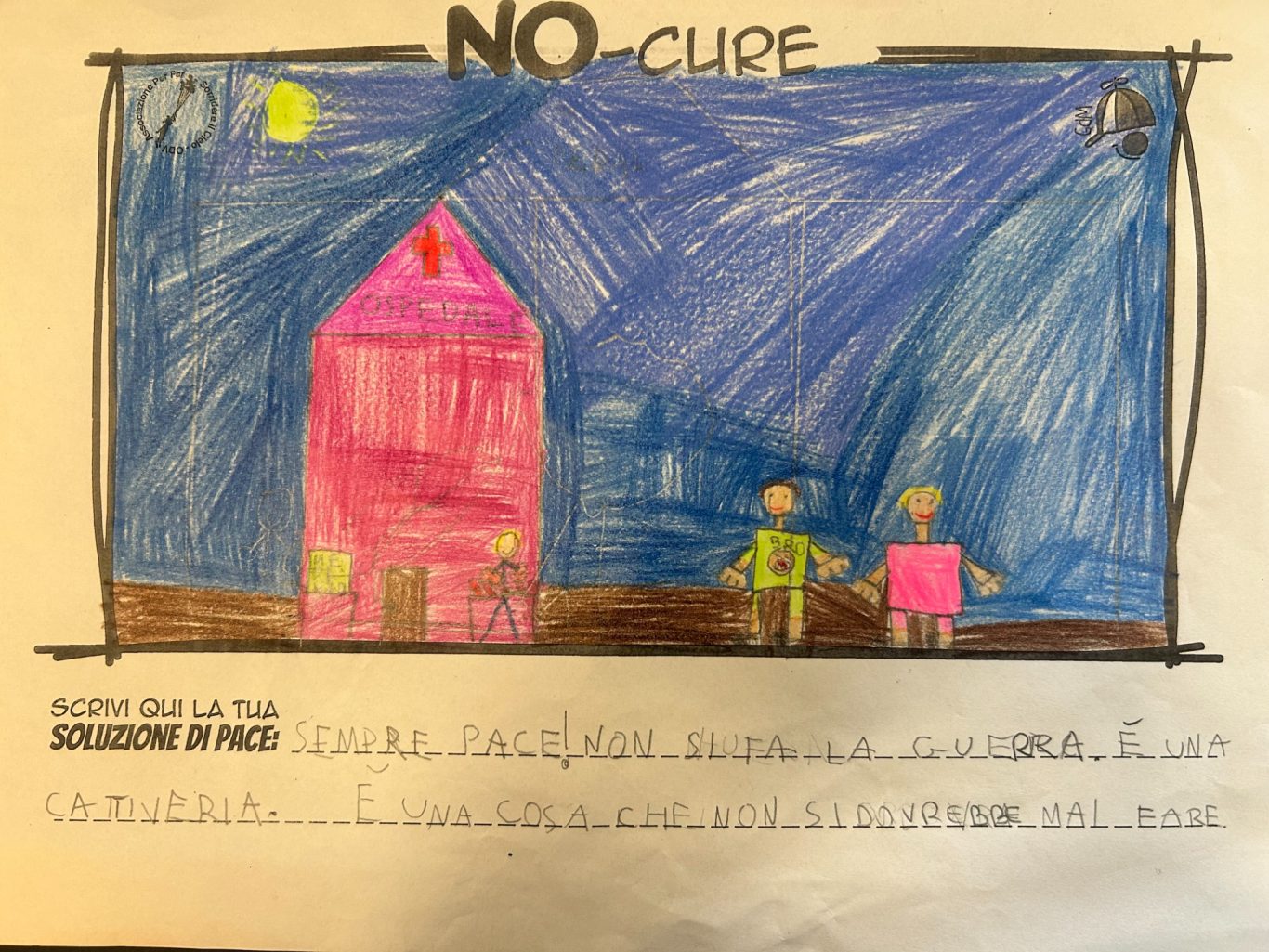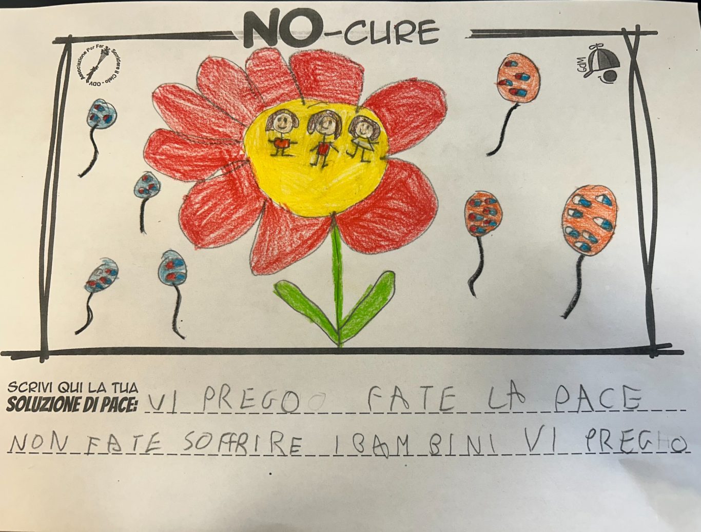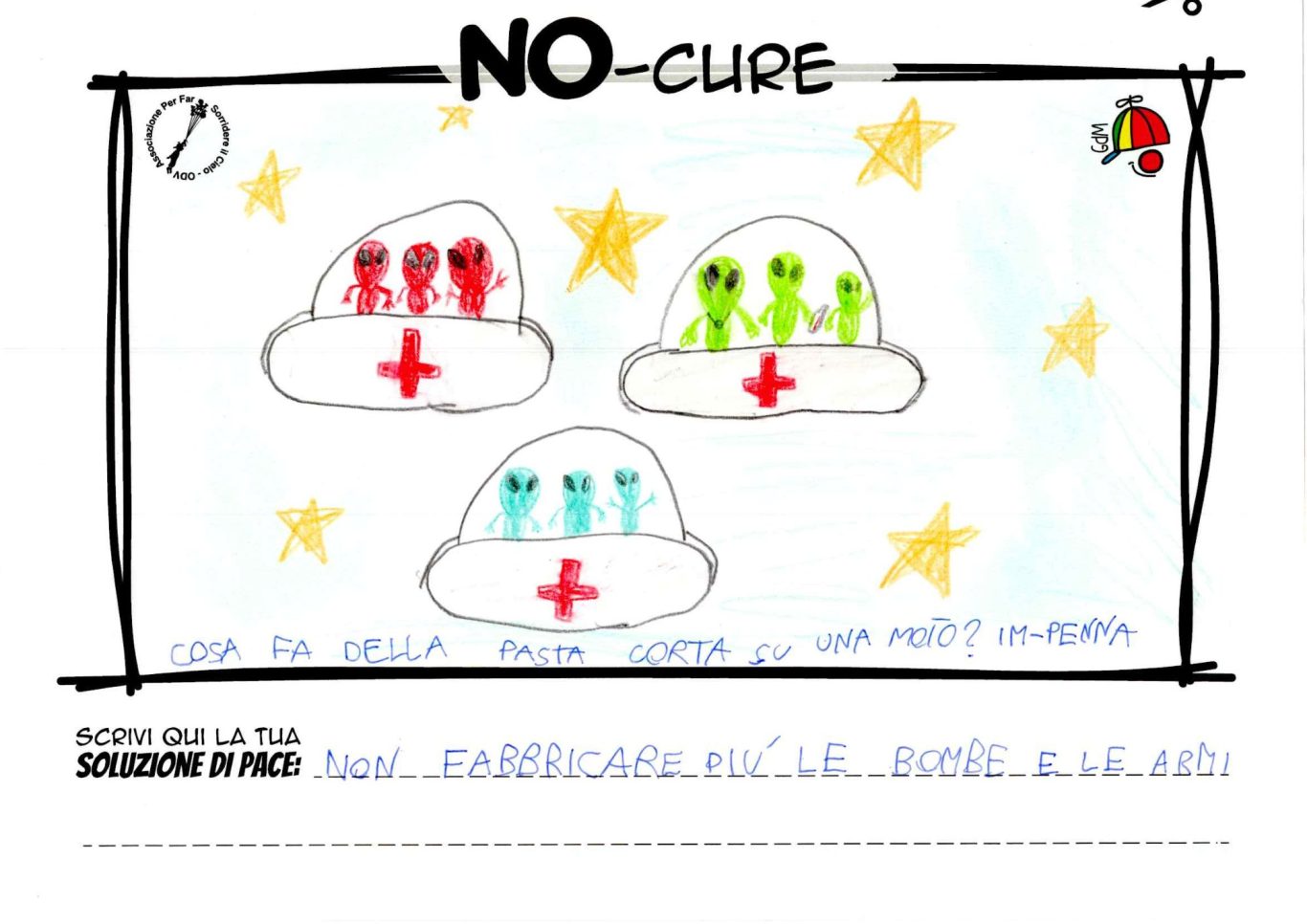 L’opera di sensibilizzazione si si esprime concretamente con la creazione di un DISEGNO DELLA MERAVIGLIA che andrà ad aiutare una delle 12 fatiche. Allo stesso modo chiederemo a tutti i partecipanti di andare a scrivere una “Soluzione di Pace” che possa aiutare anch’essa una delle 12 fatiche dei Bambini della guerra.