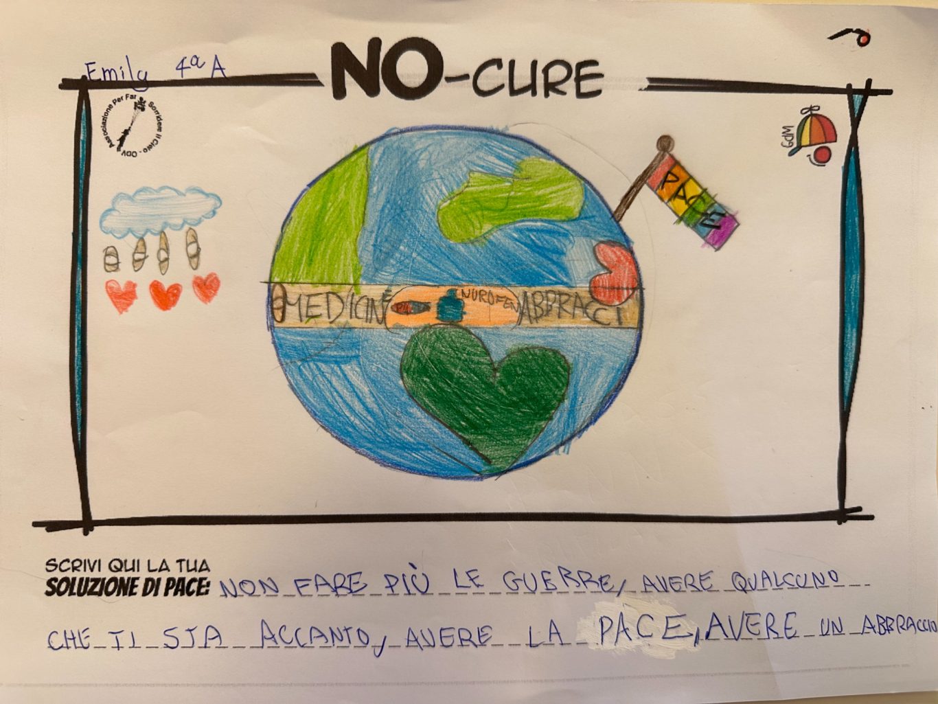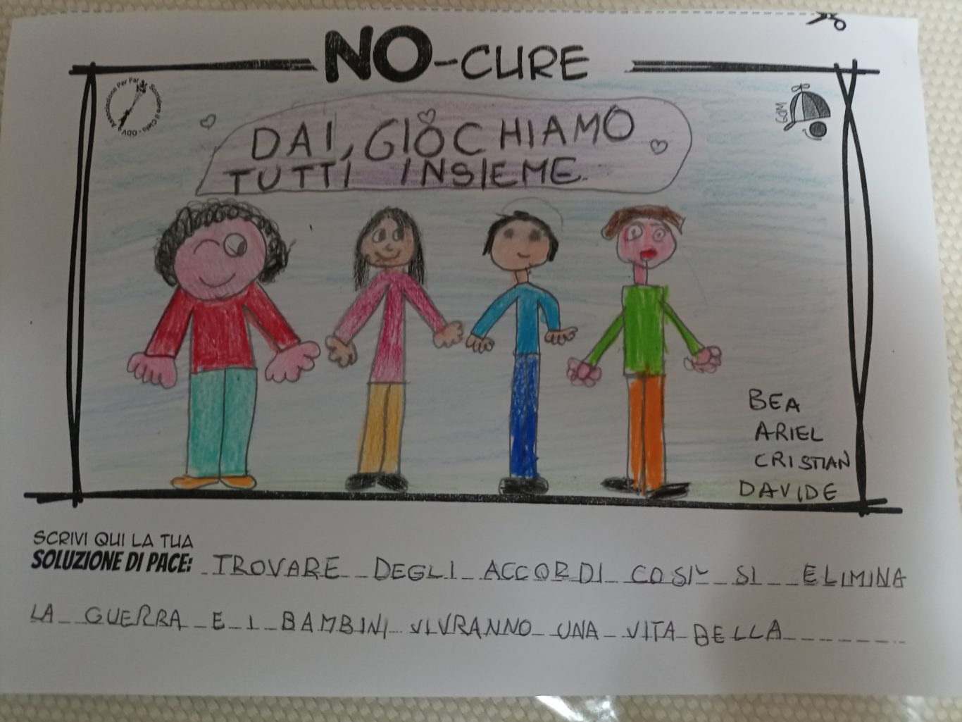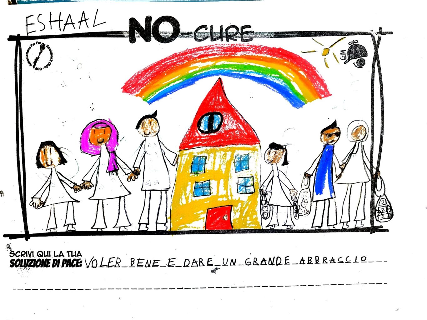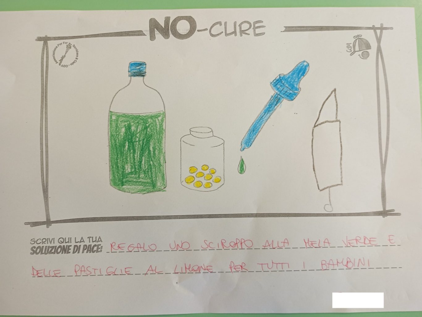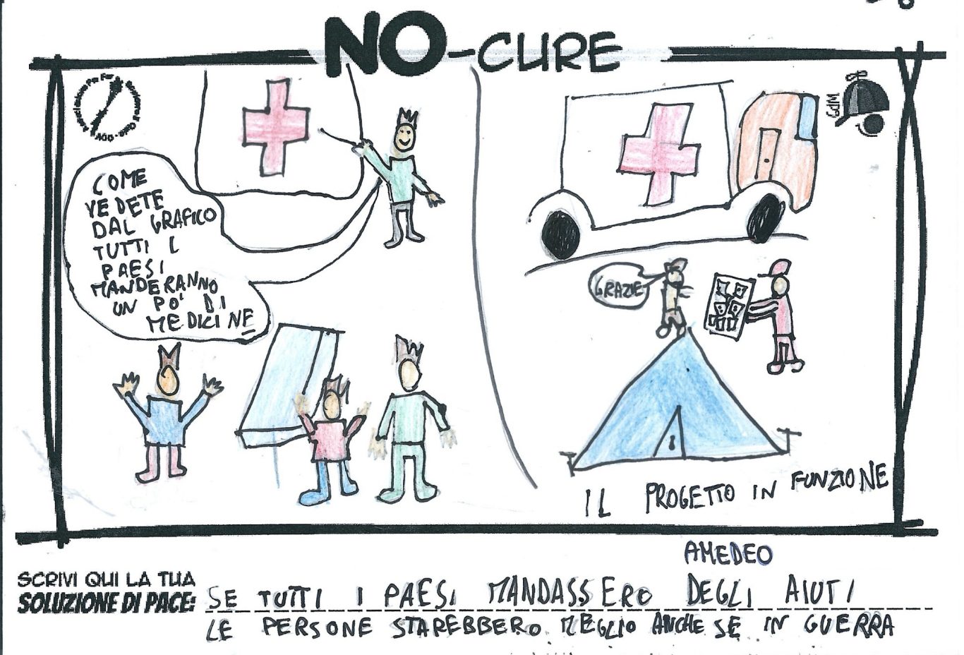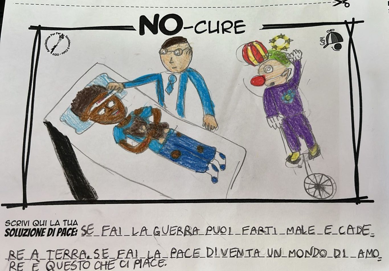 L’opera di sensibilizzazione si si esprime concretamente con la creazione di un DISEGNO DELLA MERAVIGLIA che andrà ad aiutare una delle 12 fatiche. Allo stesso modo chiederemo a tutti i partecipanti di andare a scrivere una “Soluzione di Pace” che possa aiutare anch’essa una delle 12 fatiche dei Bambini della guerra.