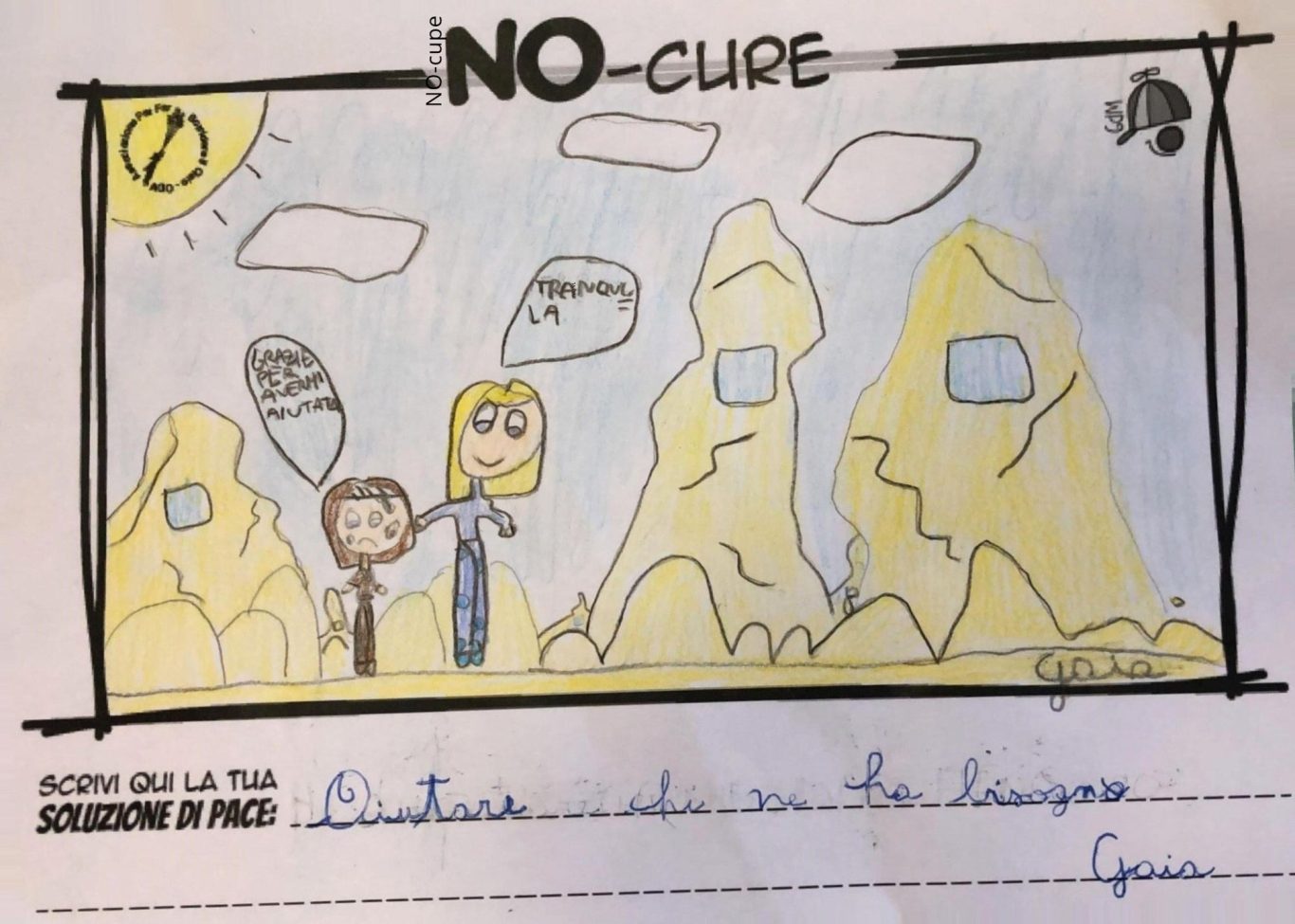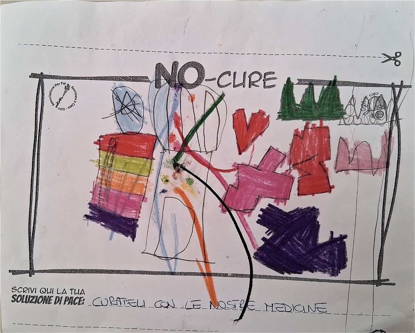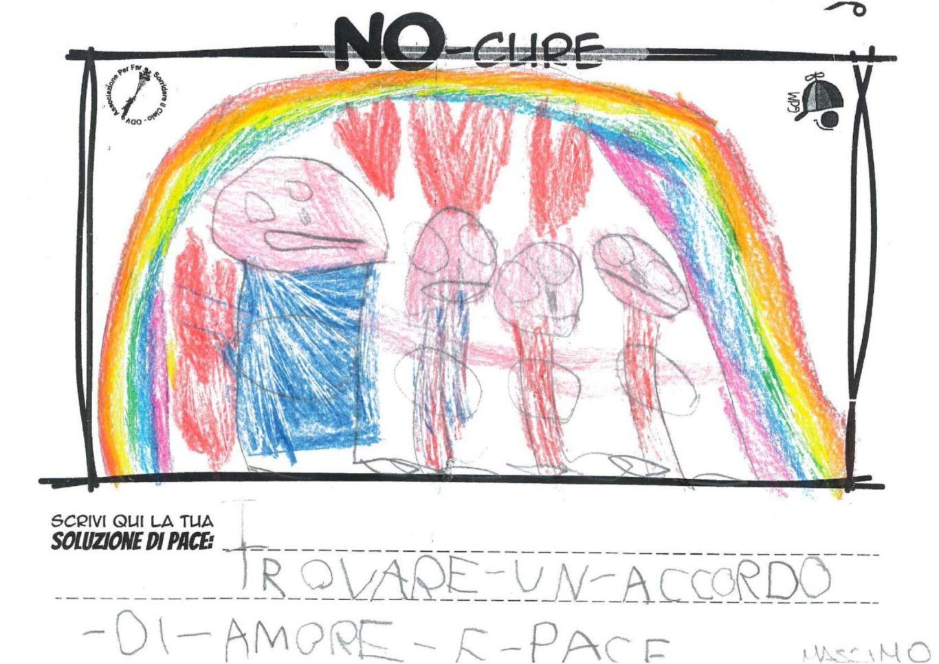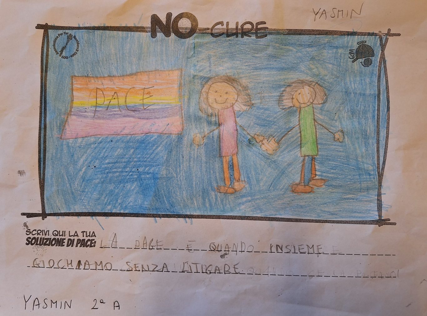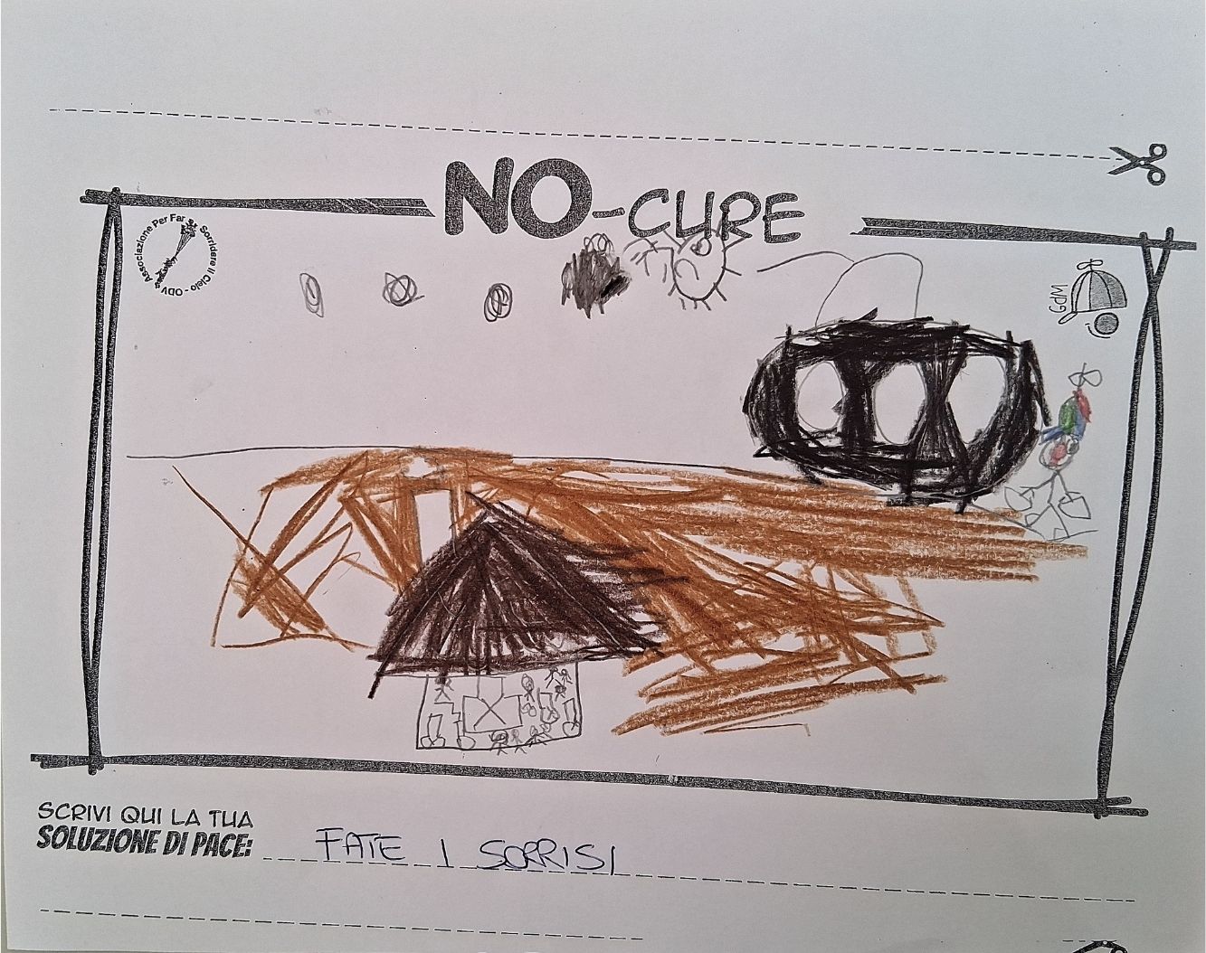 L’opera di sensibilizzazione si si esprime concretamente con la creazione di un DISEGNO DELLA MERAVIGLIA che andrà ad aiutare una delle 12 fatiche. Allo stesso modo chiederemo a tutti i partecipanti di andare a scrivere una “Soluzione di Pace” che possa aiutare anch’essa una delle 12 fatiche dei Bambini della guerra.