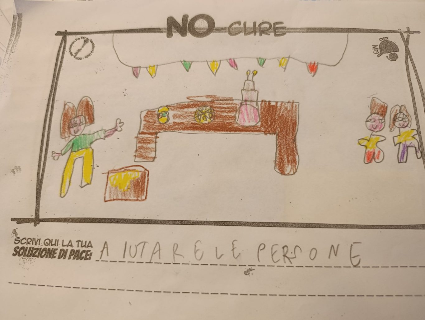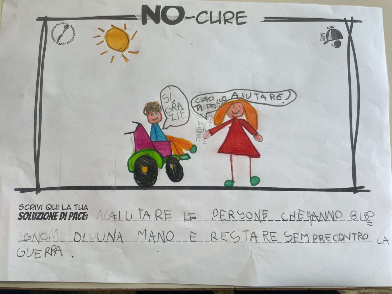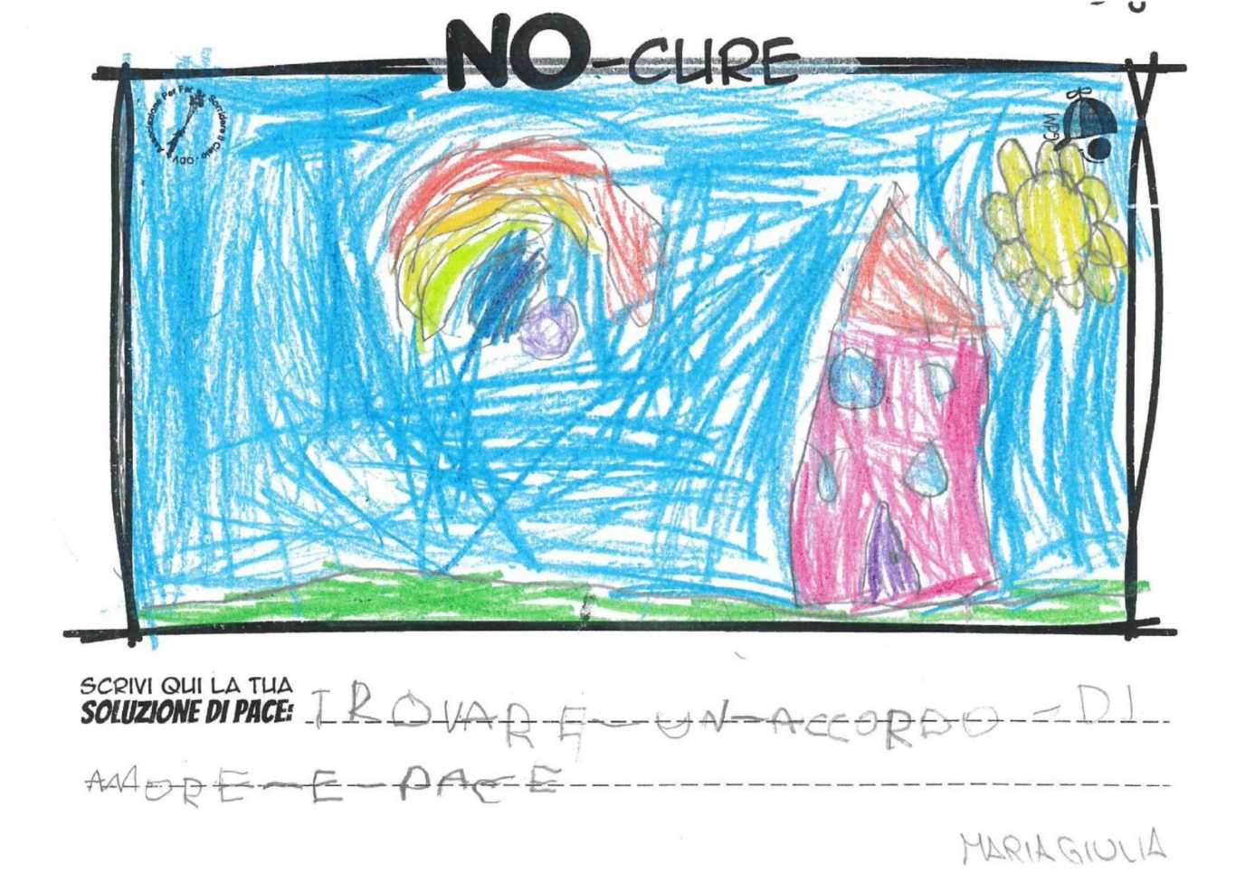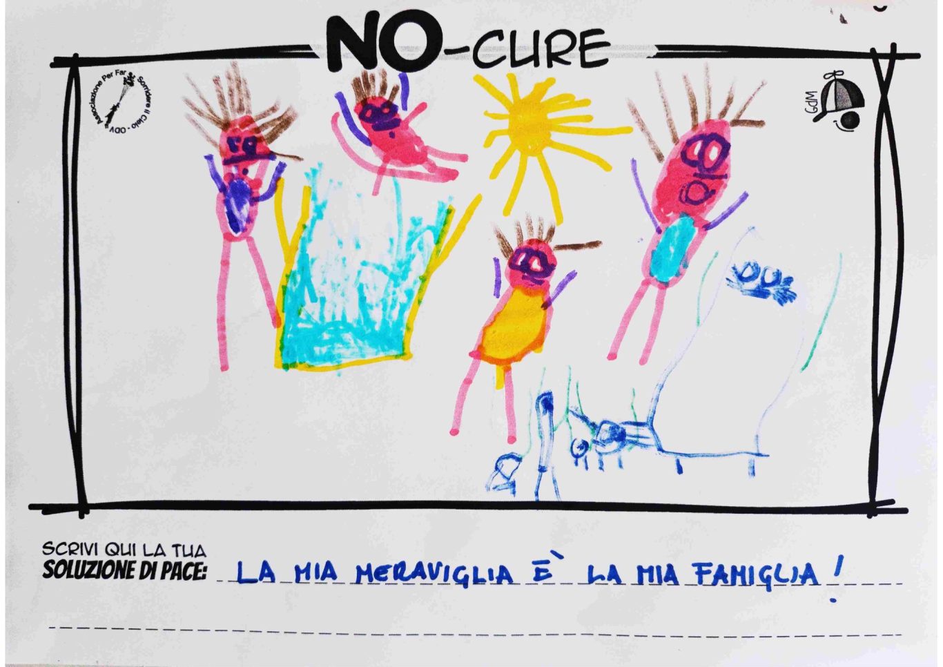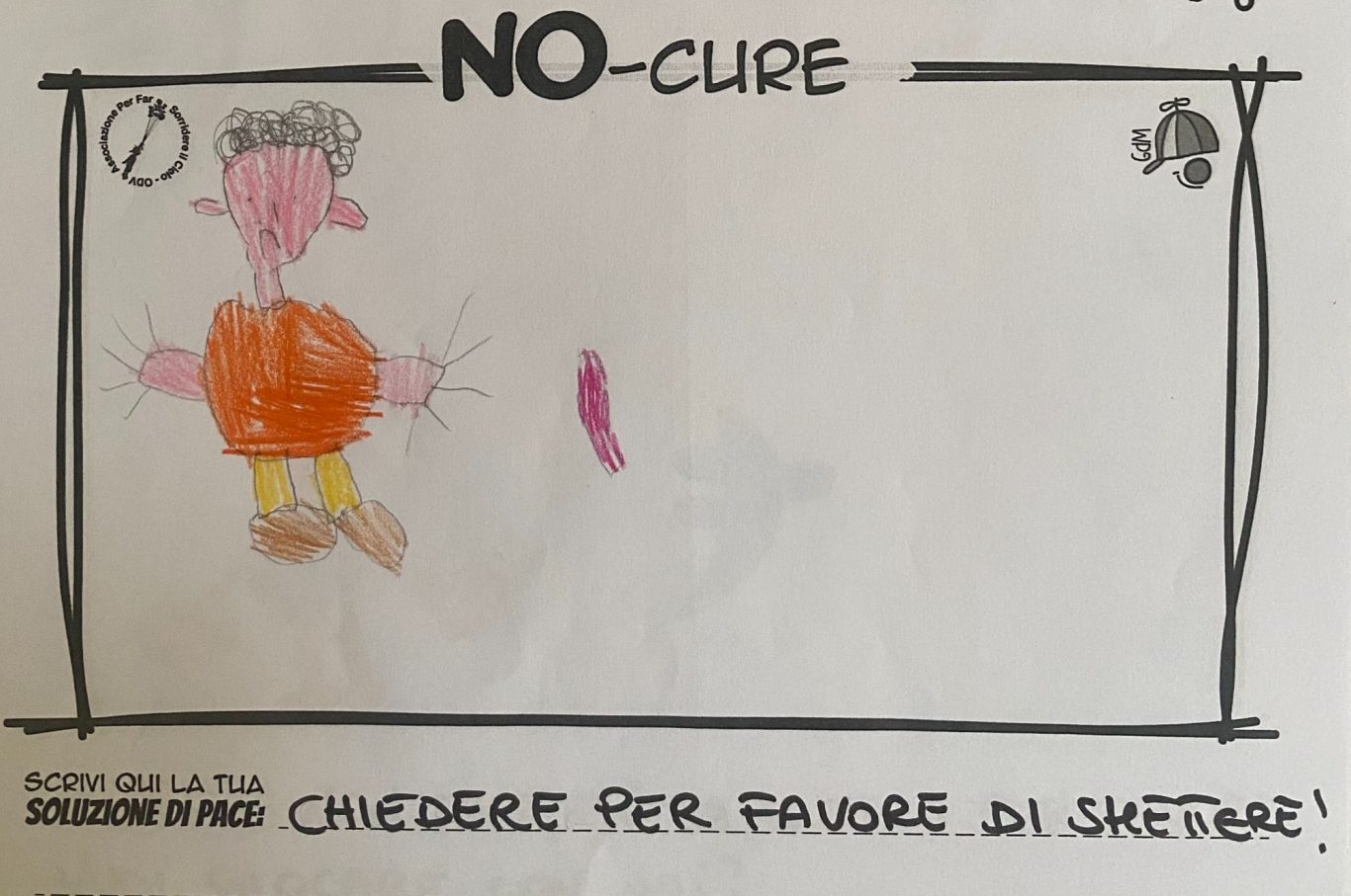 L’opera di sensibilizzazione si si esprime concretamente con la creazione di un DISEGNO DELLA MERAVIGLIA che andrà ad aiutare una delle 12 fatiche. Allo stesso modo chiederemo a tutti i partecipanti di andare a scrivere una “Soluzione di Pace” che possa aiutare anch’essa una delle 12 fatiche dei Bambini della guerra.