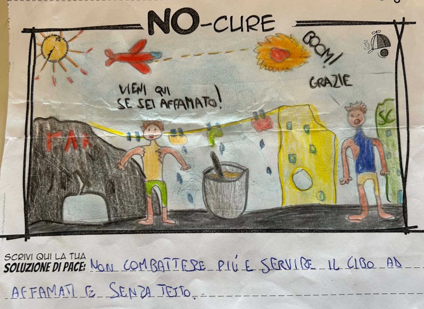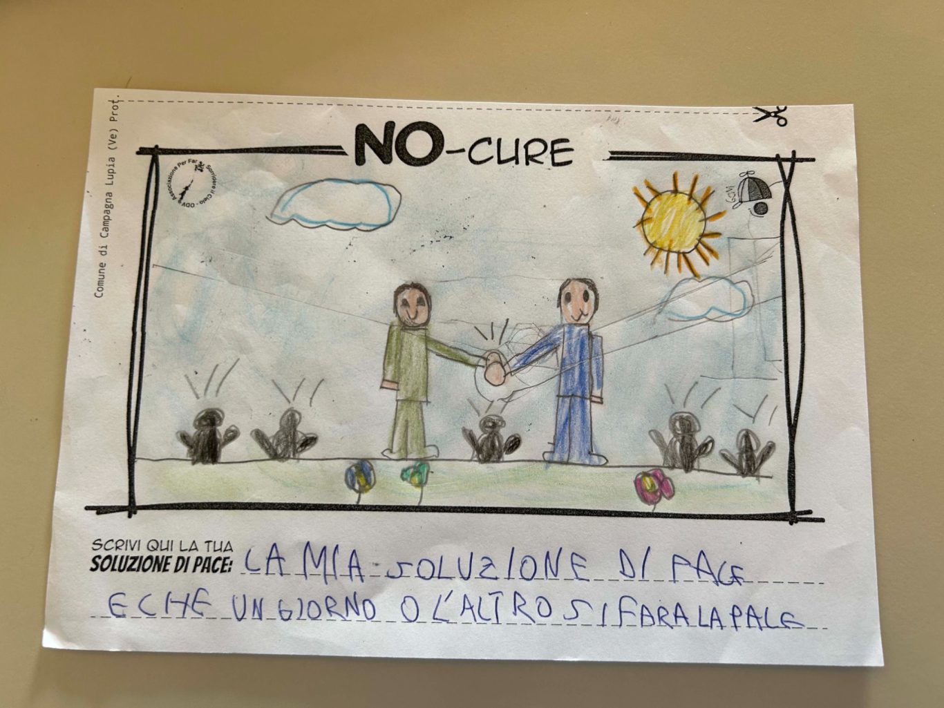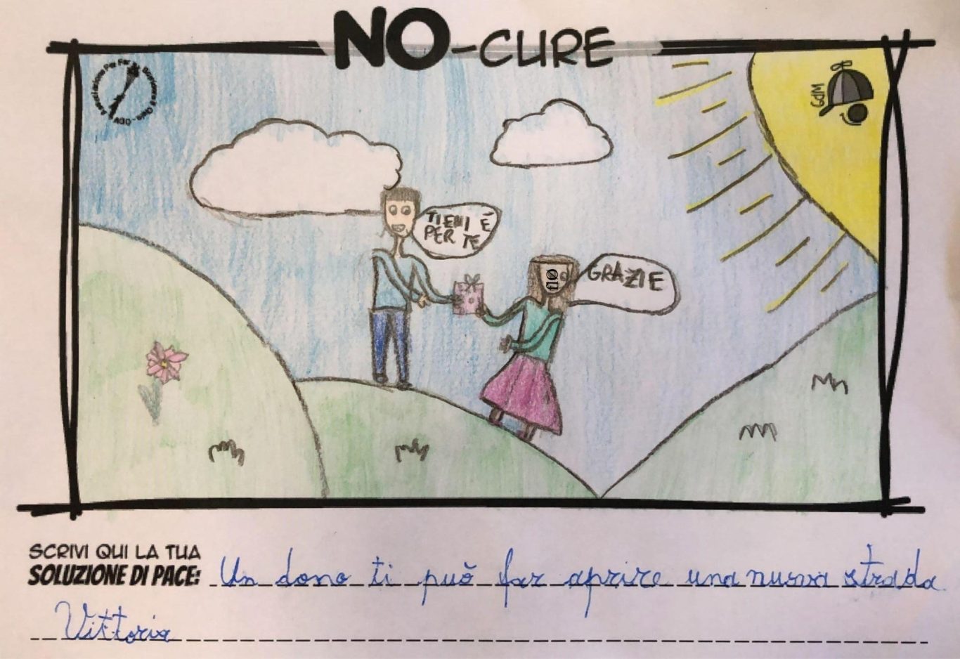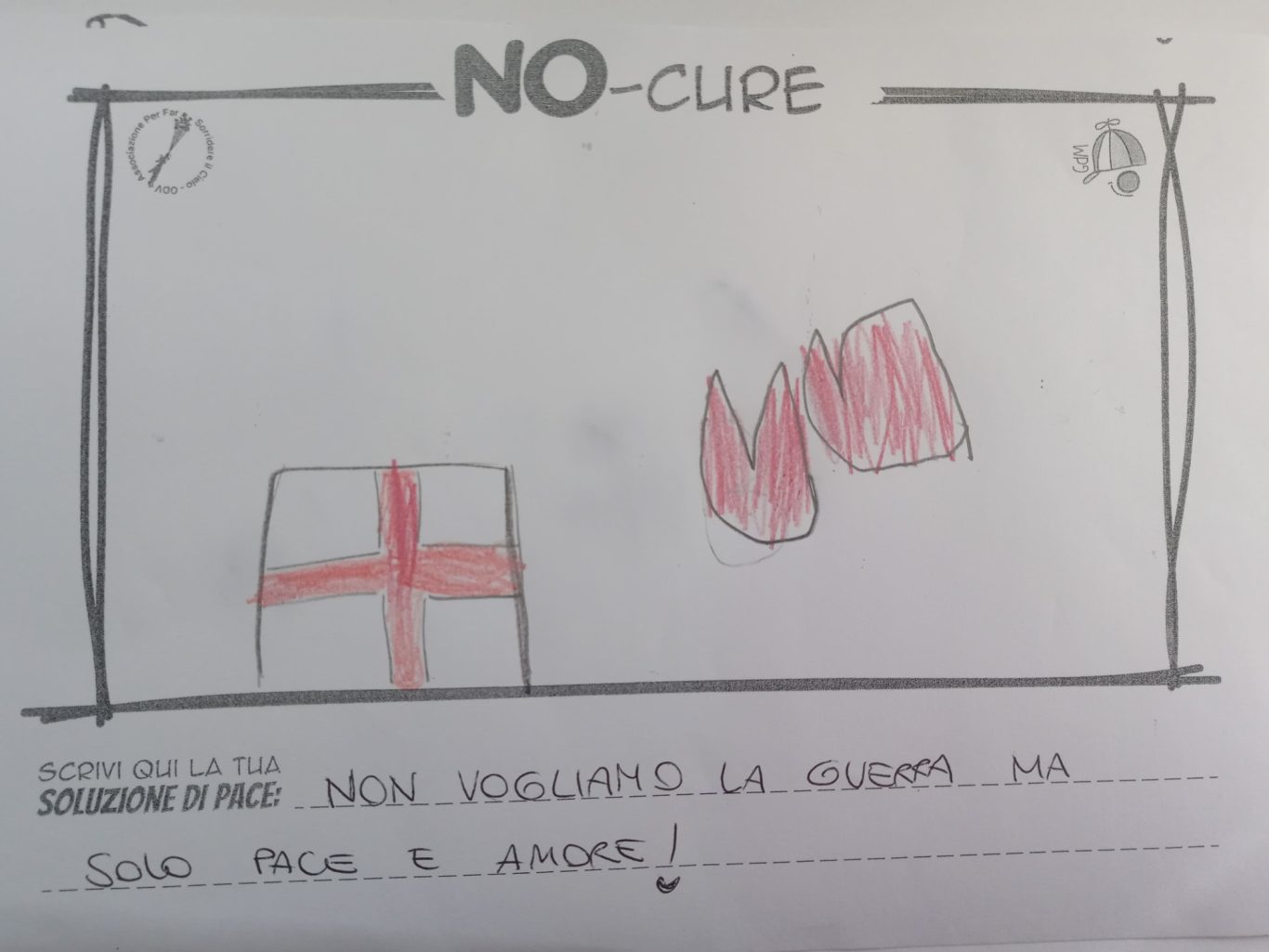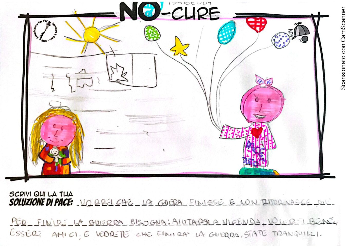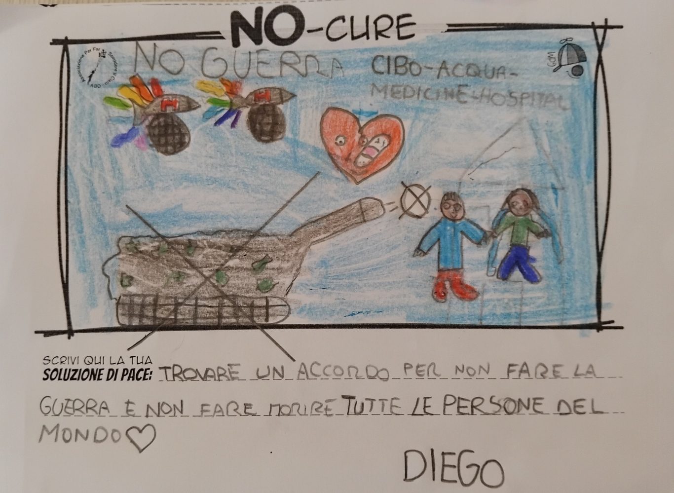 L’opera di sensibilizzazione si si esprime concretamente con la creazione di un DISEGNO DELLA MERAVIGLIA che andrà ad aiutare una delle 12 fatiche. Allo stesso modo chiederemo a tutti i partecipanti di andare a scrivere una “Soluzione di Pace” che possa aiutare anch’essa una delle 12 fatiche dei Bambini della guerra.