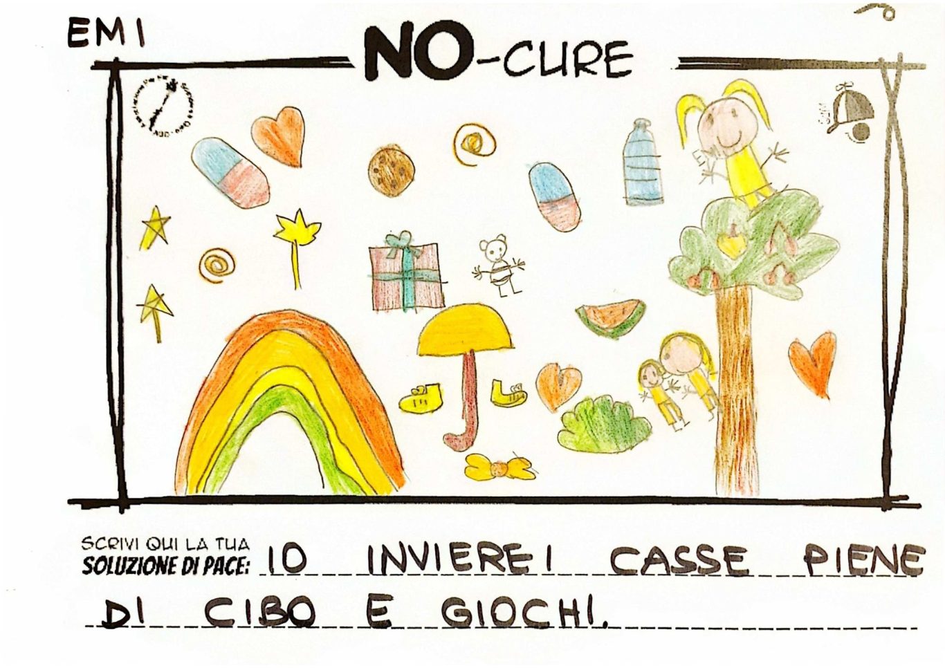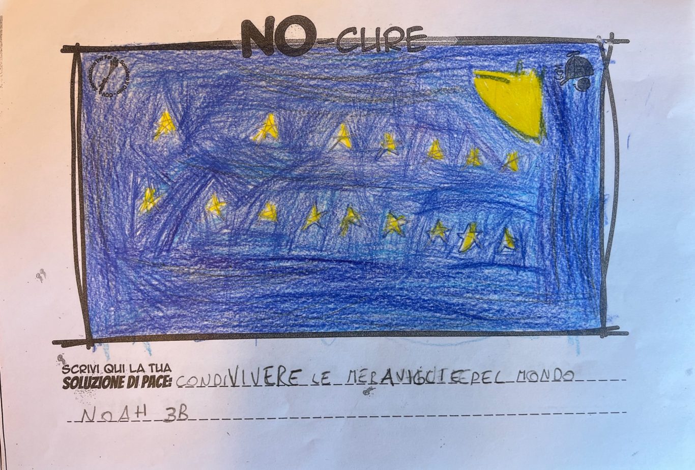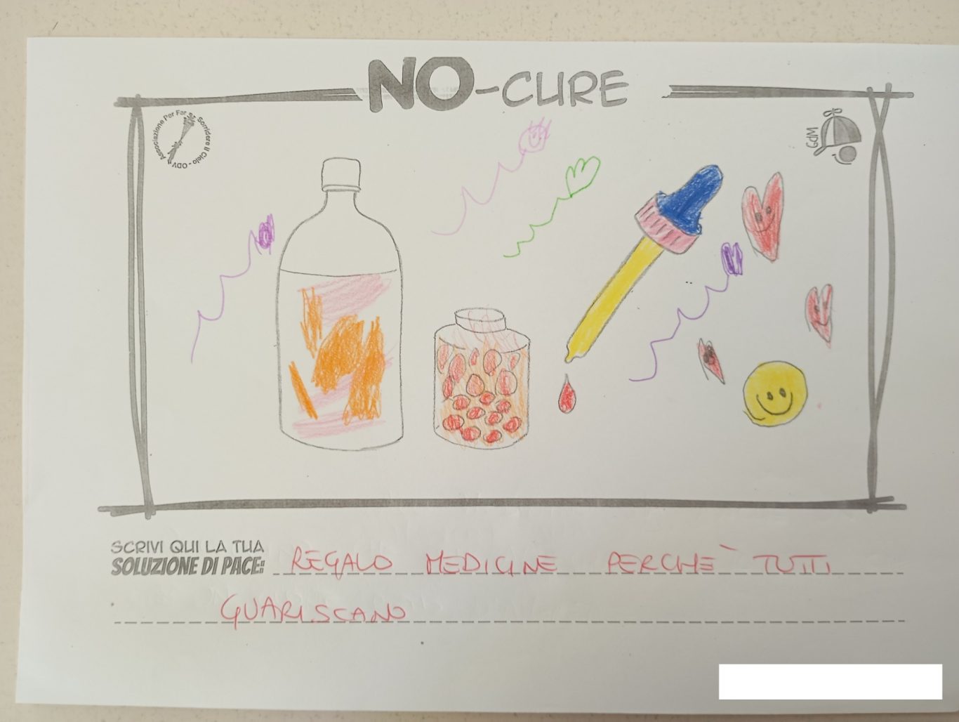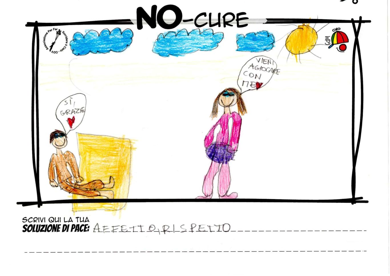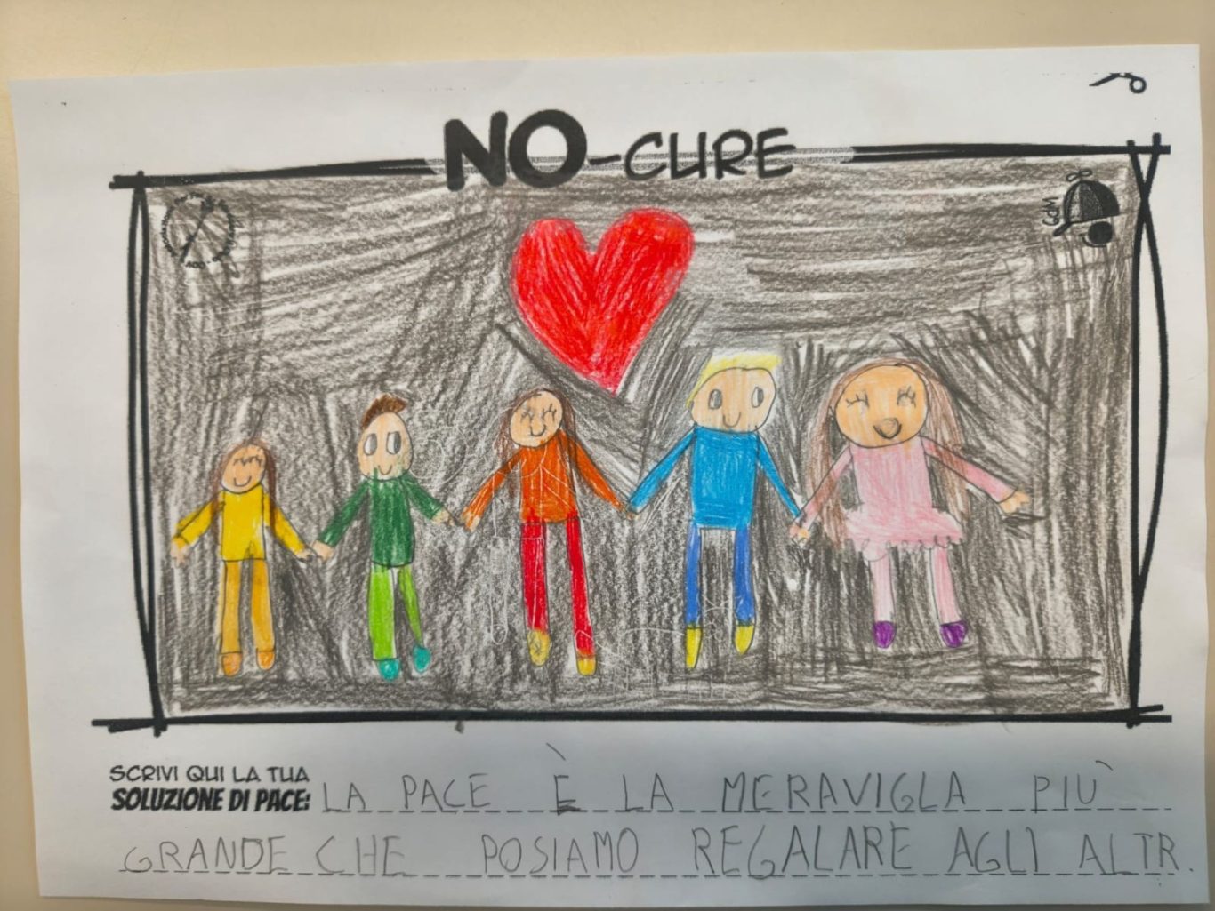 L’opera di sensibilizzazione si si esprime concretamente con la creazione di un DISEGNO DELLA MERAVIGLIA che andrà ad aiutare una delle 12 fatiche. Allo stesso modo chiederemo a tutti i partecipanti di andare a scrivere una “Soluzione di Pace” che possa aiutare anch’essa una delle 12 fatiche dei Bambini della guerra.