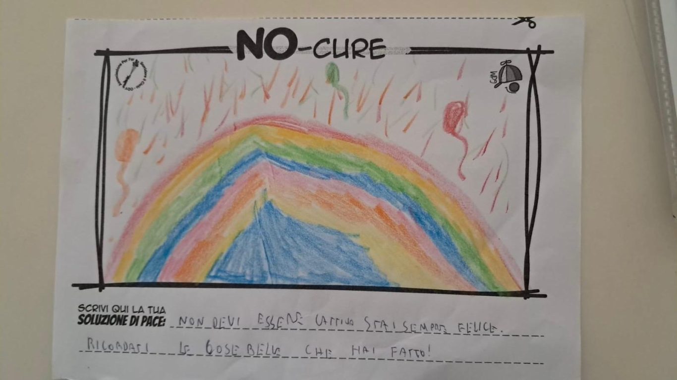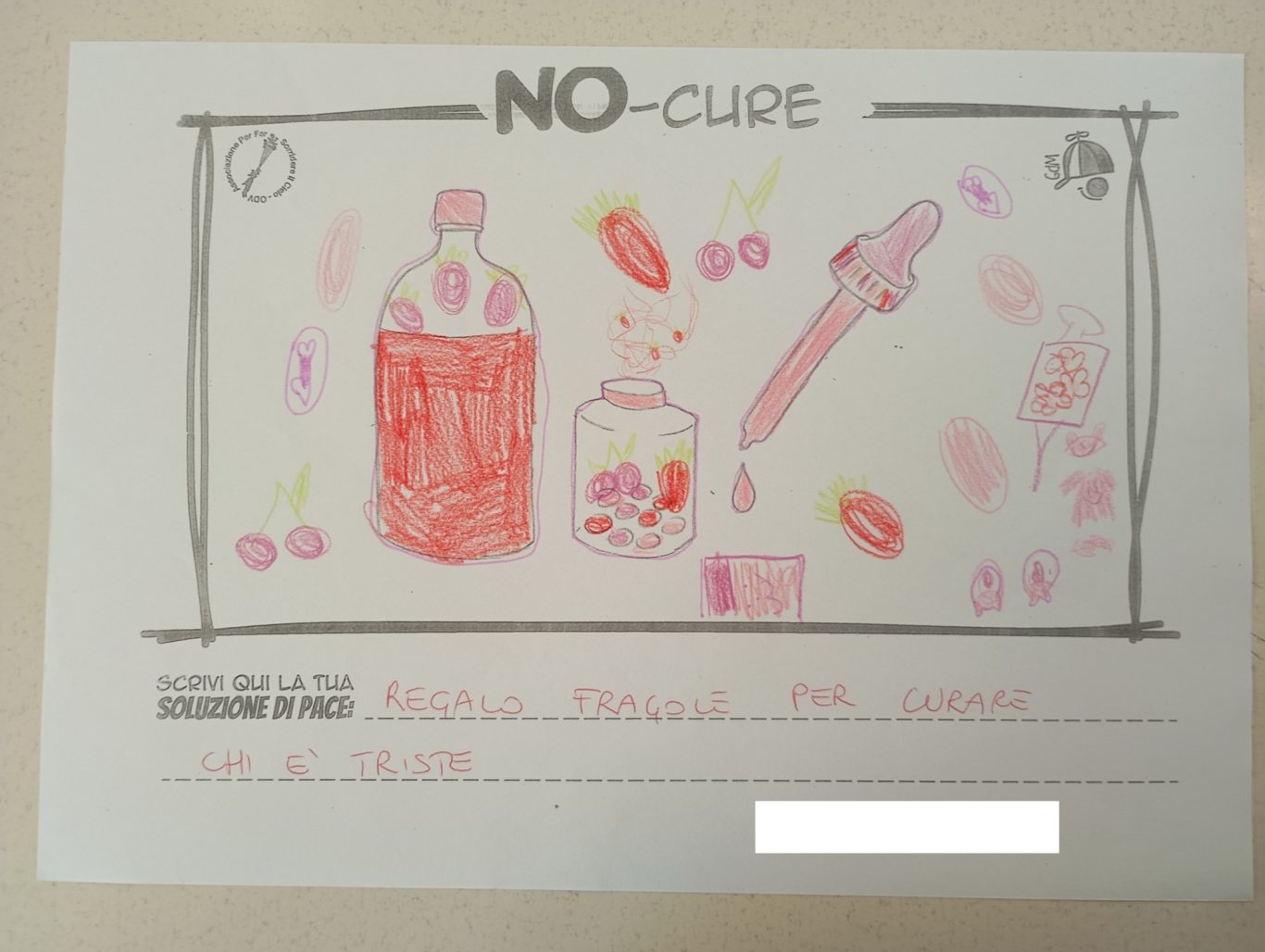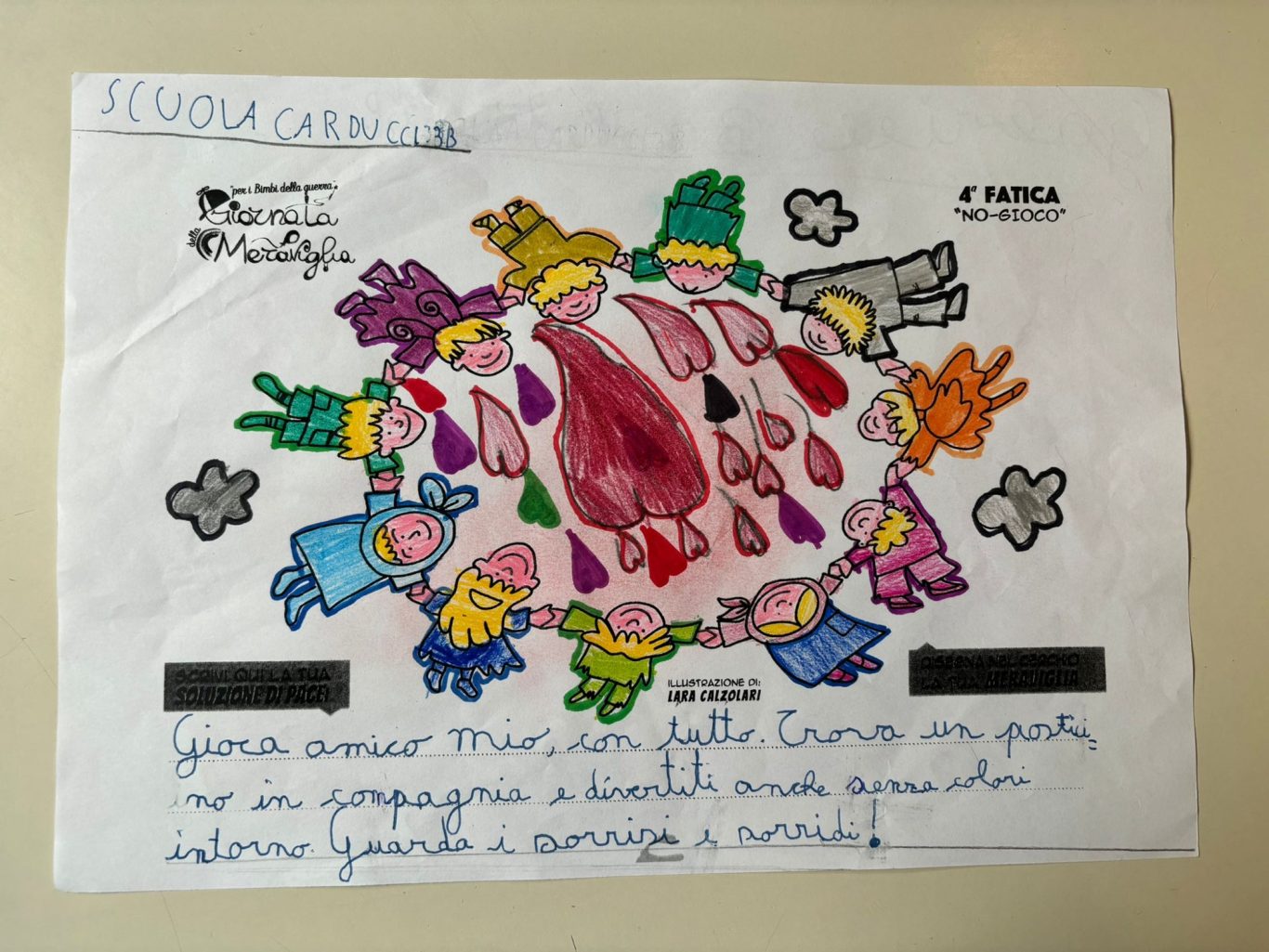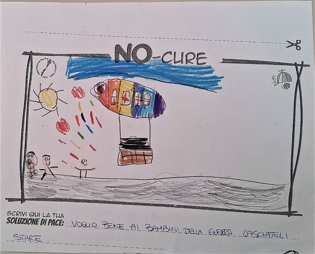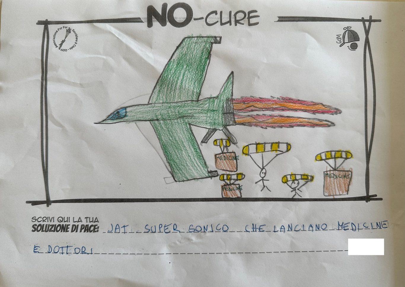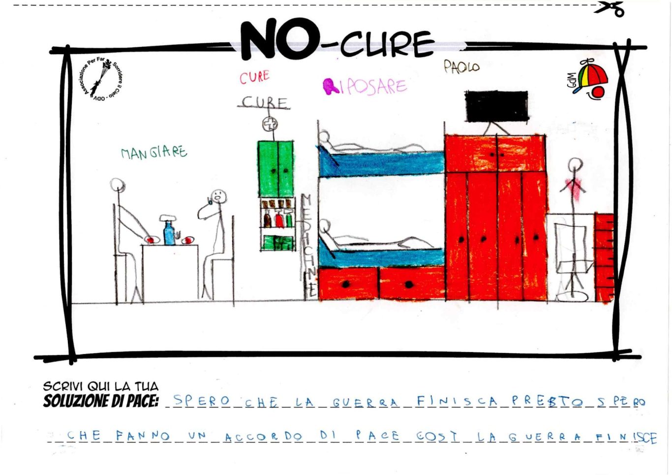 L’opera di sensibilizzazione si si esprime concretamente con la creazione di un DISEGNO DELLA MERAVIGLIA che andrà ad aiutare una delle 12 fatiche. Allo stesso modo chiederemo a tutti i partecipanti di andare a scrivere una “Soluzione di Pace” che possa aiutare anch’essa una delle 12 fatiche dei Bambini della guerra.