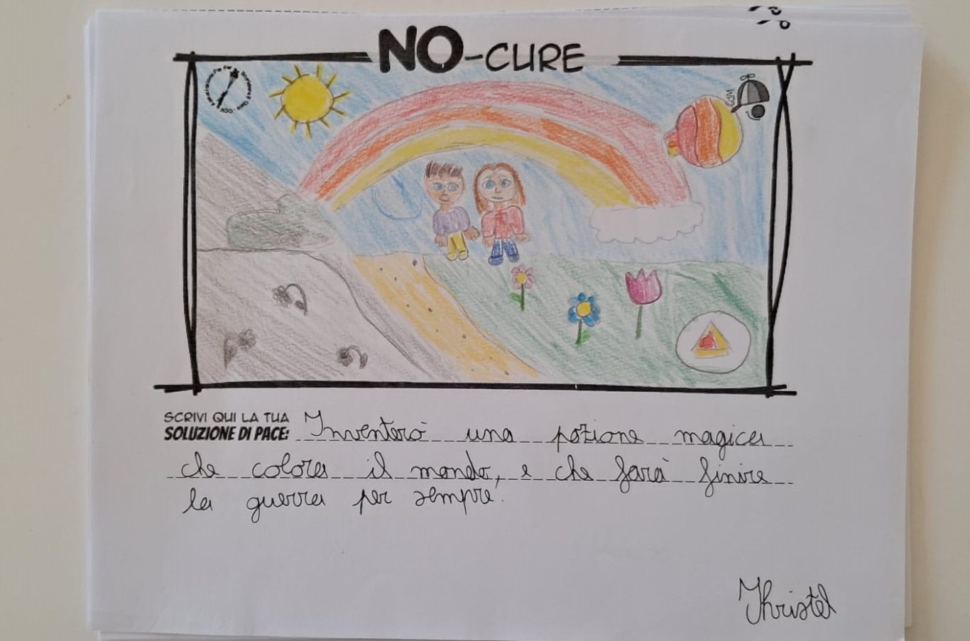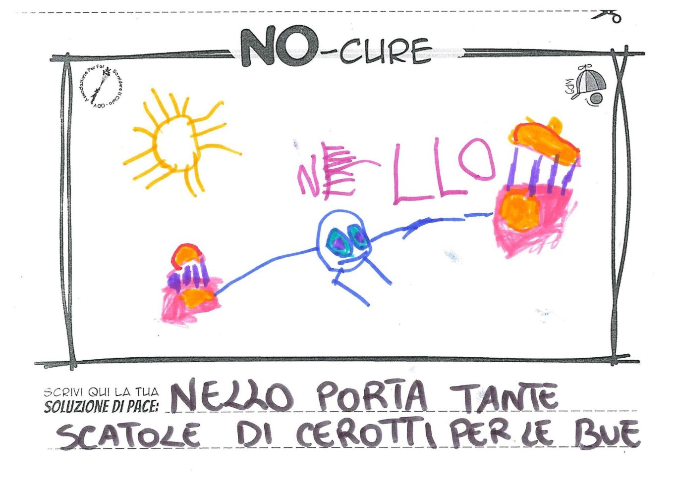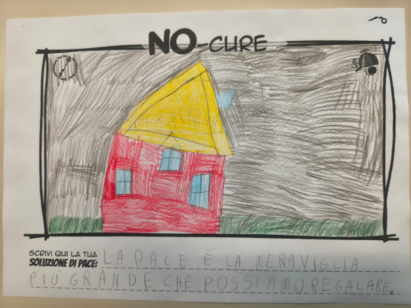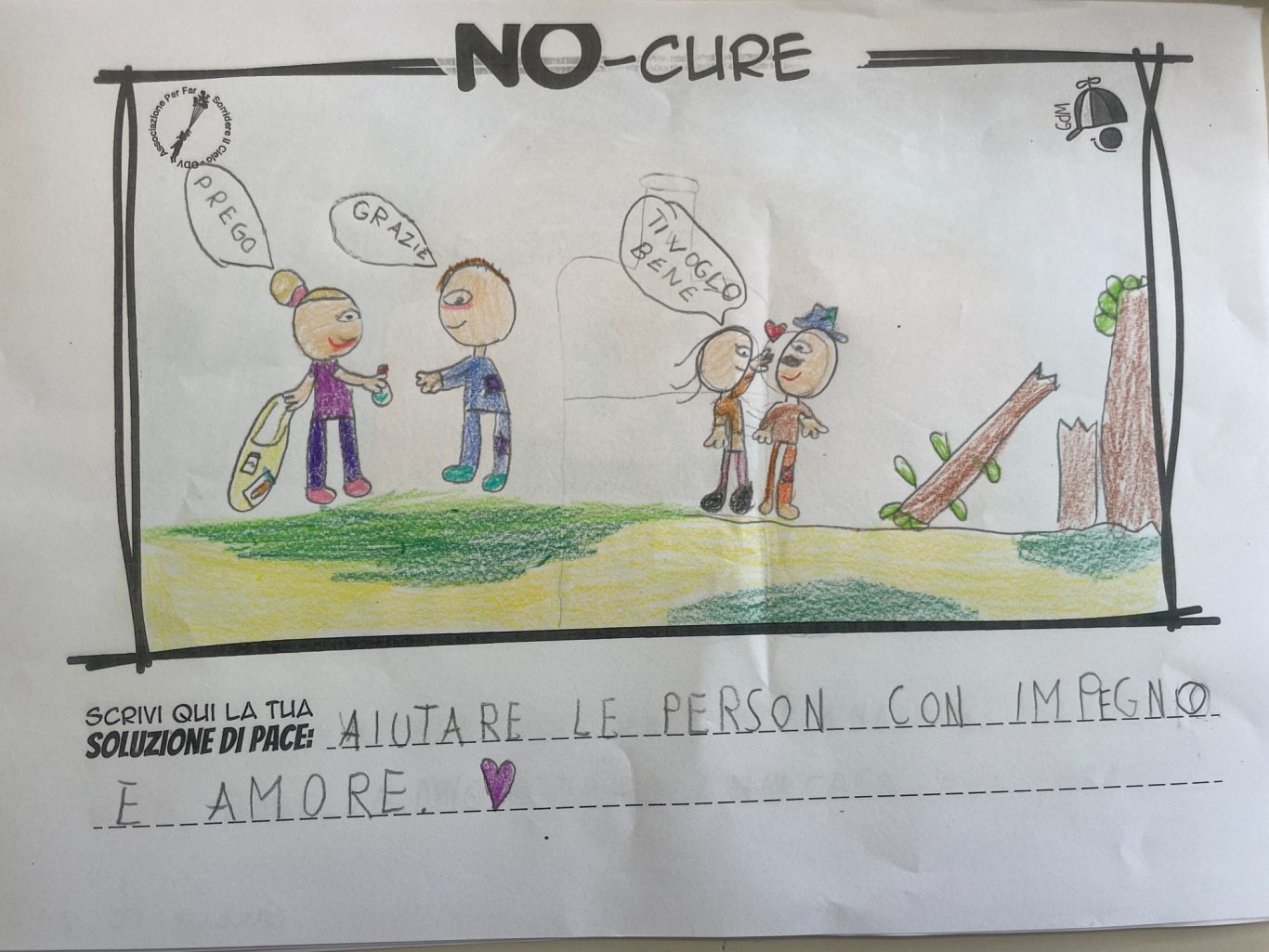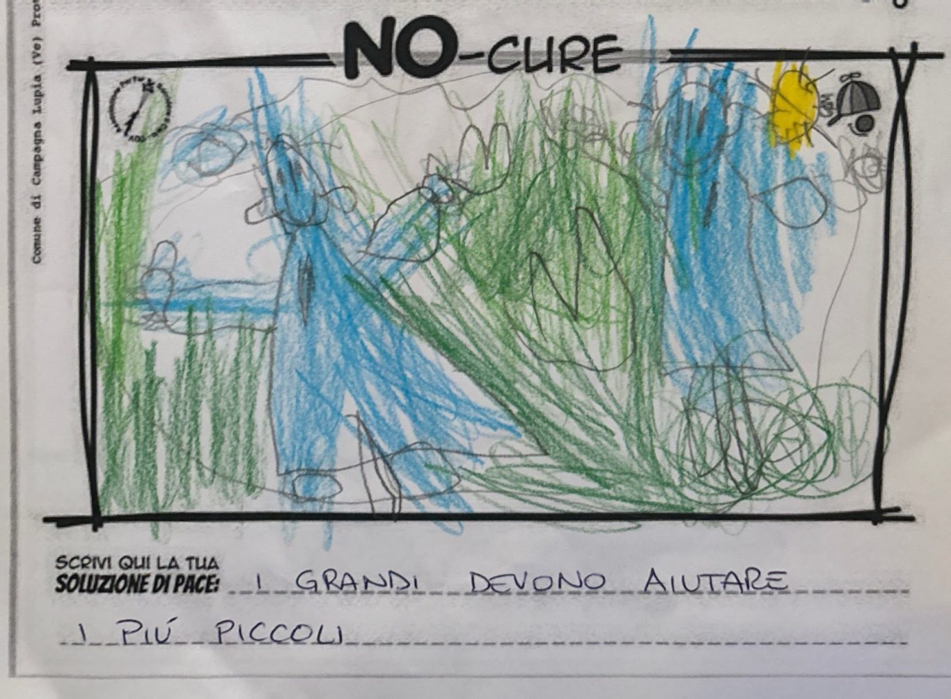 L’opera di sensibilizzazione si si esprime concretamente con la creazione di un DISEGNO DELLA MERAVIGLIA che andrà ad aiutare una delle 12 fatiche. Allo stesso modo chiederemo a tutti i partecipanti di andare a scrivere una “Soluzione di Pace” che possa aiutare anch’essa una delle 12 fatiche dei Bambini della guerra.