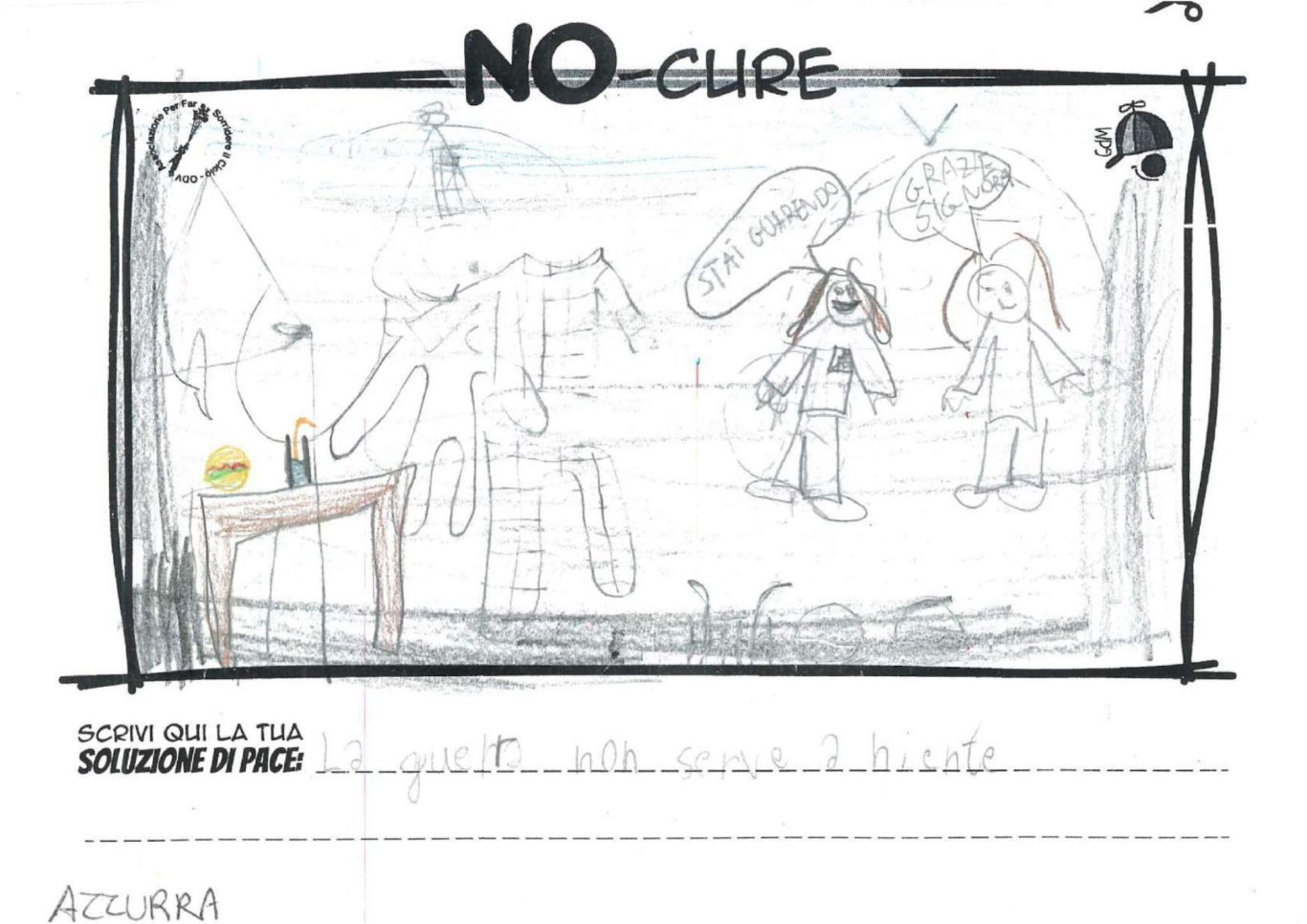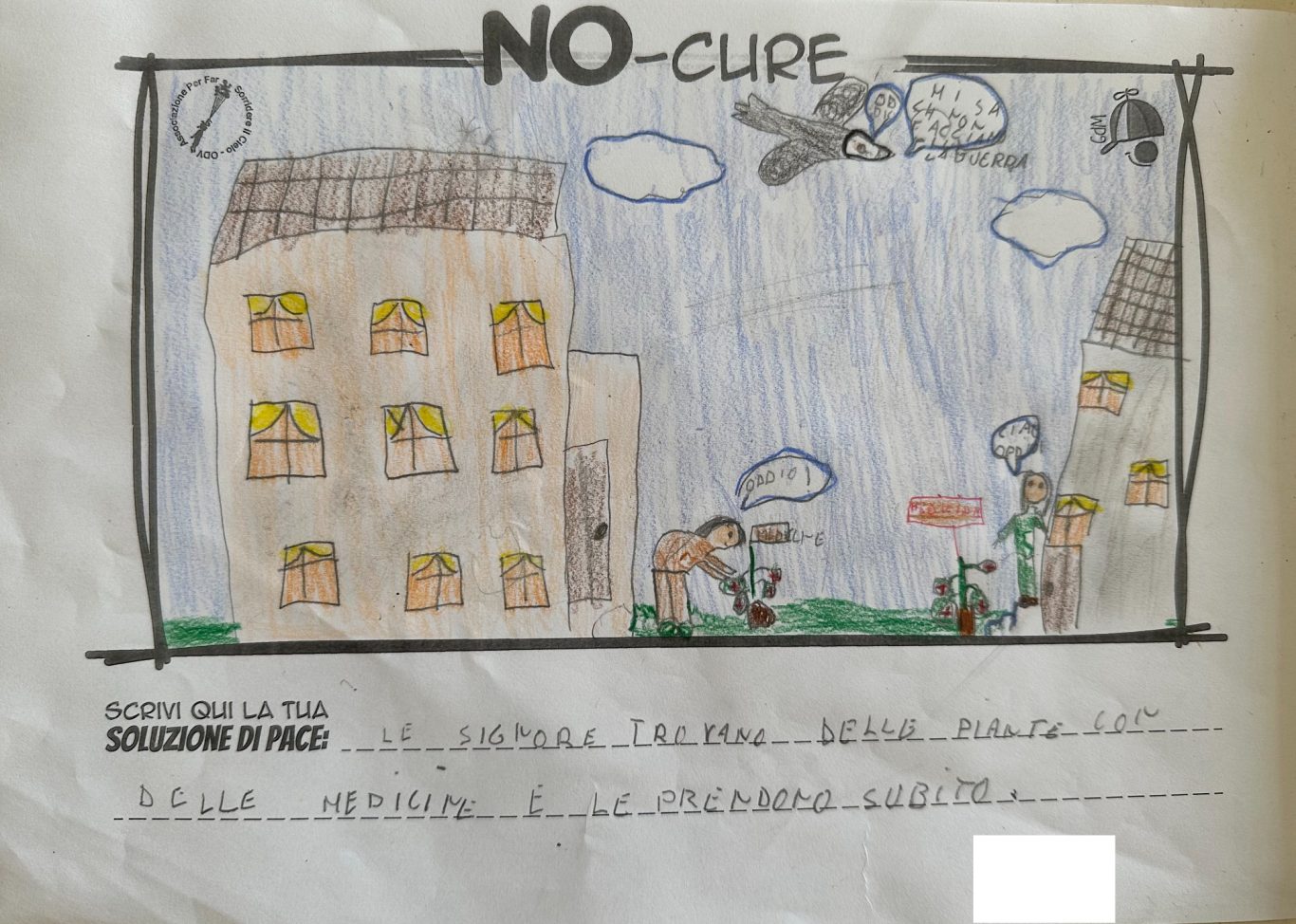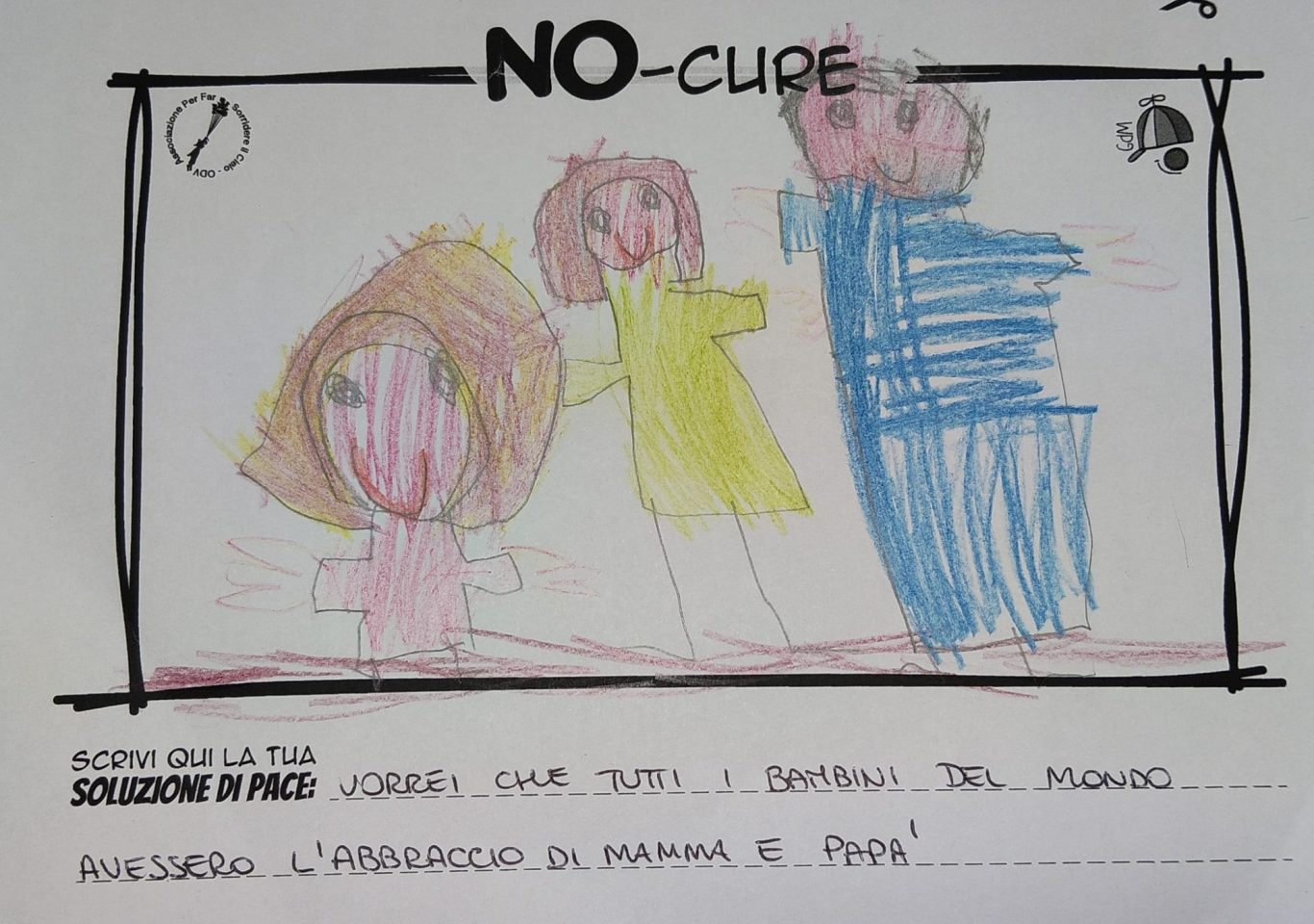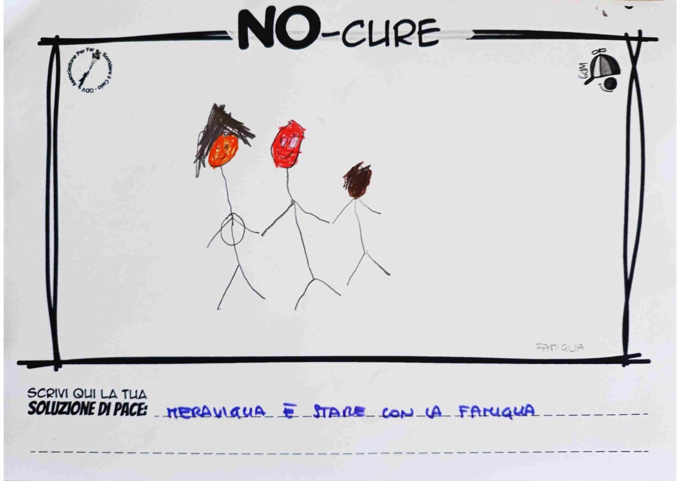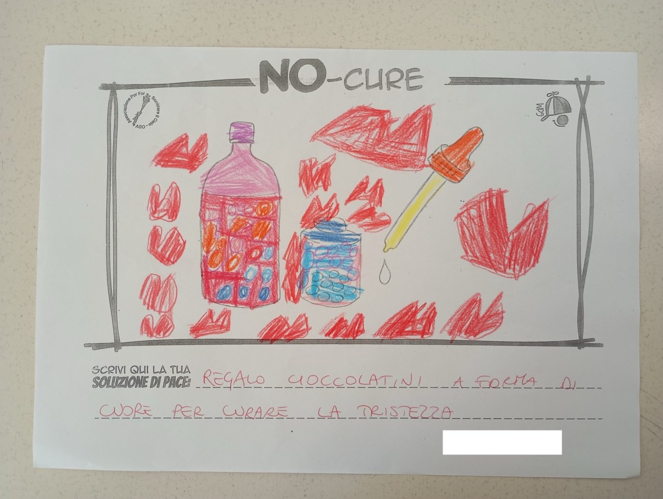L’opera di sensibilizzazione si si esprime concretamente con la creazione di un DISEGNO DELLA MERAVIGLIA che andrà ad aiutare una delle 12 fatiche. Allo stesso modo chiederemo a tutti i partecipanti di andare a scrivere una “Soluzione di Pace” che possa aiutare anch’essa una delle 12 fatiche dei Bambini della guerra.