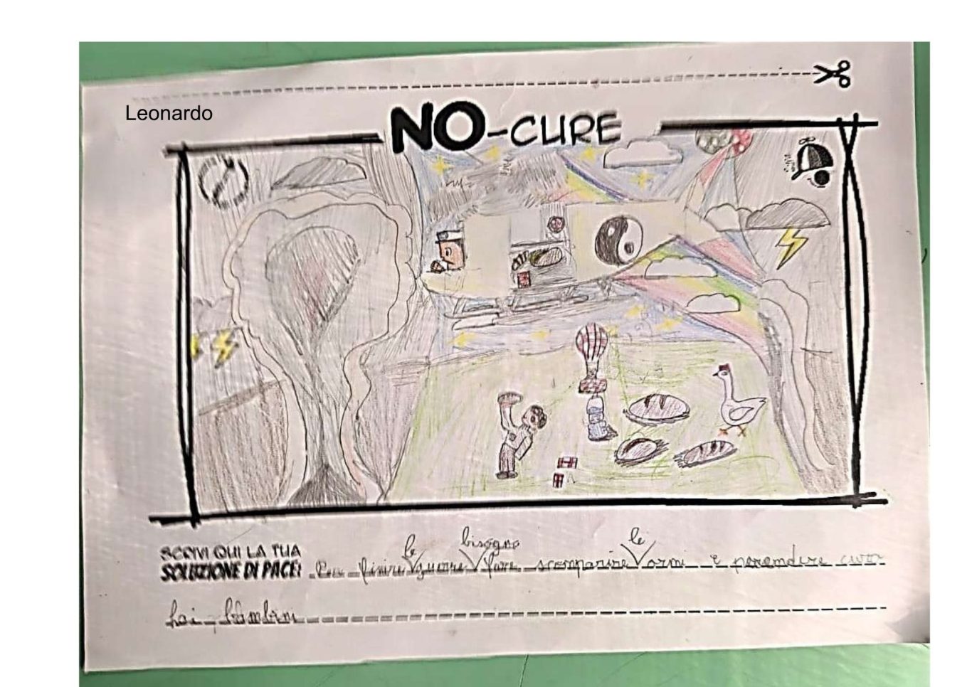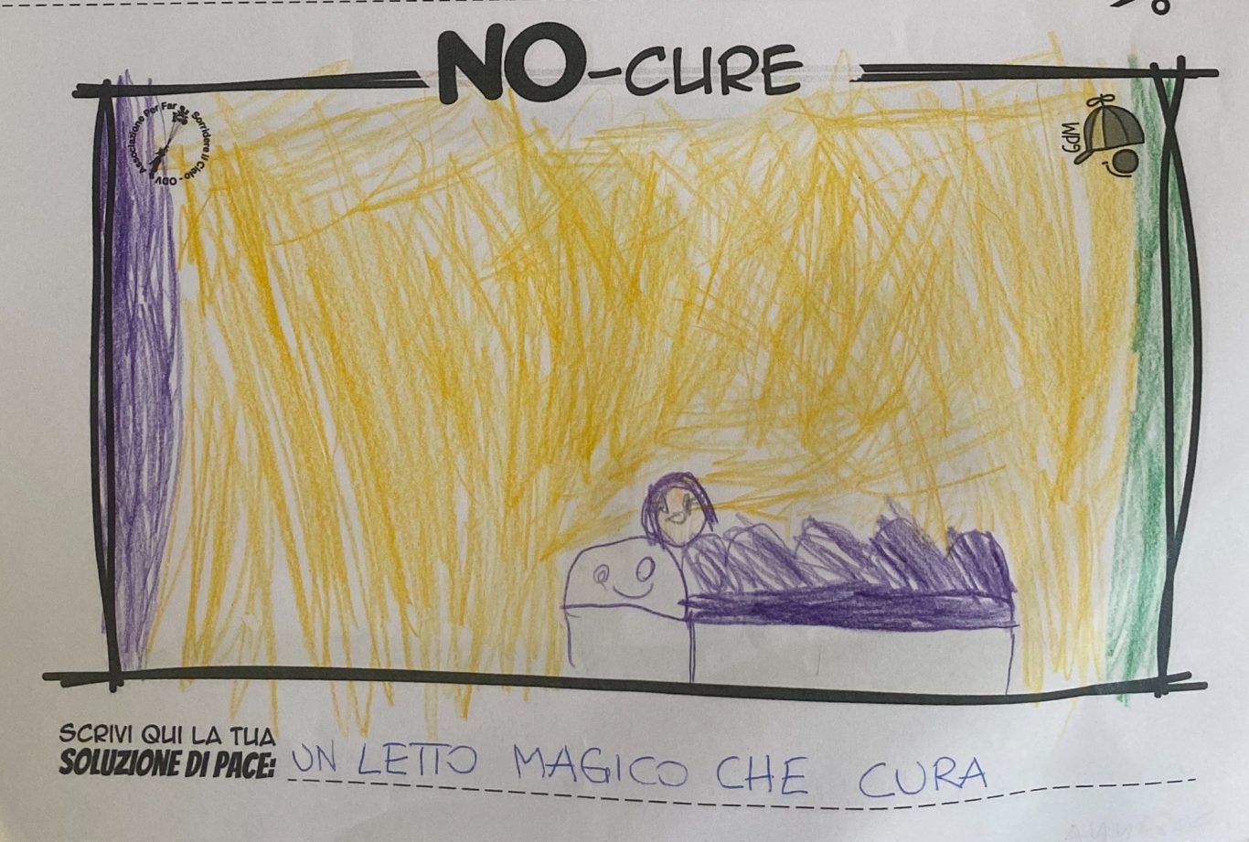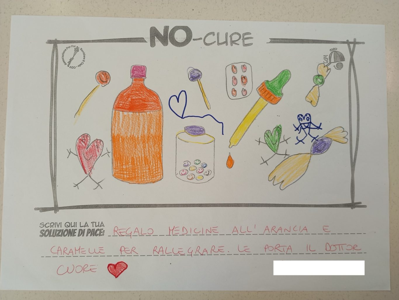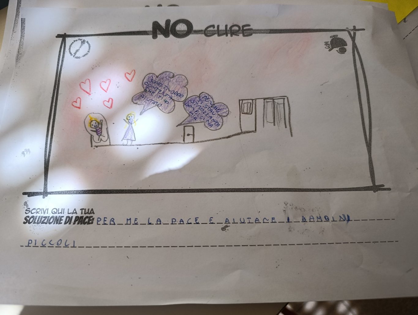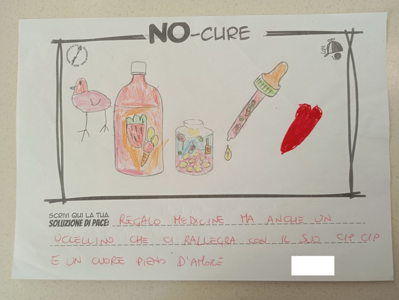 L’opera di sensibilizzazione si si esprime concretamente con la creazione di un DISEGNO DELLA MERAVIGLIA che andrà ad aiutare una delle 12 fatiche. Allo stesso modo chiederemo a tutti i partecipanti di andare a scrivere una “Soluzione di Pace” che possa aiutare anch’essa una delle 12 fatiche dei Bambini della guerra.