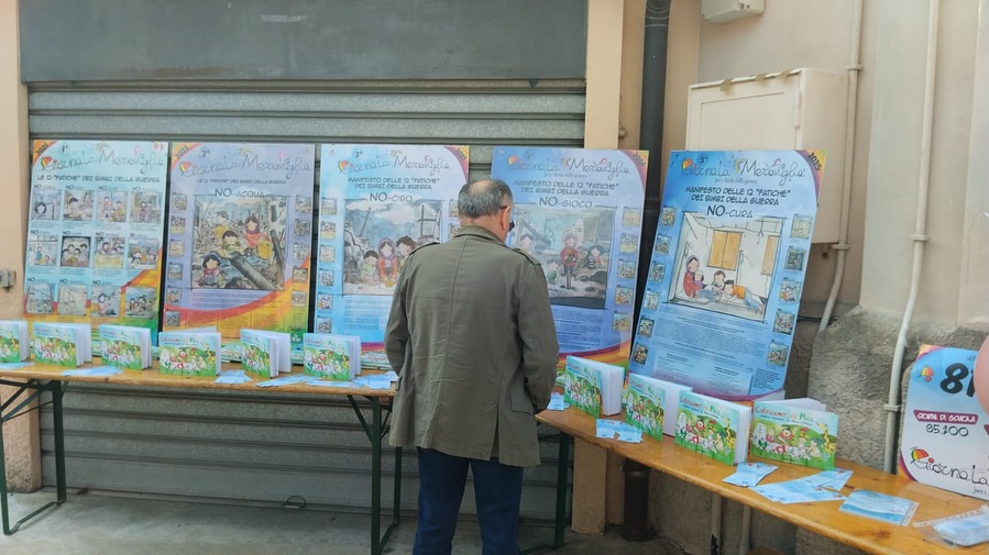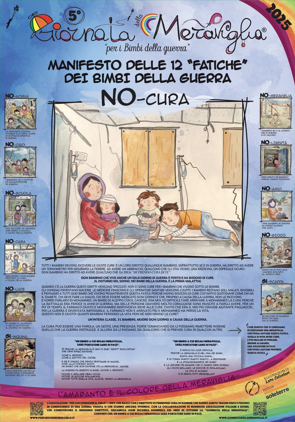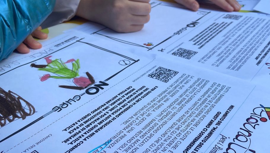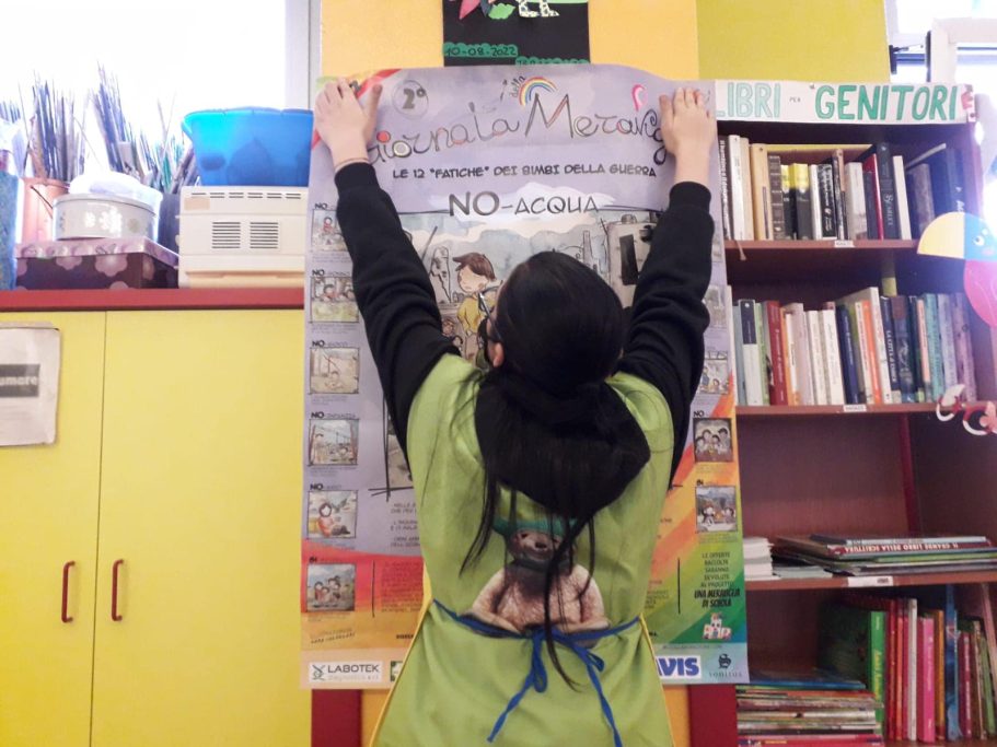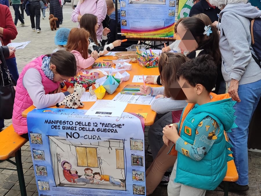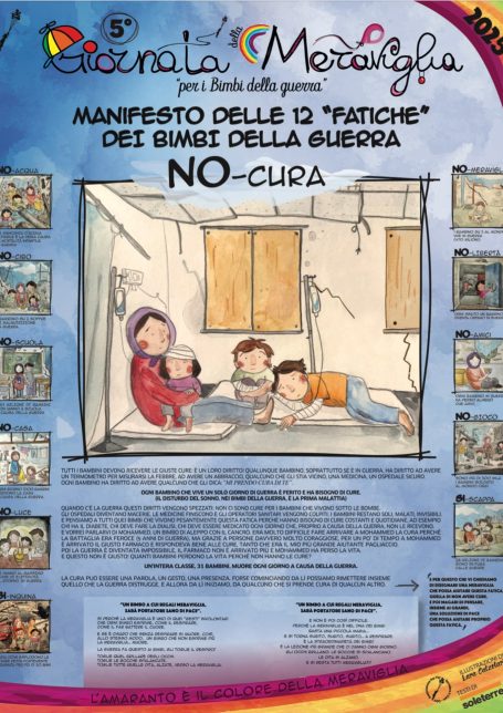 Il Manifesto delle 12 Fatiche dei Bimbi della guerra è lo “strumento” che utilizziamo, specialmente in Italia, per sensibilizzare tutti i partecipanti alle giornate, in particolar modo i bambini, sulle fatiche che vivono Bimbi e Bimbe (420 MILIONI) a causa della guerra.